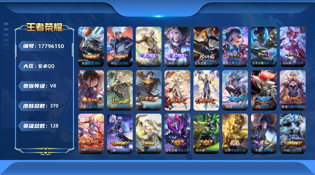 传说品质_后羿_神树通天传说品质_司空震_愿照·山河定传说品质_澜_电玩·雷克斯传说品质_澜_逐花归海传说品质_澜_愿照·九州拓传说品质_诸葛亮_武陵仙君传说品质_孙悟空_齐天大圣传说品质_吕布_怒海麟威传说品质_马超_琥珀纪元传说品质_马超_无双飞将传说品质_宫本武藏_地狱之眼传说品质_镜_炽阳神光传说品质_李信_一念神魔传说品质_李信_山海·炽霜斩传说品质_孙尚香_末日机甲传说品质_桑启_鸣野蒿传说品质_橘右京_枫霜尽传说品质_云缨_神骥·越千峰传说品质_李白_诗剑行传说品质_亚连_落雪白狼传说品质_曜_李逍遥 传说品质_孙策_末日机甲传说品质_孙策_乘龙·淬吴钩传说品质_狄仁杰_神器·狴犴令传说品质_达摩_黄金狮子座传说品质_鲁班七号_寅虎·瑞焰传说品质_虞姬_启明星使传说品质_李元芳_飞鸢探春