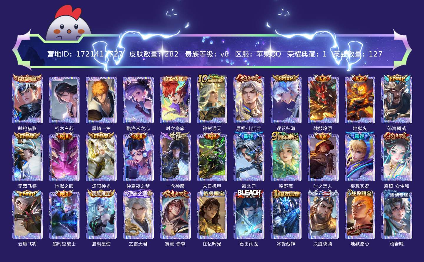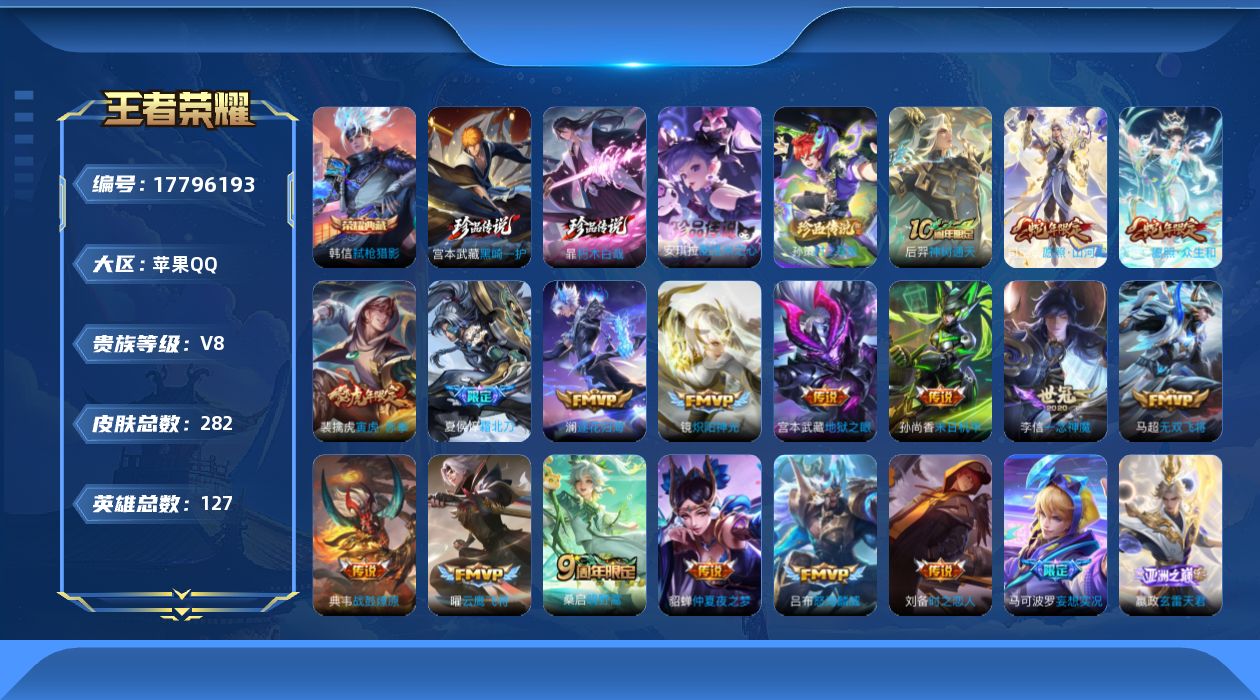 贵族等级:v8皮肤数:282传说品质22 生肖限定4 情人节限定3 珍品传说4 荣耀典藏1 英雄数:127
