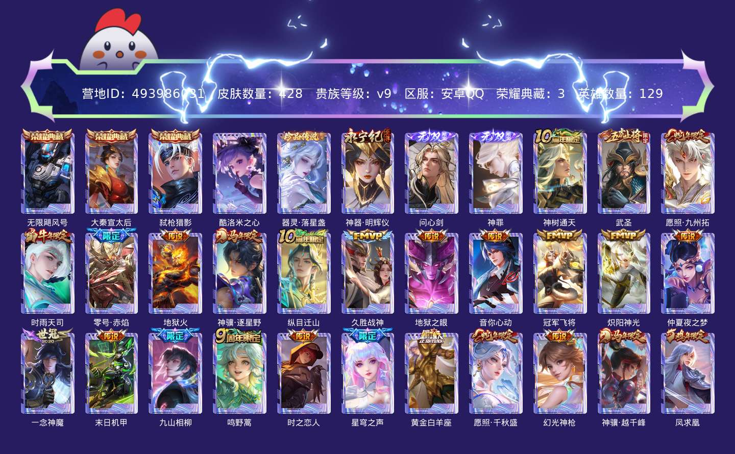 传说品质_后羿_神树通天传说品质_关羽_武圣传说品质_澜_愿照·九州拓传说品质_诸葛亮_时雨天司传说品质_孙悟空_零号·赤焰传说品质_孙悟空_地狱火传说品质_马超_神骥·逐星野传说品质_杨戬_纵目迁山传说品质_干将莫邪_久胜战神传说品质_宫本武藏_地狱之眼传说品质_周瑜_音你心动传说品质_花木兰_冠军飞将传说品质_镜_炽阳神光传说品质_貂蝉_仲夏夜之梦传说品质_李信_一念神魔传说品质_孙尚香_末日机甲传说品质_司马懿_九山相柳传说品质_桑启_鸣野蒿传说品质_刘备_时之恋人传说品质_王昭君_星穹之声传说品质_张良_黄金白羊座传说品质_女娲_愿照·千秋盛传说品质_云缨_幻光神枪传说品质_云缨_神骥·越千峰传说品质_李白_凤求凰传说品质_蔡文姬_愿照·福禄聚传说品质_伽罗_太华传说品质_曜_云鹰飞将传说品质_狄仁杰_神骥·赴朔漠传说品质_虞姬_云霓雀翎传说品质_虞姬_启明星使传说品质_百里玄策_白虎志