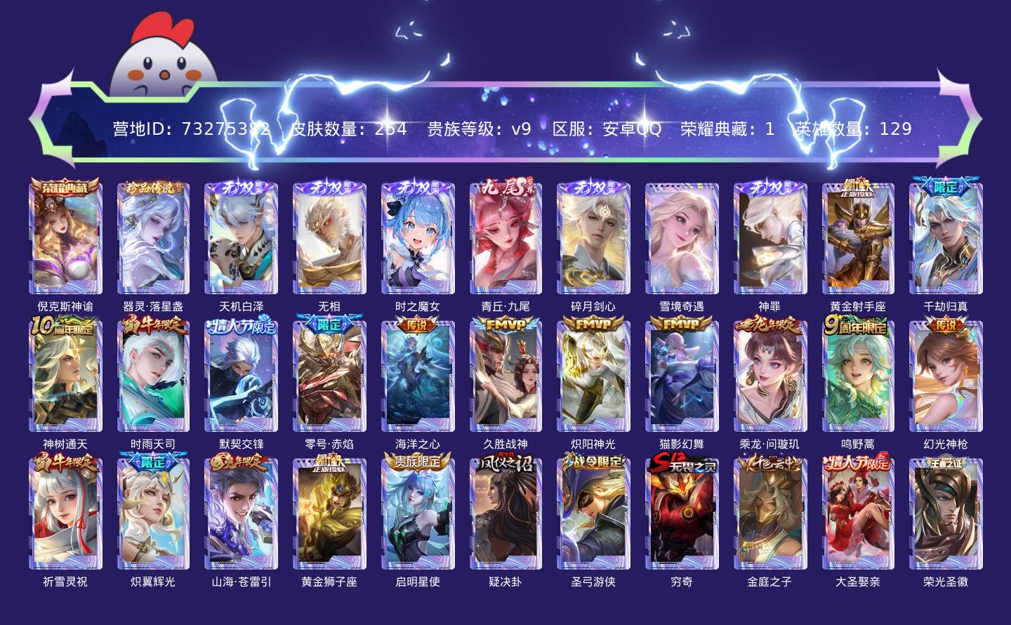 贵族等级:v9皮肤数:254传说品质18 生肖限定5 无双7 情人节限定3 荣耀典藏1 珍品传说1 英雄数:129