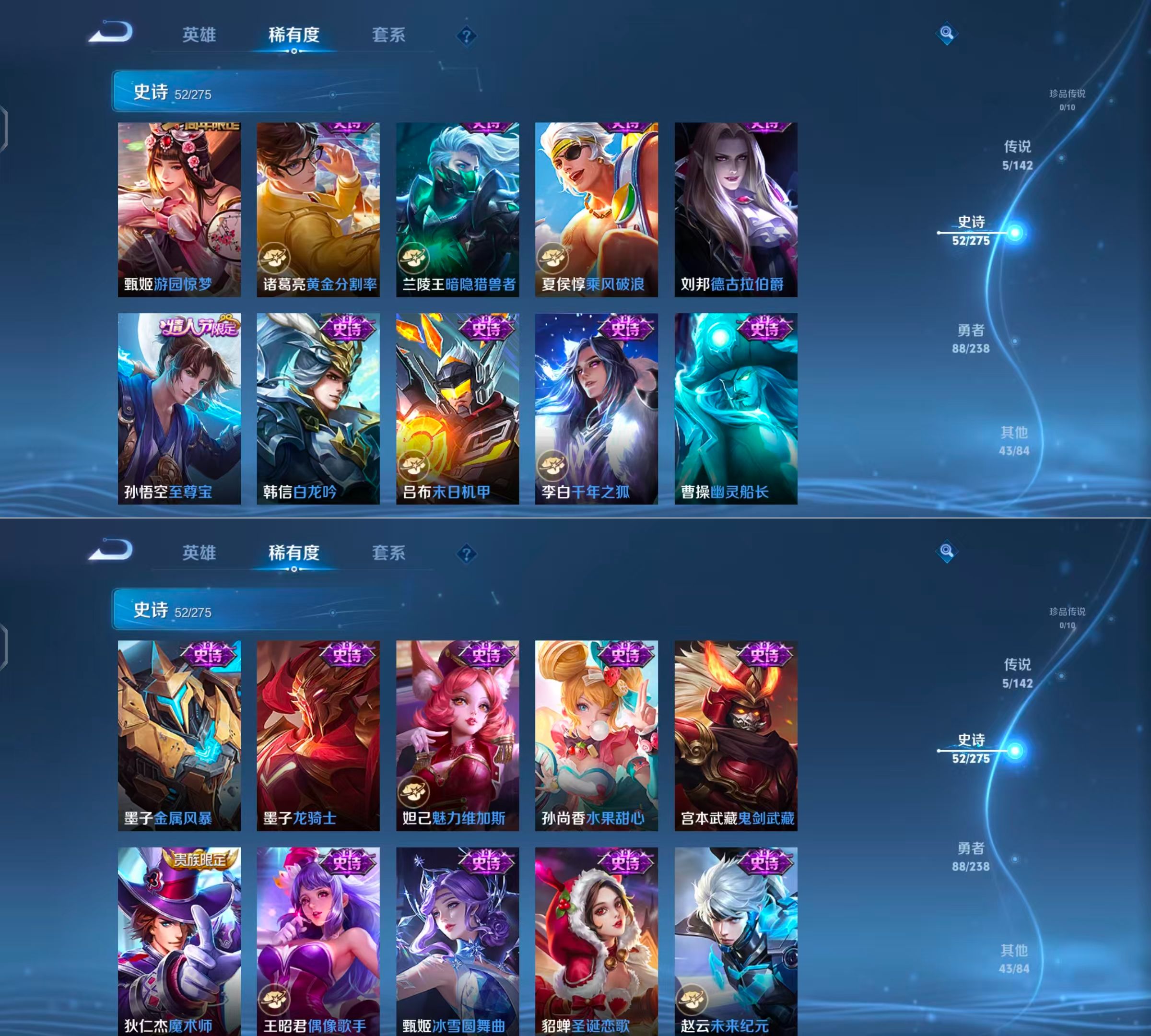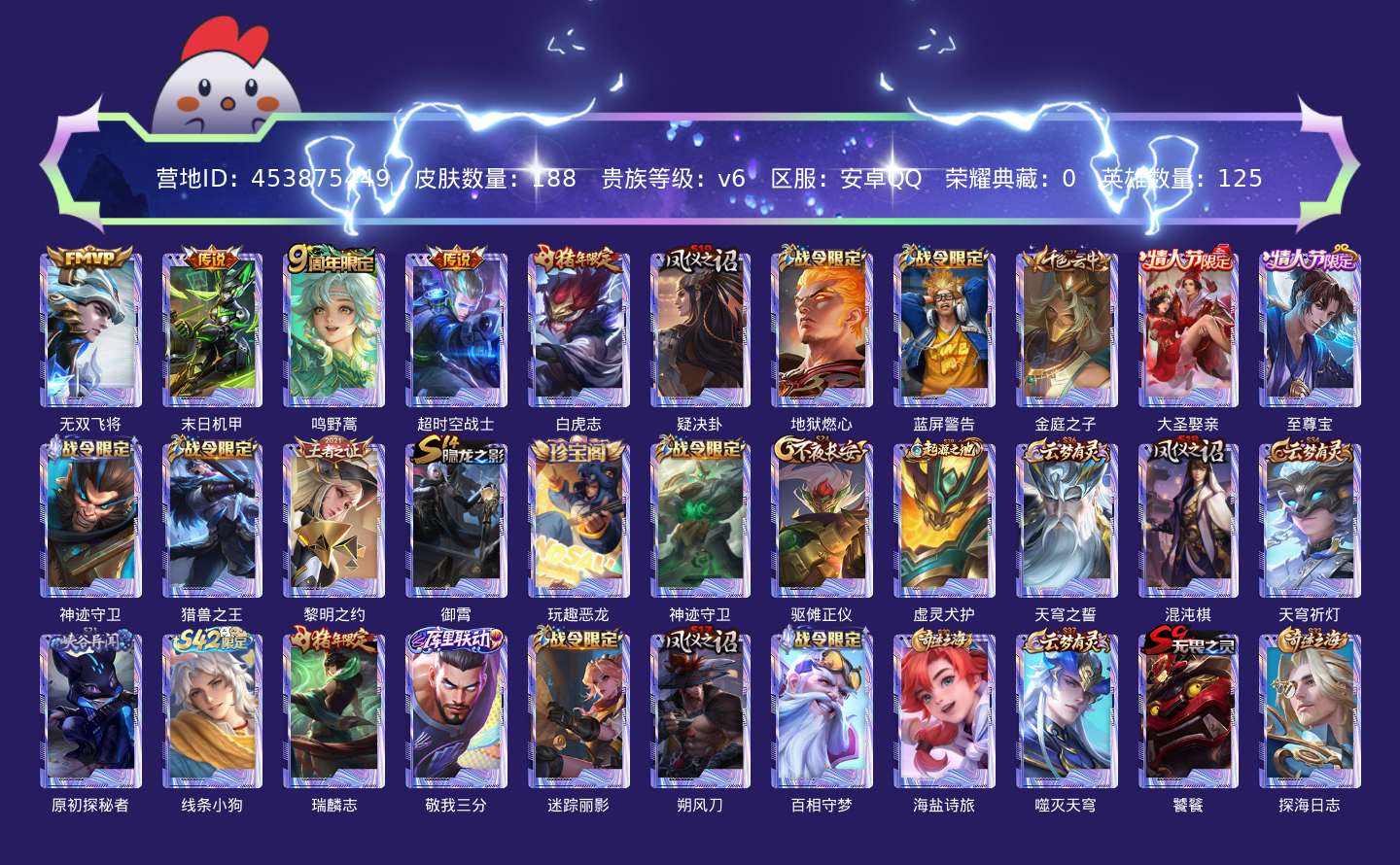 贵族等级:v6皮肤数:188情人节限定2 传说品质5 生肖限定5 英雄数:125