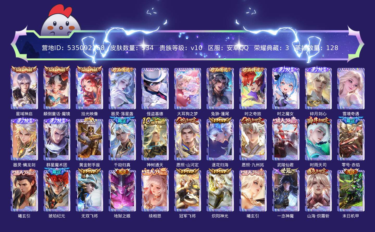 贵族等级:v10皮肤数:534生肖限定25 传说品质54 情人节限定10 荣耀典藏3 无双5 珍品传说5 英雄数:128