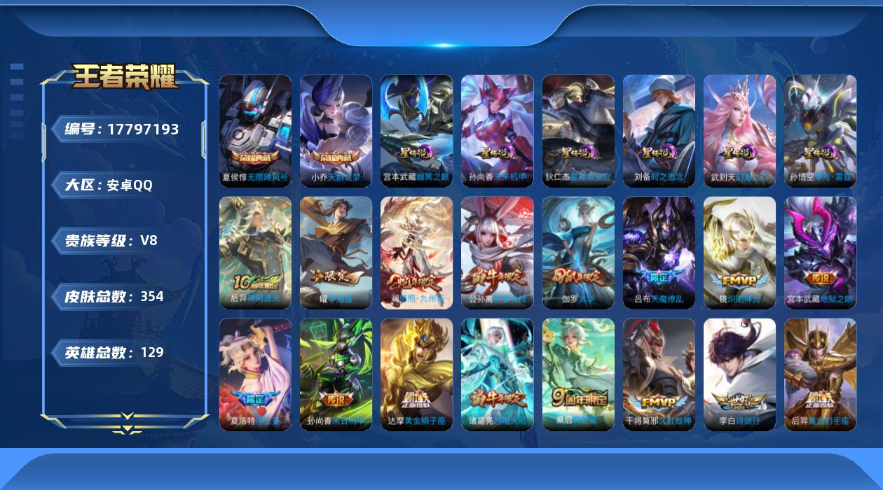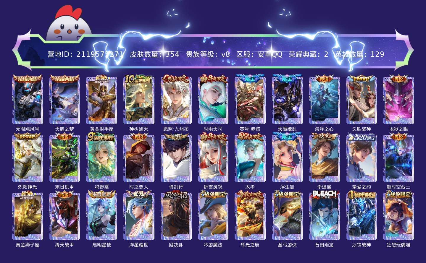 贵族等级:v8皮肤数:354生肖限定9 传说品质24 情人节限定3 荣耀典藏2 英雄数:129