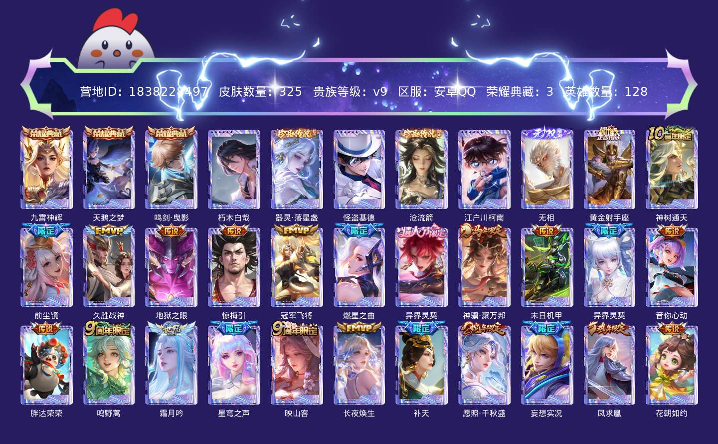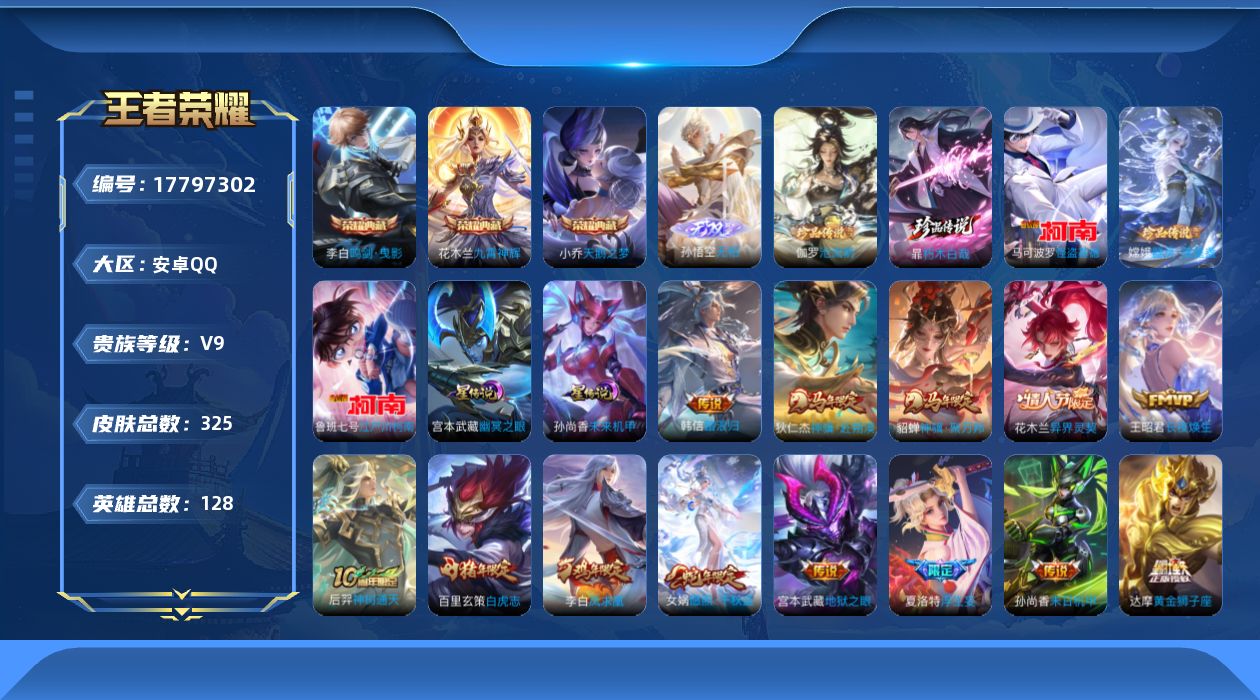 传说品质_后羿_黄金射手座传说品质_后羿_神树通天传说品质_娜可露露_前尘镜传说品质_干将莫邪_久胜战神传说品质_宫本武藏_地狱之眼传说品质_宫本武藏_惊梅引传说品质_花木兰_冠军飞将传说品质_花木兰_燃星之曲传说品质_花木兰_异界灵契传说品质_貂蝉_神骥·聚万邦传说品质_孙尚香_末日机甲传说品质_孙尚香_异界灵契传说品质_小乔_音你心动传说品质_梦奇_胖达荣荣传说品质_桑启_鸣野蒿传说品质_露娜_霜月吟传说品质_王昭君_星穹之声传说品质_王昭君_映山客传说品质_王昭君_长夜焕生传说品质_女娲_补天传说品质_女娲_愿照·千秋盛传说品质_马可波罗_妄想实况传说品质_李白_凤求凰传说品质_蔡文姬_花朝如约传说品质_公孙离_记忆之芯传说品质_夏洛特_浮生妄传说品质_曜_云鹰飞将传说品质_狄仁杰_超时空战士传说品质_狄仁杰_神骥·赴朔漠传说品质_达摩_黄金狮子座传说品质_虞姬_云霓雀翎传说品质_虞姬_启明星使传说品质_百里玄策_白虎志传说品质_韩信_踏浪归传说品质_赵云_淬星耀世