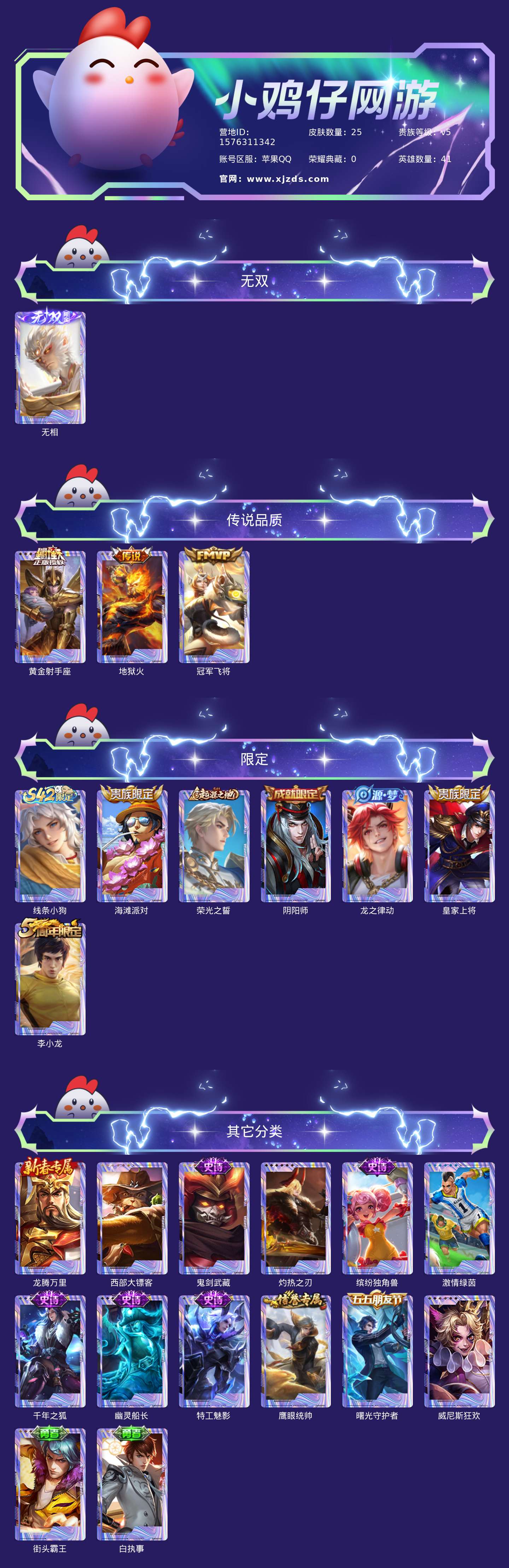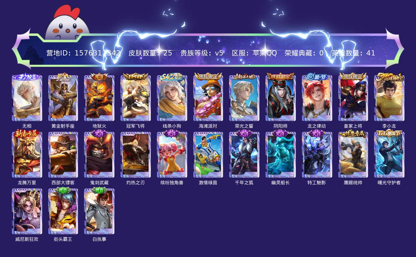 贵族等级:v5皮肤数:25传说品质3 无双1 英雄数:41