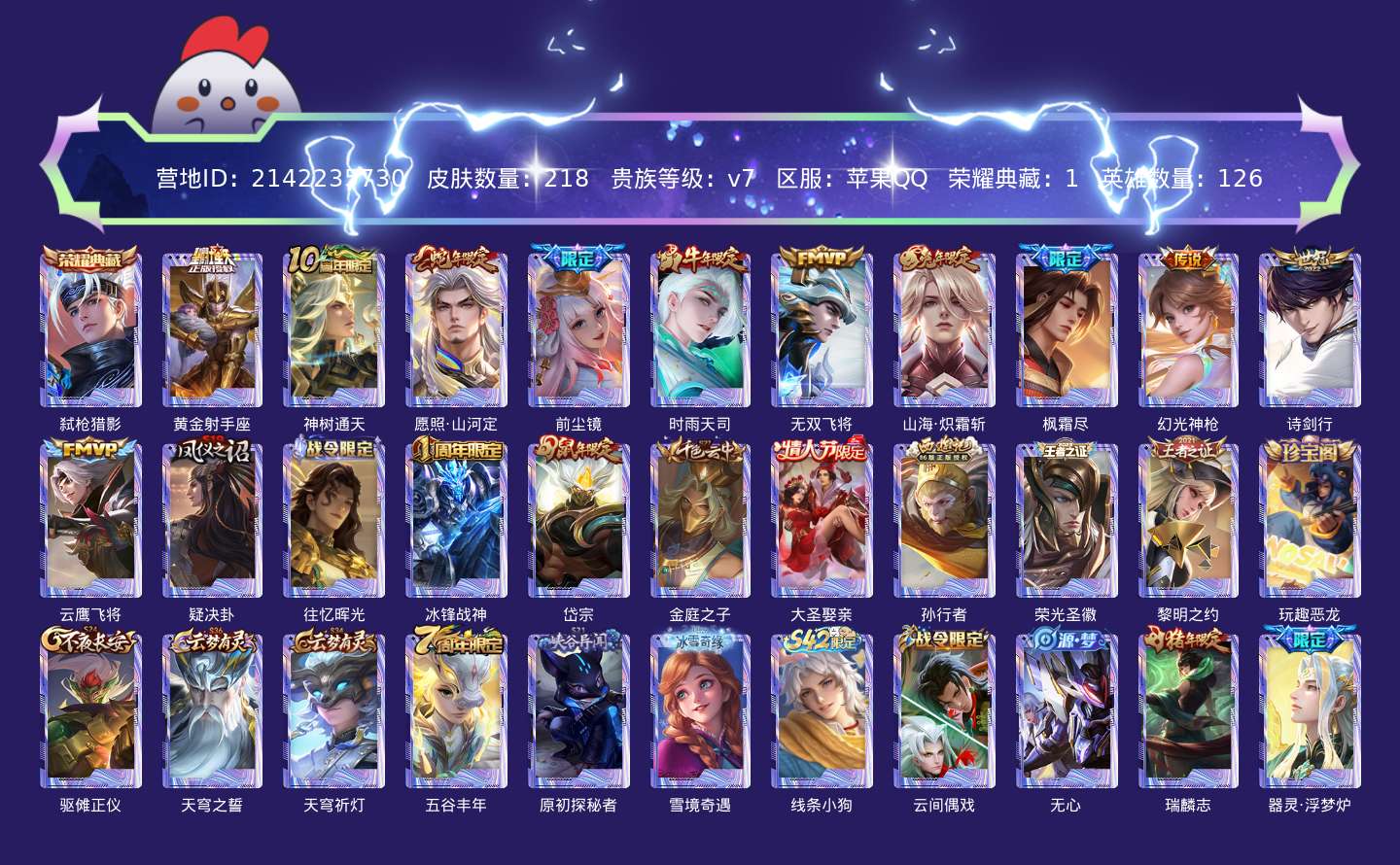 贵族等级:v7皮肤数:218传说品质11 生肖限定6 情人节限定1 荣耀典藏1 英雄数:126
