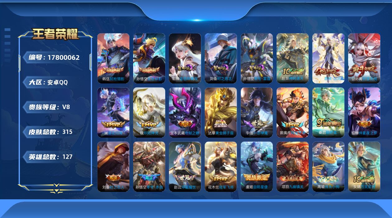 贵族等级:v8皮肤数:315传说品质16 生肖限定3 荣耀典藏2 英雄数:127