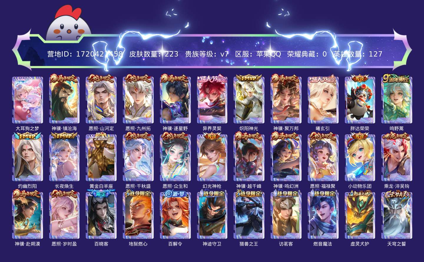 贵族等级:v7皮肤数:224传说品质23 生肖限定14 情人节限定2 珍品传说1 英雄数:127