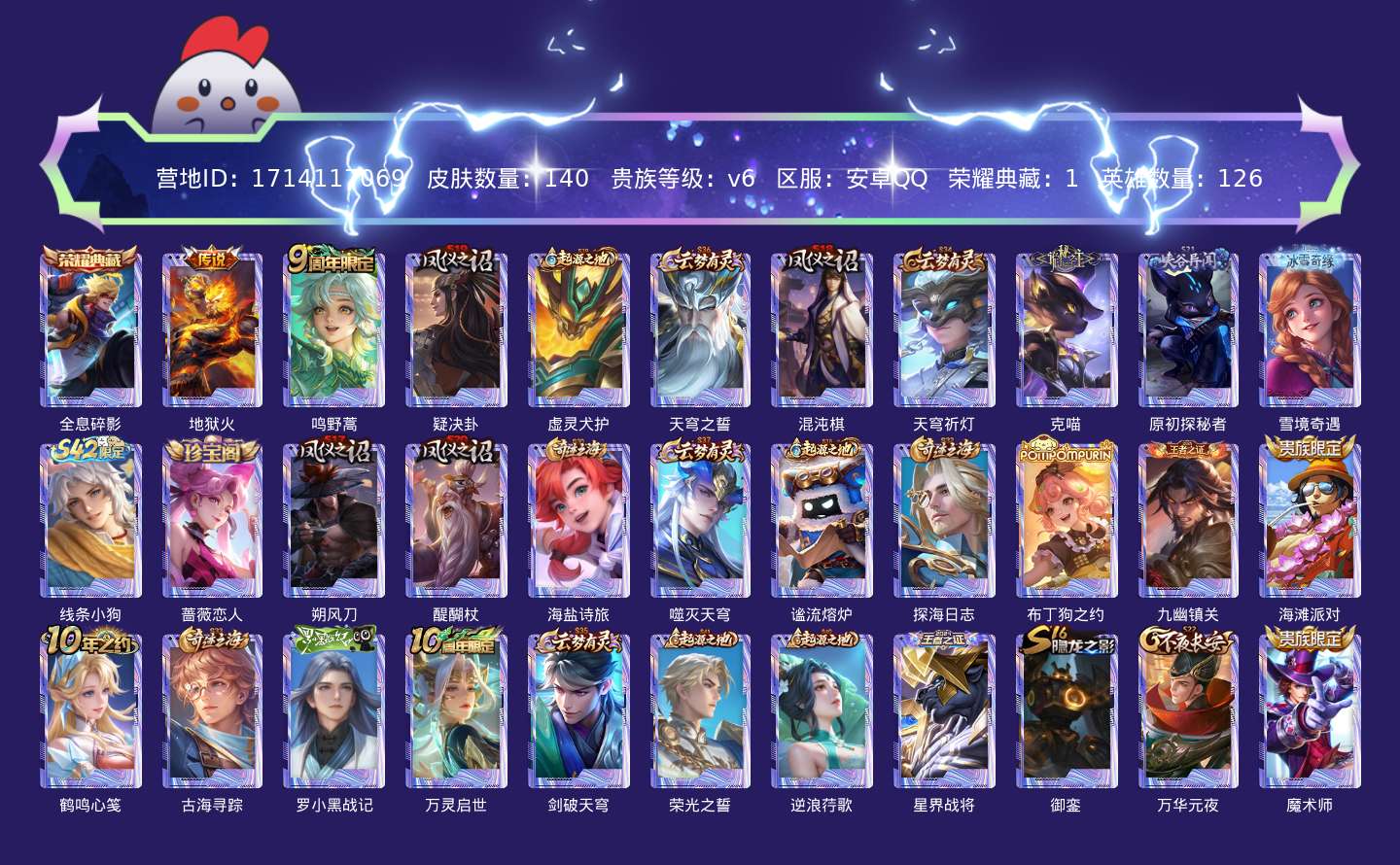 贵族等级:v6皮肤数:140荣耀典藏1 传说品质2 英雄数:126