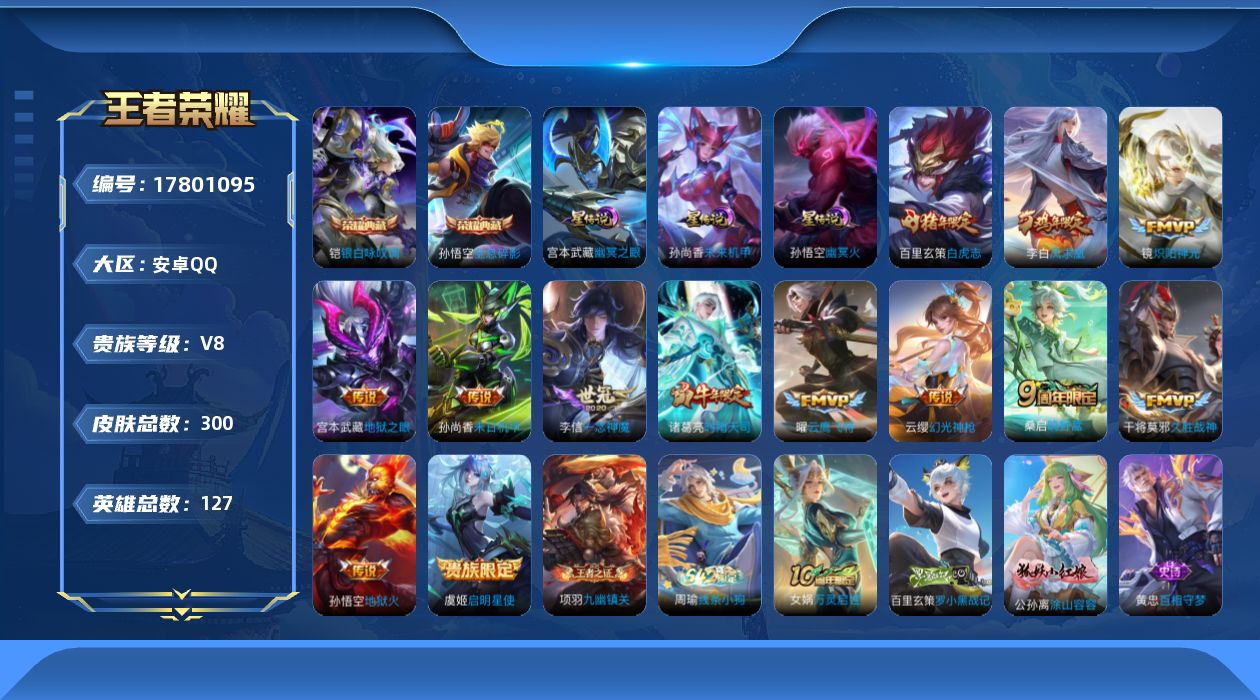 贵族等级:v8皮肤数:300生肖限定6 传说品质13 情人节限定2 荣耀典藏2 英雄数:127