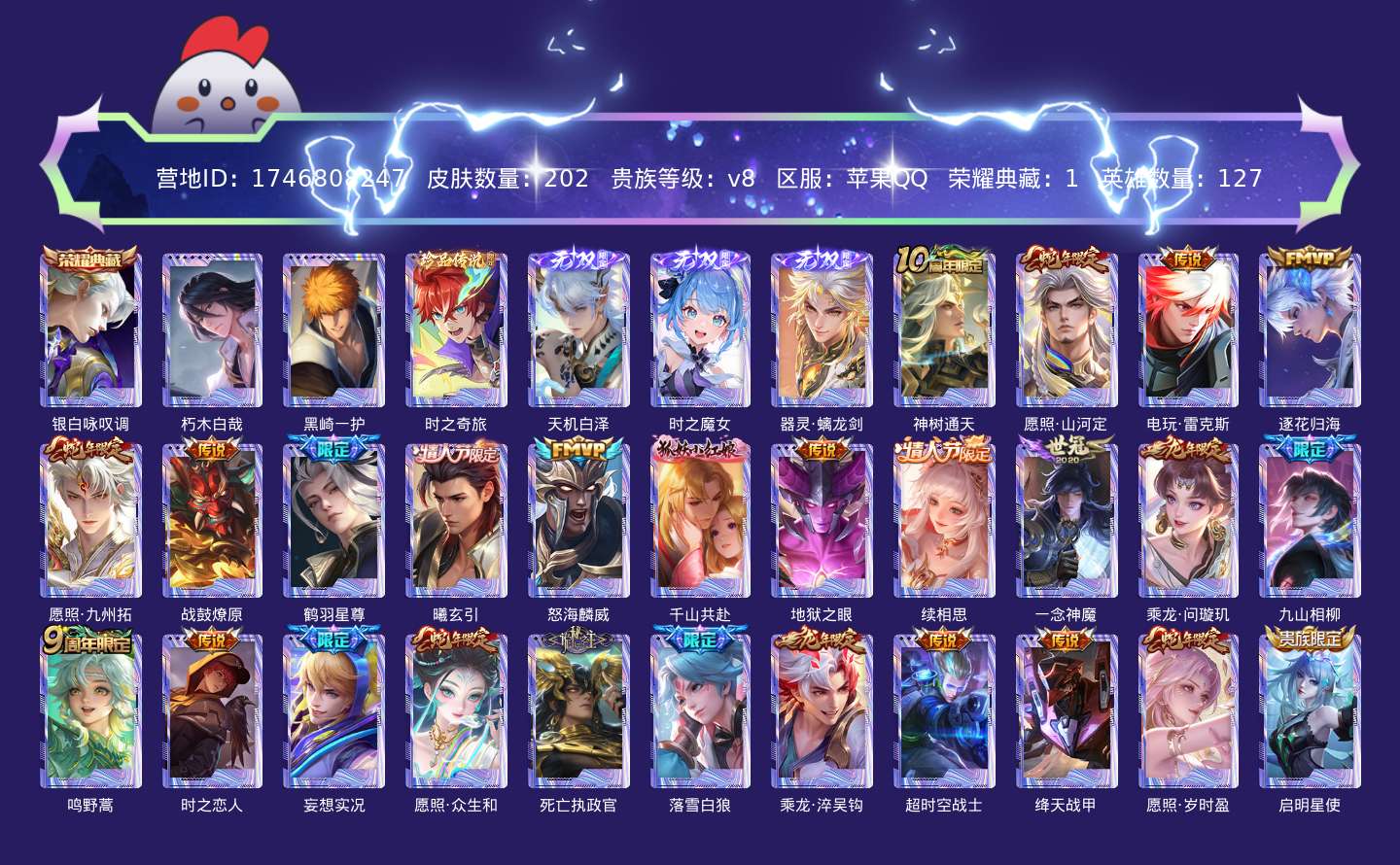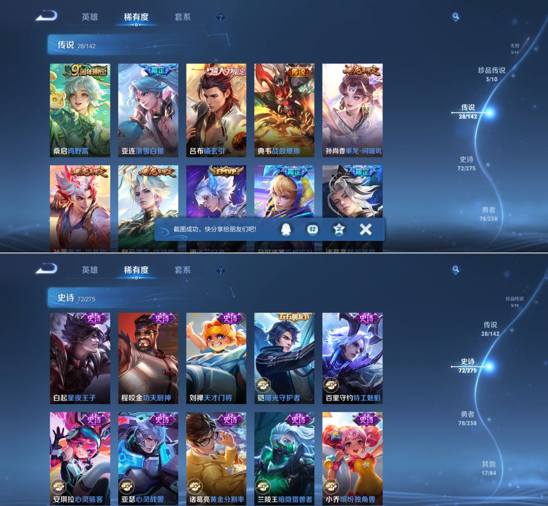 传说品质_后羿_神树通天传说品质_司空震_愿照·山河定传说品质_澜_电玩·雷克斯传说品质_澜_逐花归海传说品质_澜_愿照·九州拓传说品质_典韦_战鼓燎原传说品质_诸葛亮_鹤羽星尊传说品质_吕布_曦玄引传说品质_吕布_怒海麟威传说品质_干将莫邪_千山共赴传说品质_宫本武藏_地狱之眼传说品质_西施_续相思传说品质_李信_一念神魔传说品质_孙尚香_乘龙·问璇玑传说品质_司马懿_九山相柳传说品质_桑启_鸣野蒿传说品质_刘备_时之恋人传说品质_马可波罗_妄想实况传说品质_妲己_愿照·众生和传说品质_大司命_死亡执政官传说品质_亚连_落雪白狼传说品质_孙策_乘龙·淬吴钩传说品质_狄仁杰_超时空战士传说品质_铠_绛天战甲传说品质_虞姬_愿照·岁时盈传说品质_虞姬_启明星使传说品质_赵云_乘龙·铭钟鼎传说品质_裴擒虎_祥瑞亨通