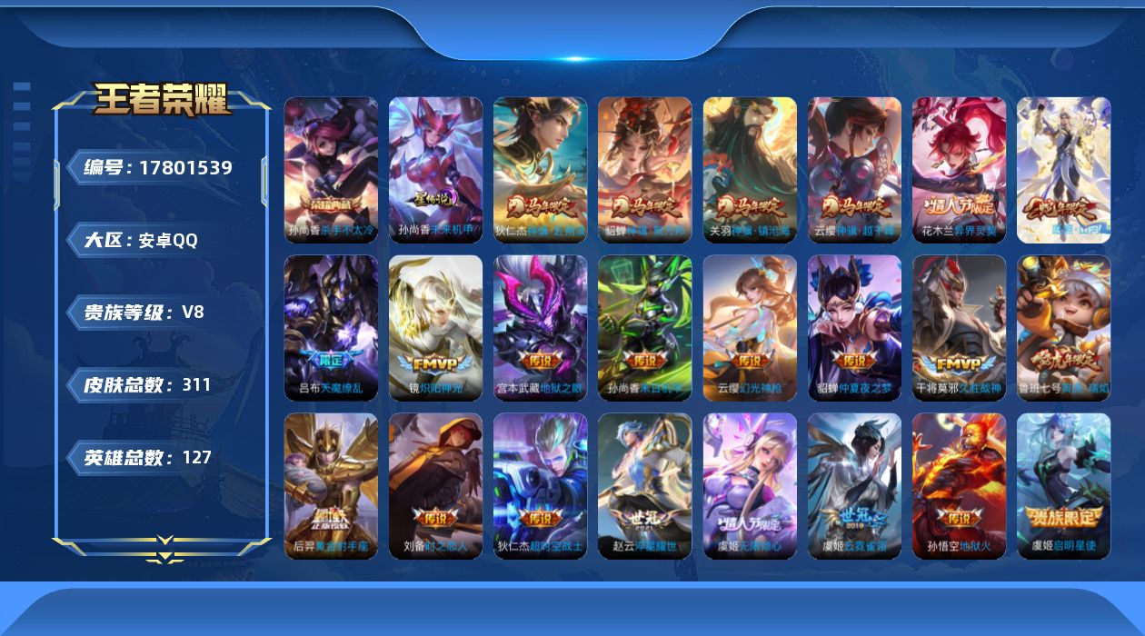 贵族等级:v8皮肤数:311生肖限定8 传说品质23 情人节限定4 荣耀典藏1 英雄数:127