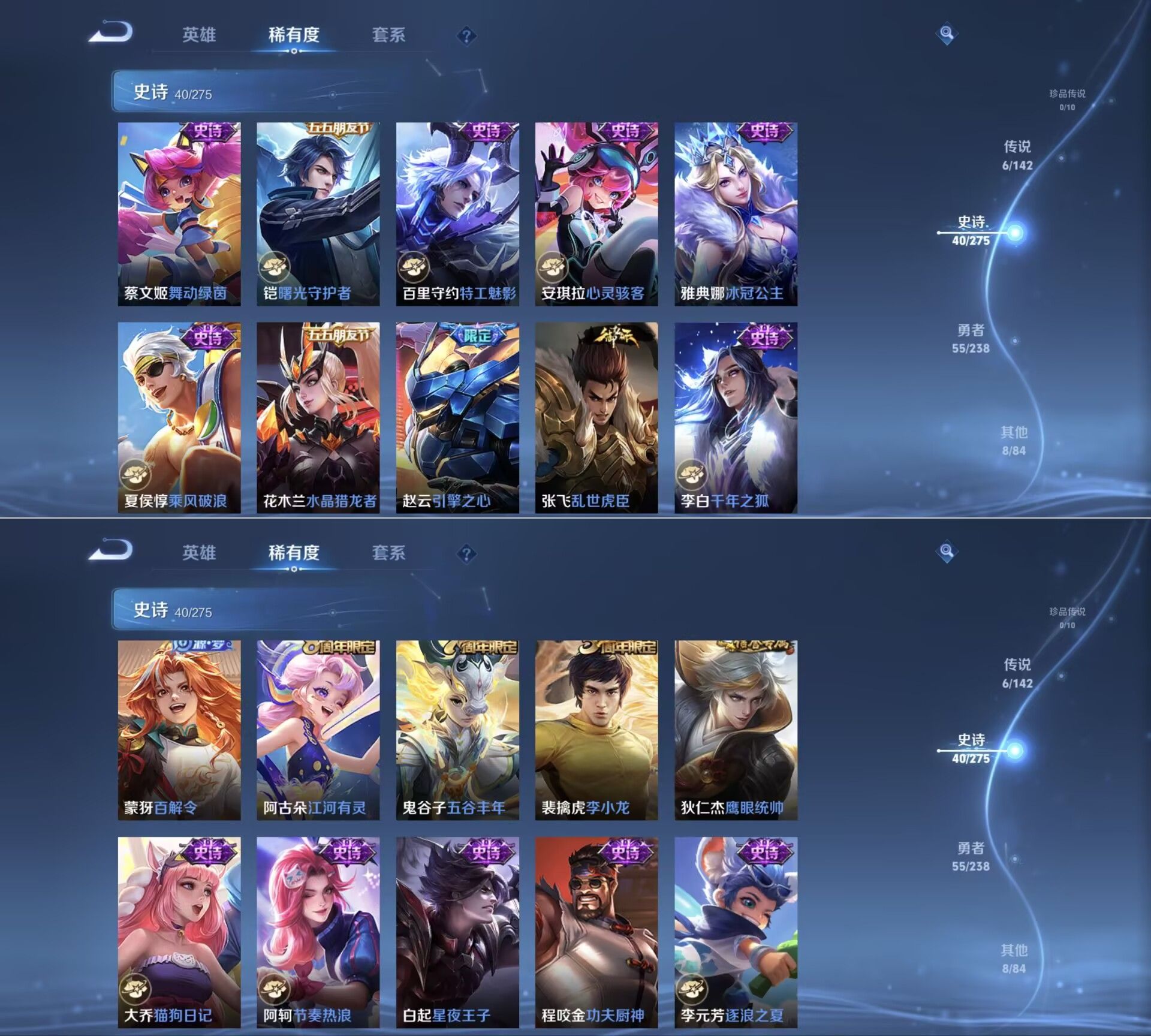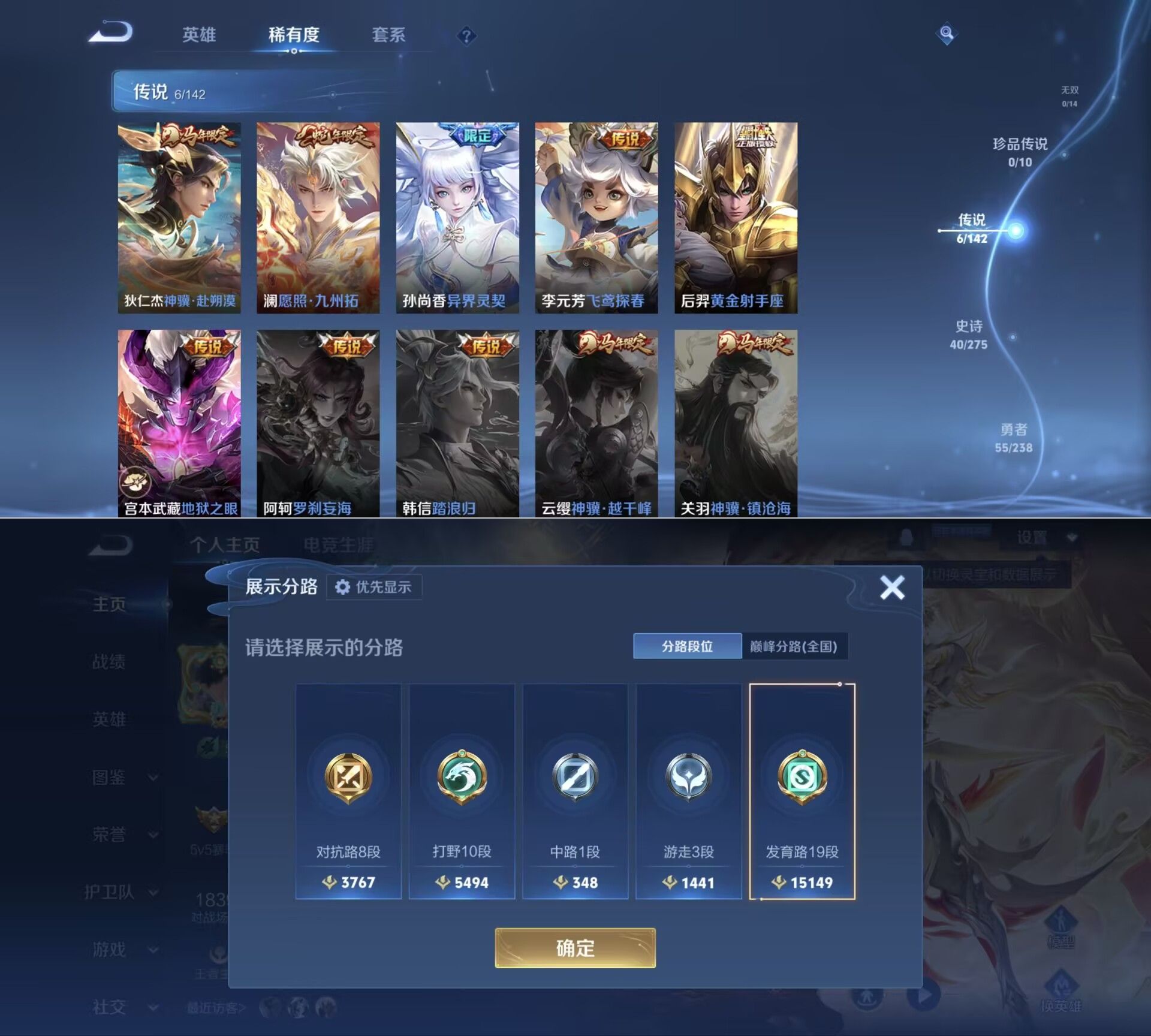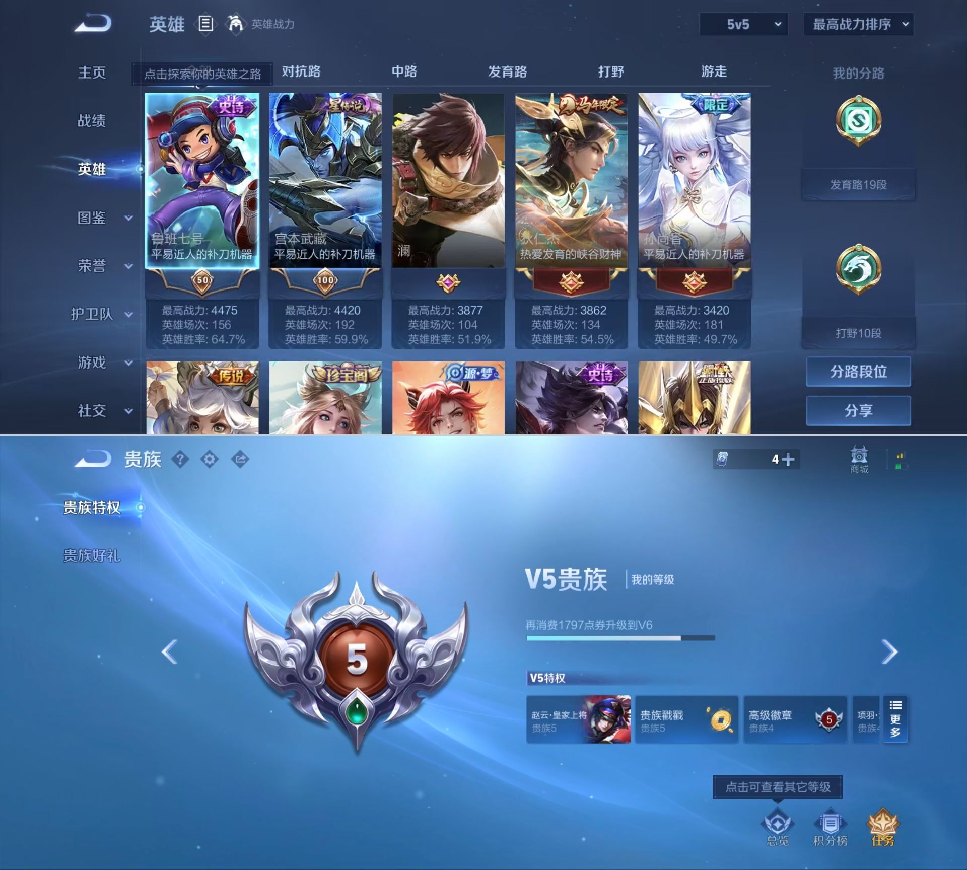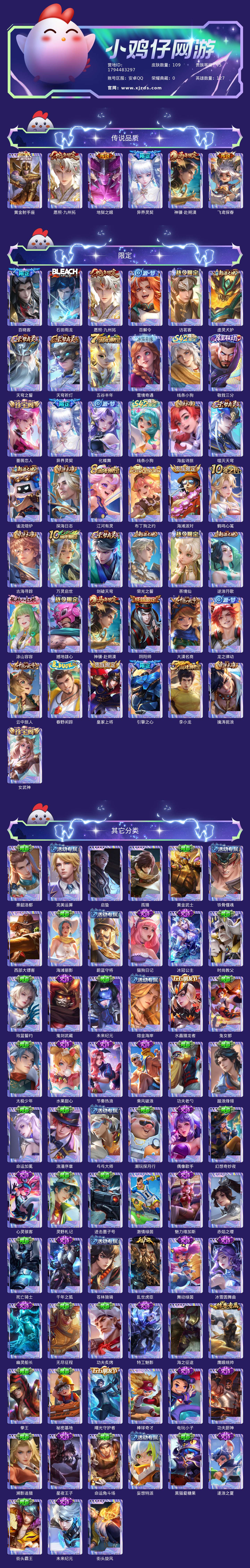 贵族等级:v5皮肤数:109传说品质6 生肖限定2 英雄数:127