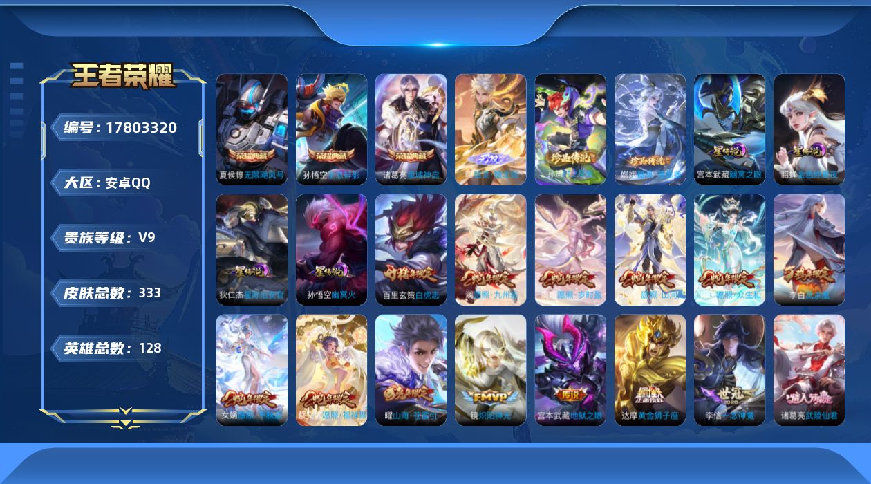 贵族等级:v9皮肤数:333传说品质25 生肖限定11 情人节限定3 荣耀典藏3 珍品传说2 无双1 英雄数:128