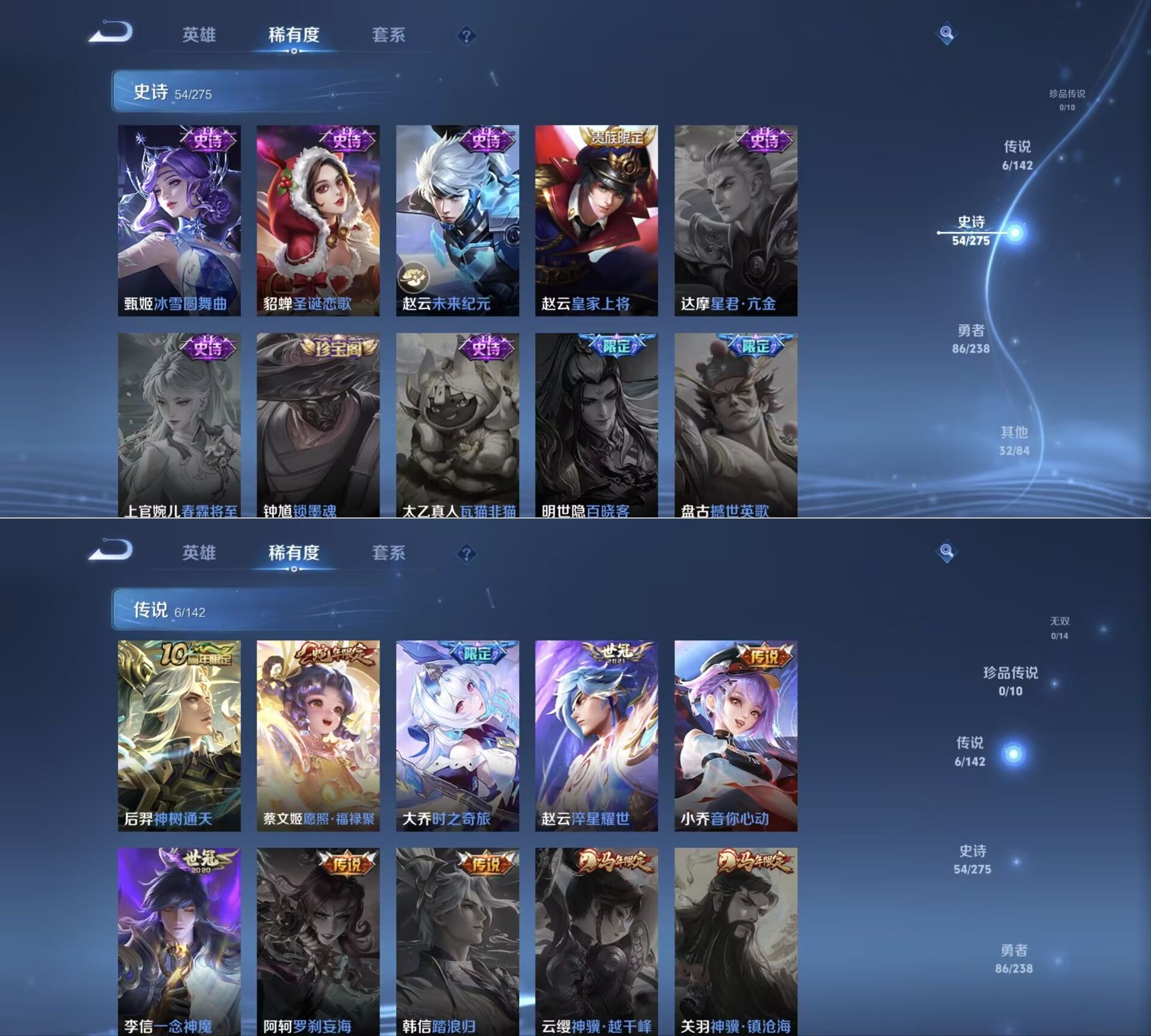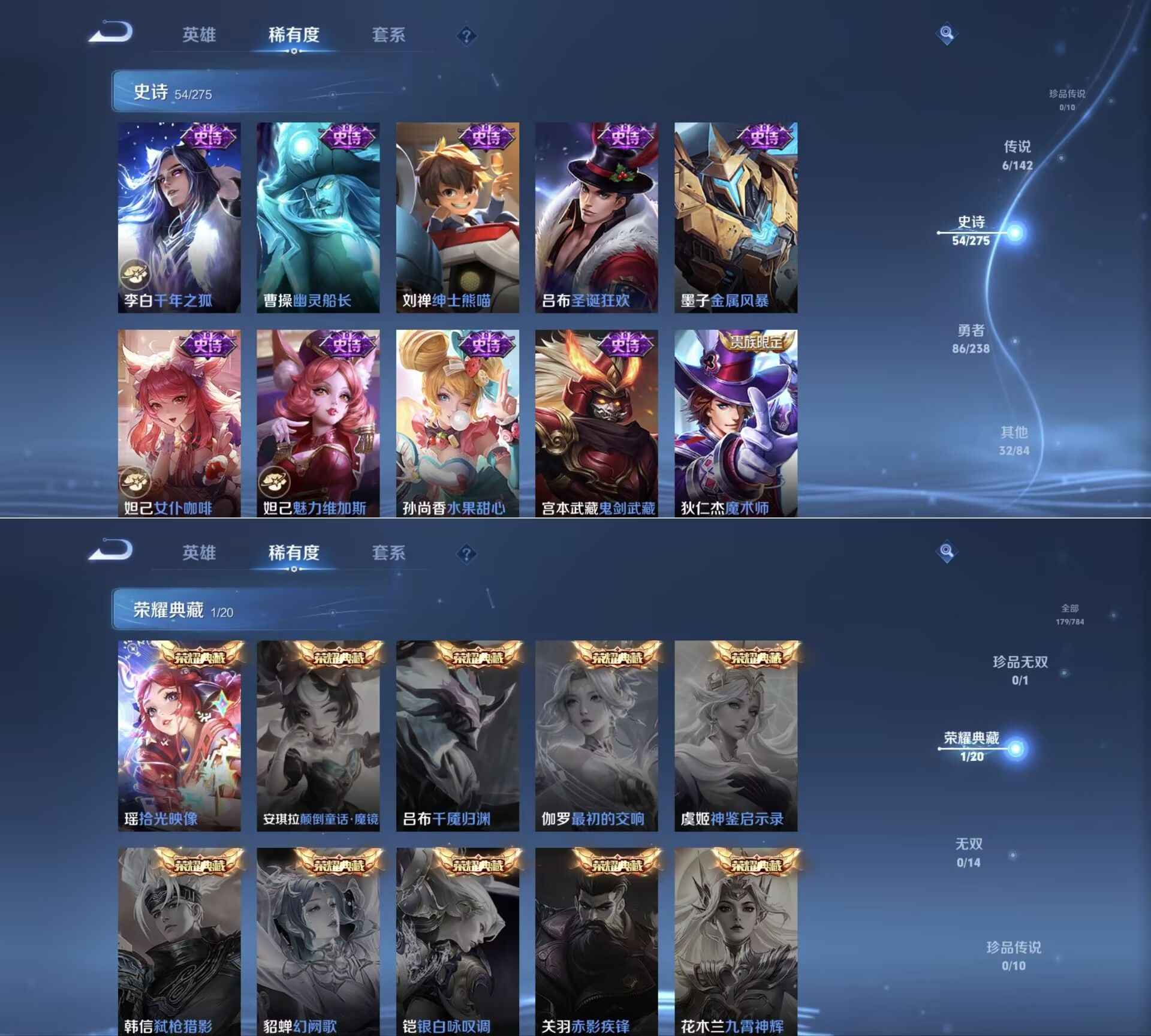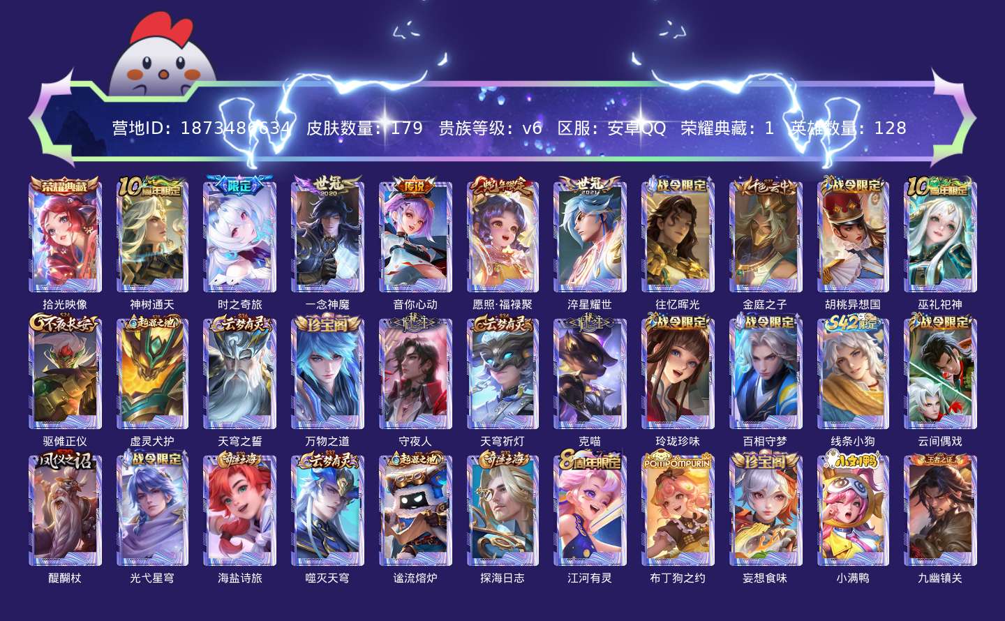 贵族等级:v6皮肤数:179传说品质6 荣耀典藏1 生肖限定1 英雄数:128