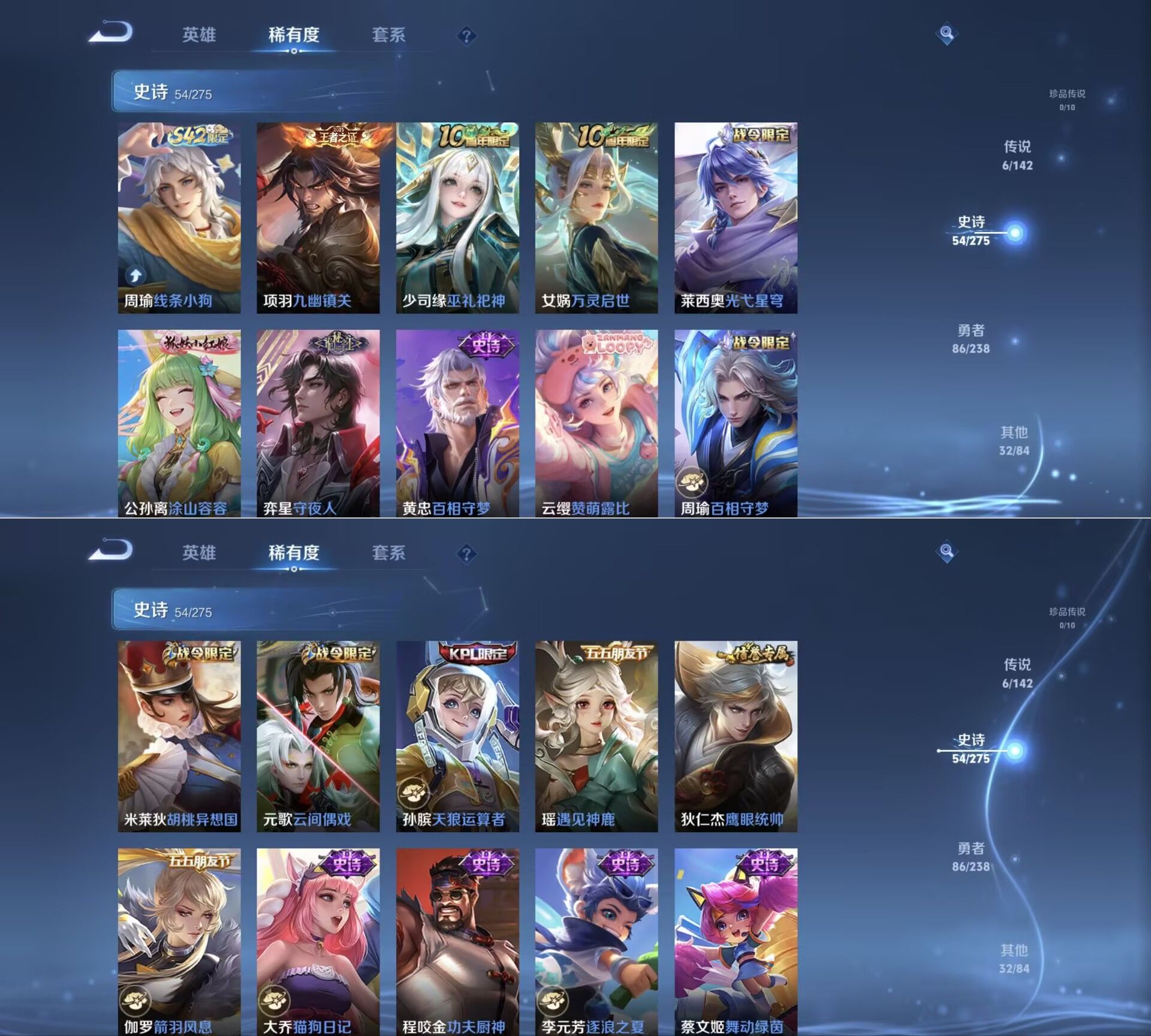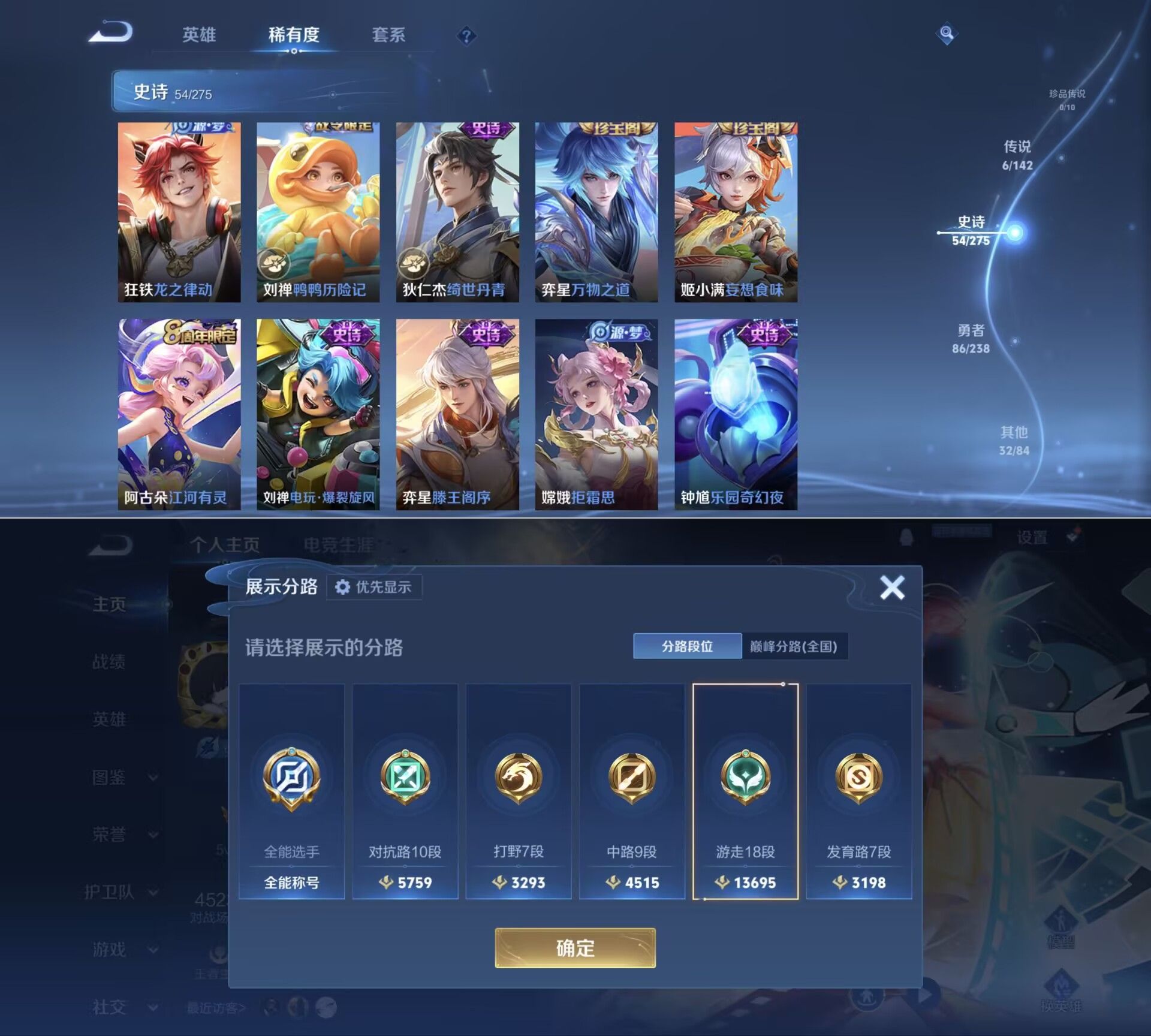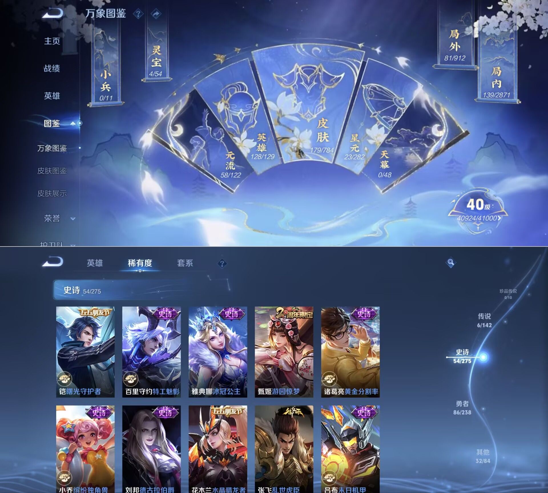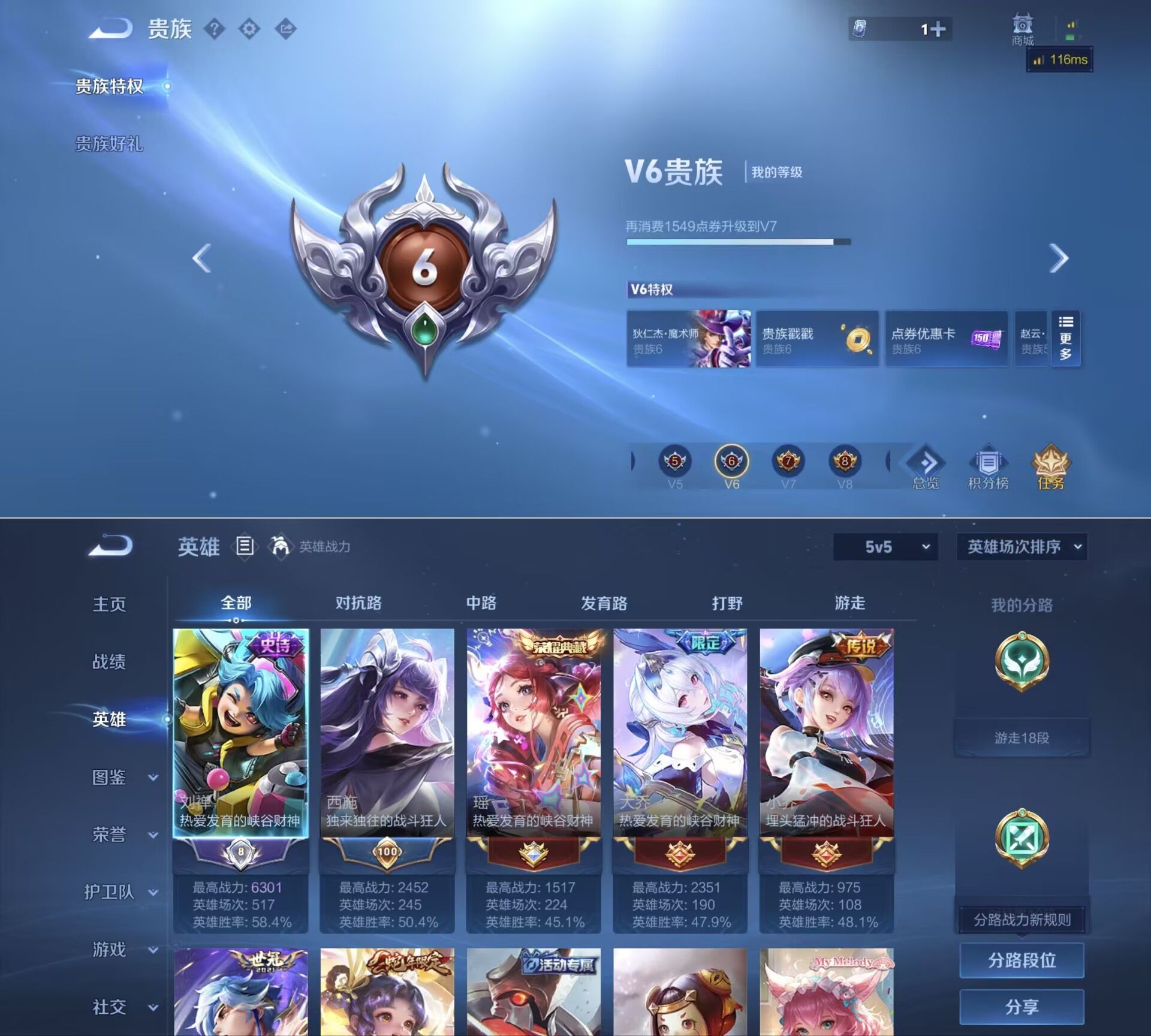 贵族等级:v6皮肤数:179传说品质6 荣耀典藏1 生肖限定1 英雄数:128