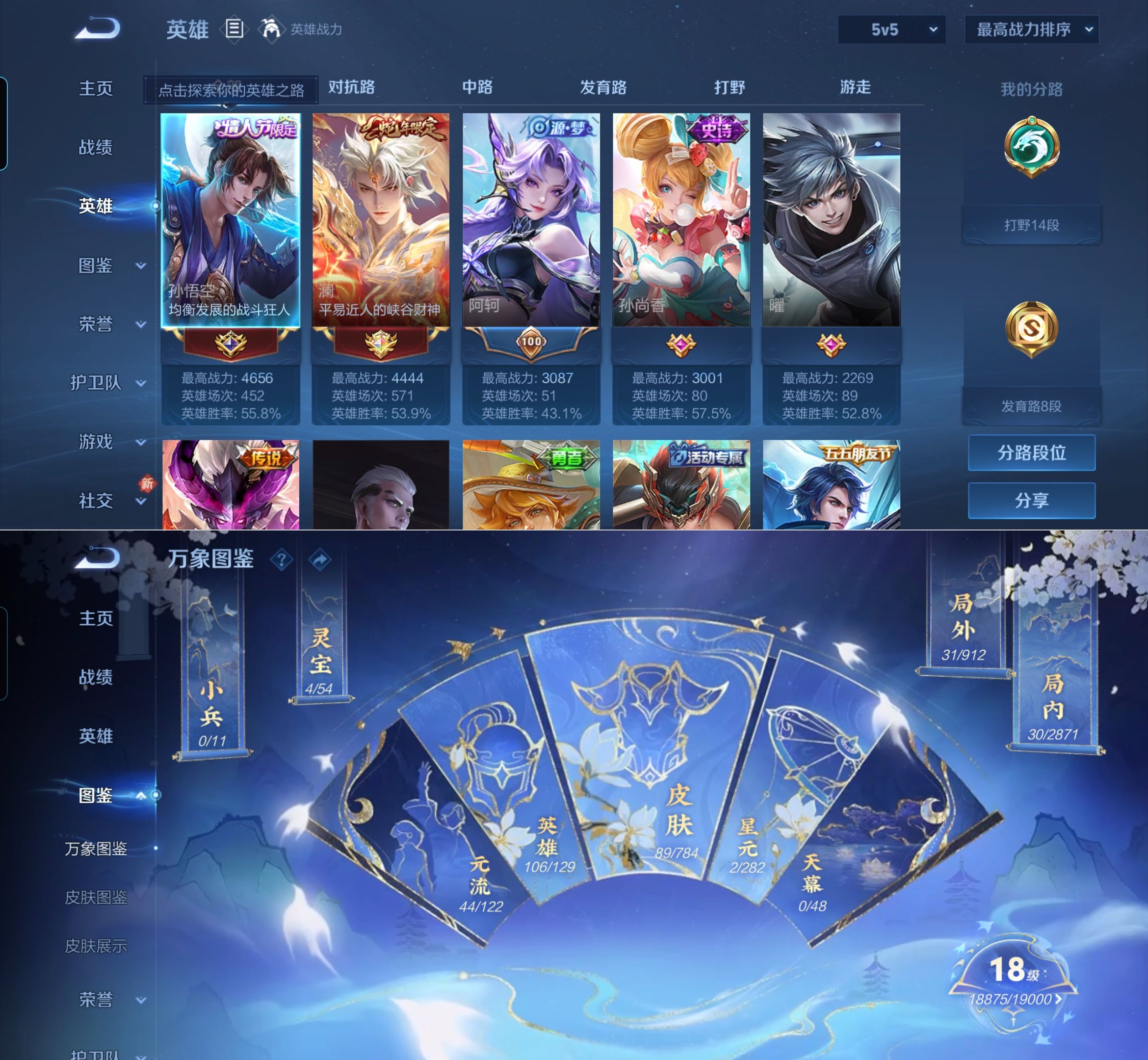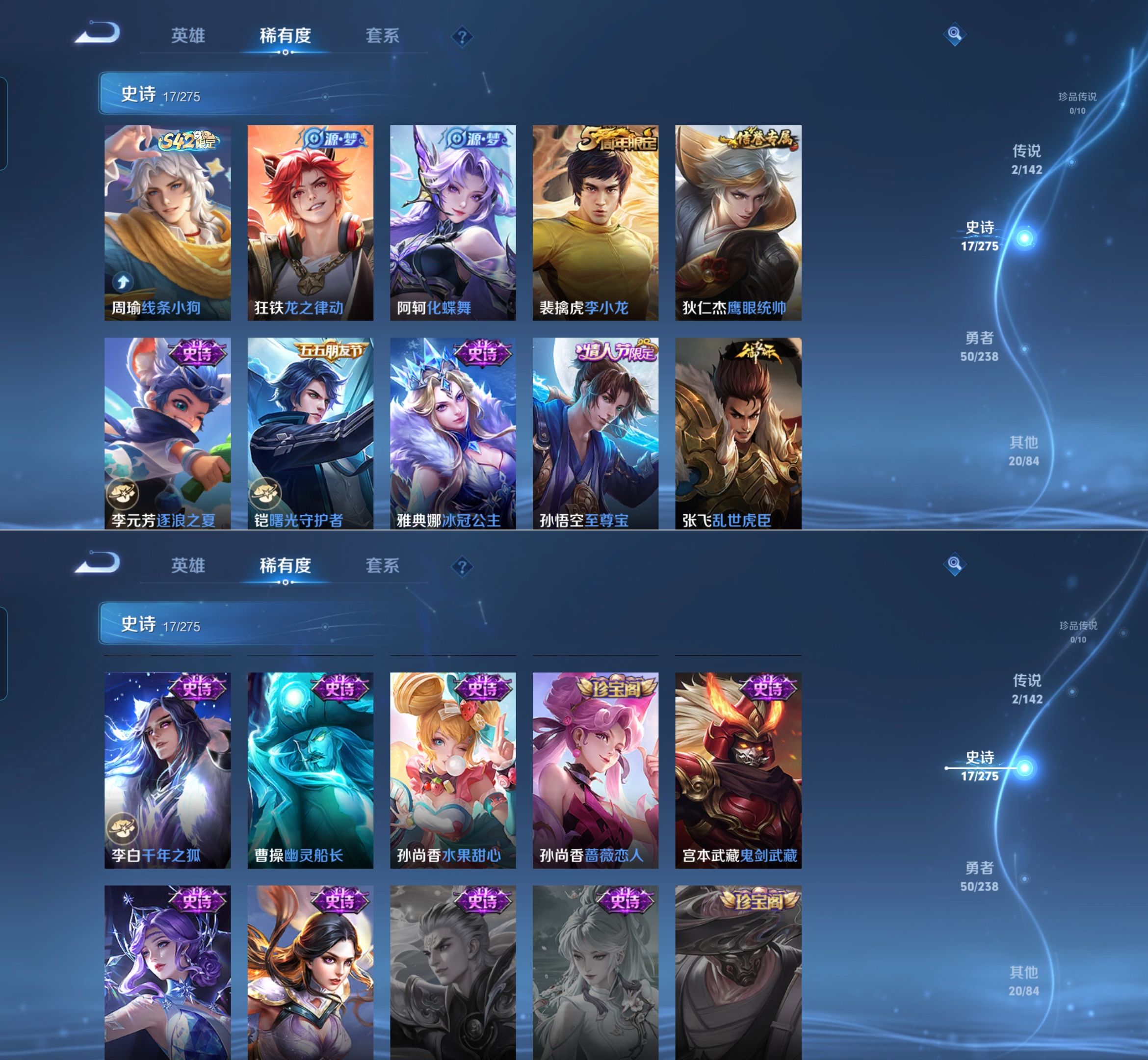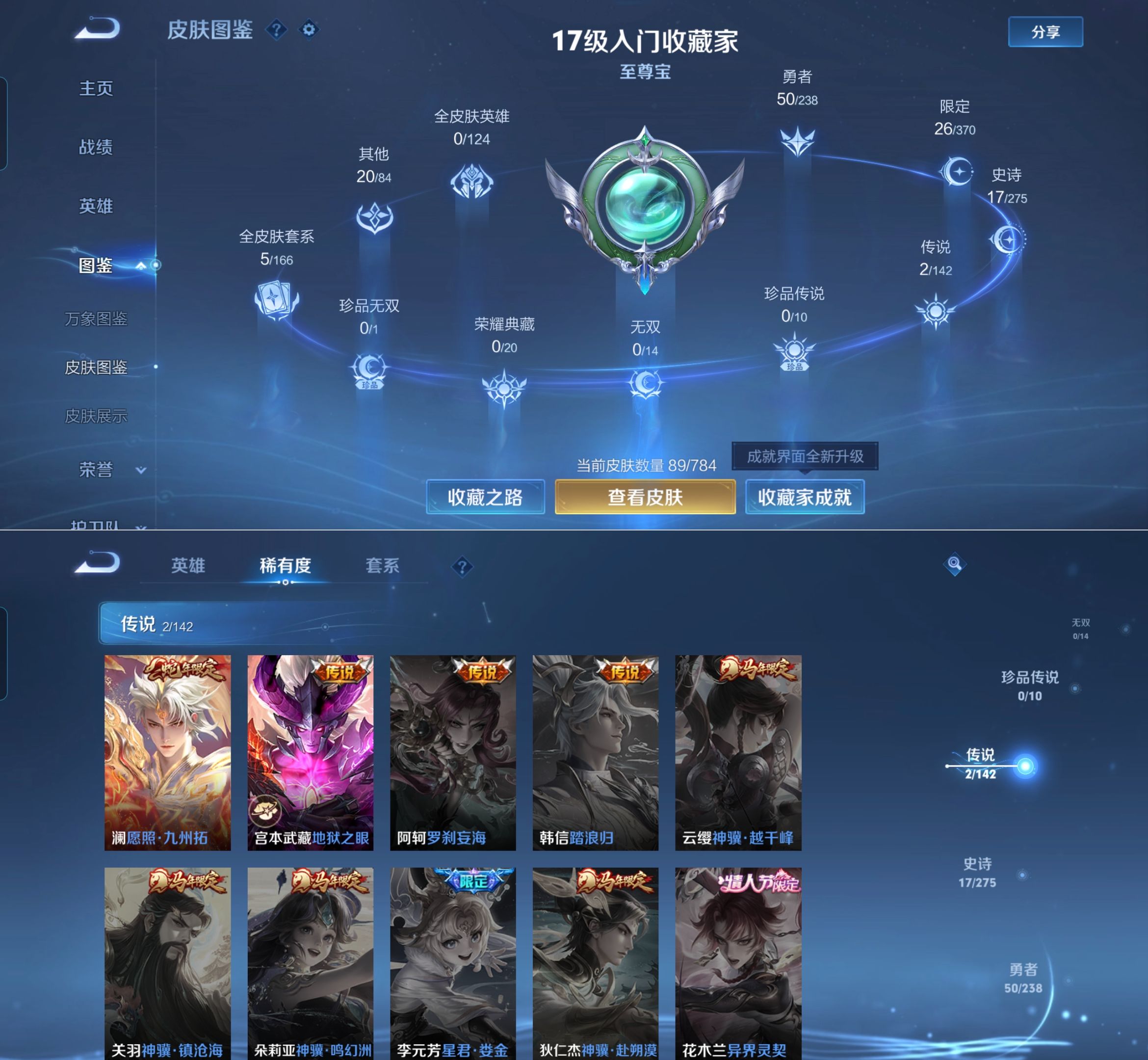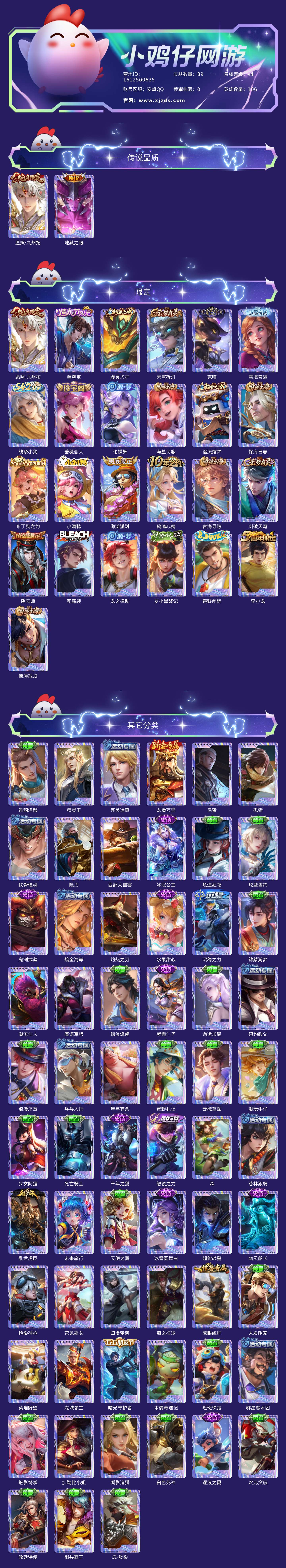 贵族等级:v4皮肤数:89传说品质2 生肖限定1 情人节限定1 英雄数:106