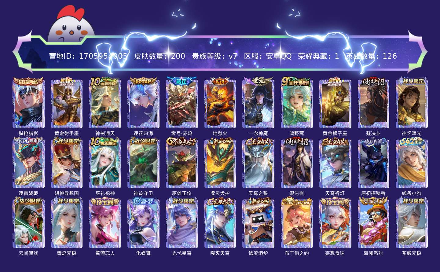 贵族等级:v7皮肤数:200传说品质8 荣耀典藏1 英雄数:126