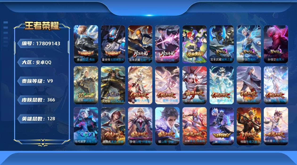 贵族等级:v9皮肤数:366情人节限定5 传说品质40 生肖限定17 珍品传说3 荣耀典藏2 英雄数:128