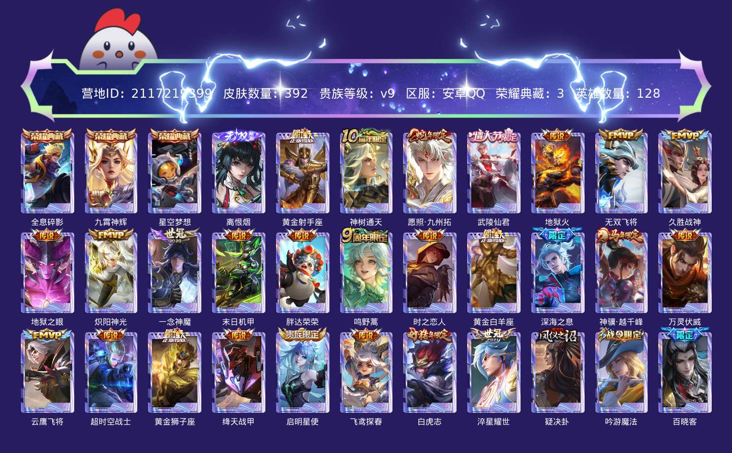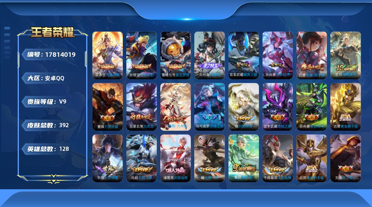 贵族等级:v9皮肤数:392传说品质26 生肖限定6 情人节限定4 荣耀典藏3 无双1 英雄数:128