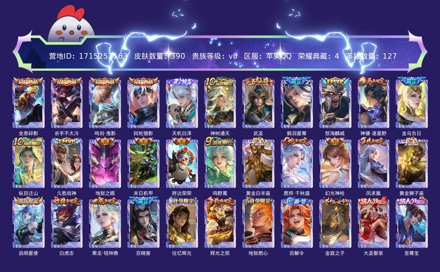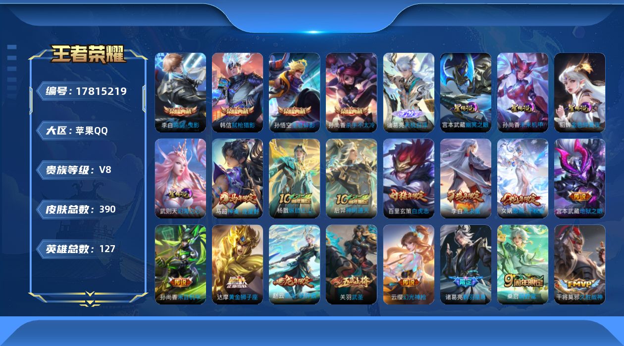 贵族等级:v8皮肤数:390生肖限定7 传说品质20 无双1 情人节限定3 荣耀典藏4 英雄数:127