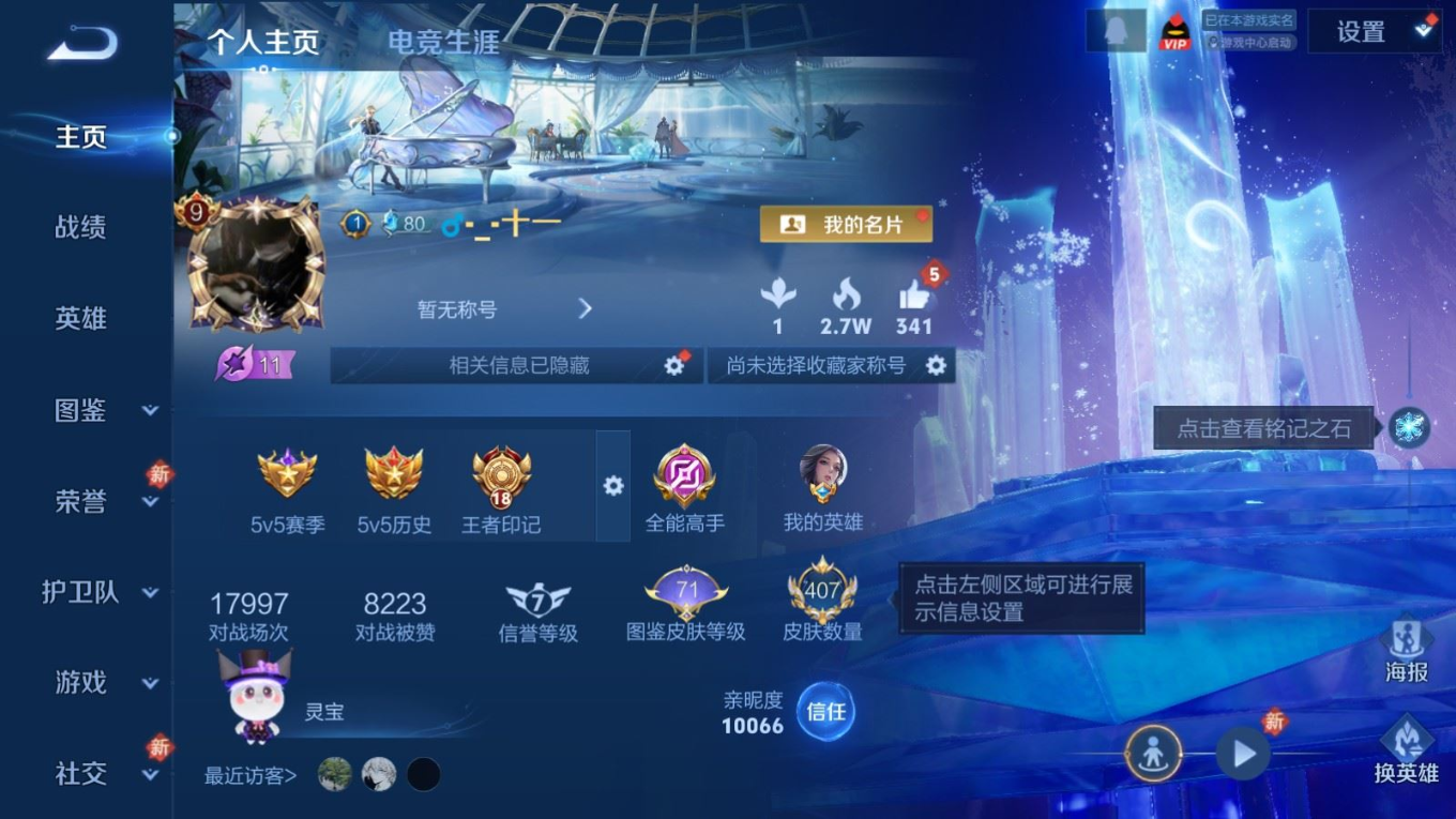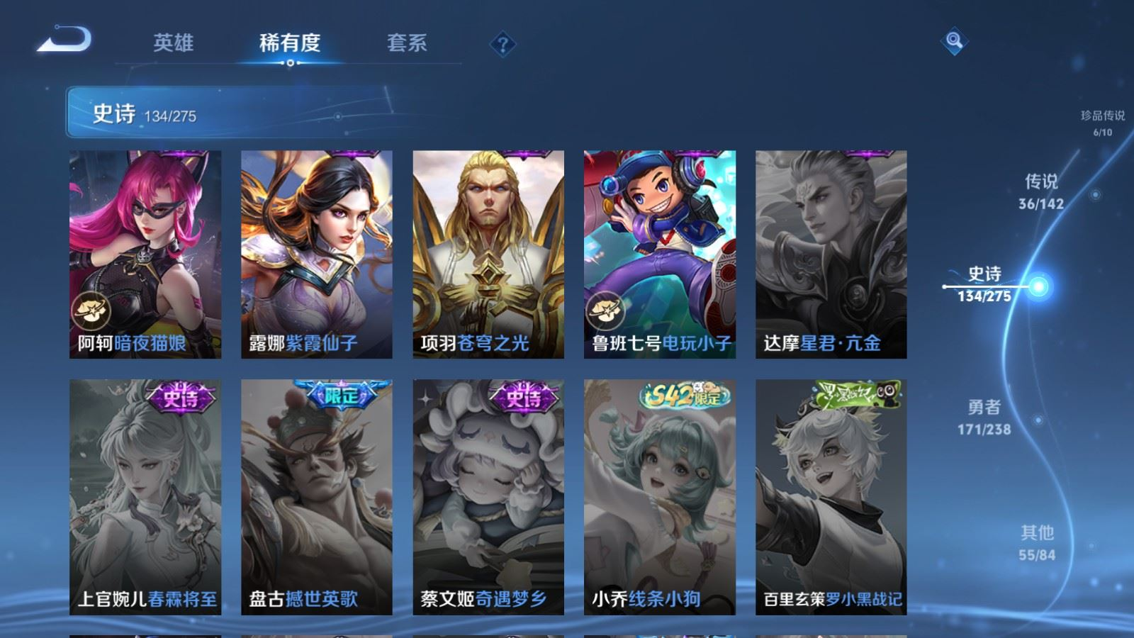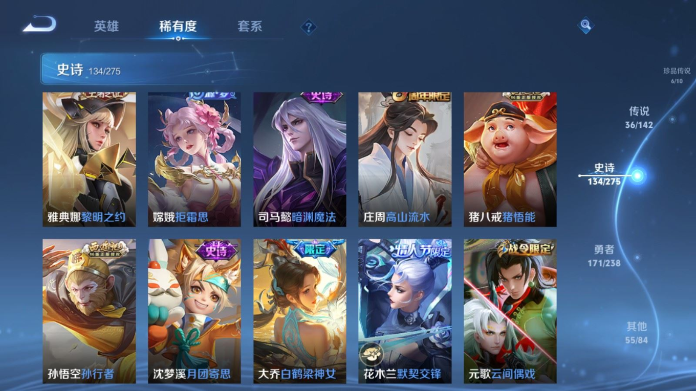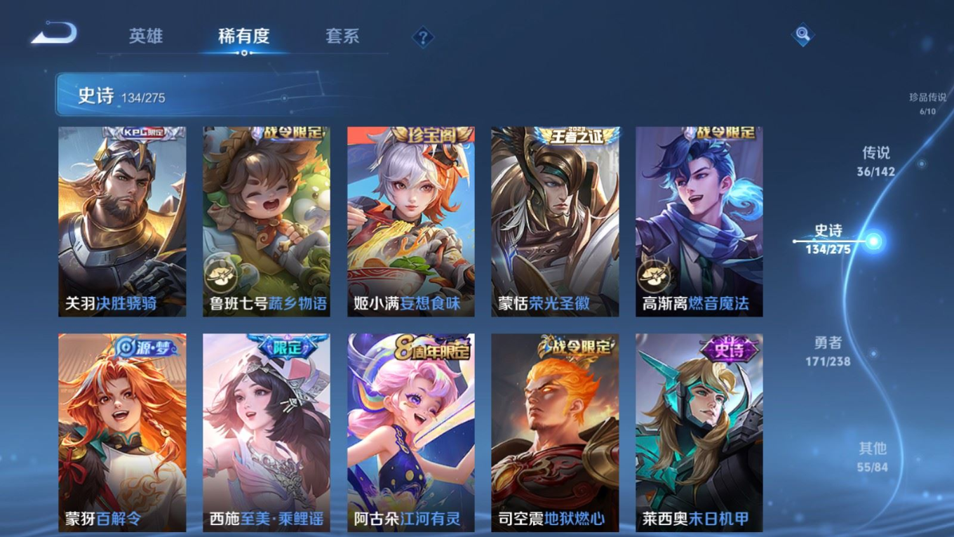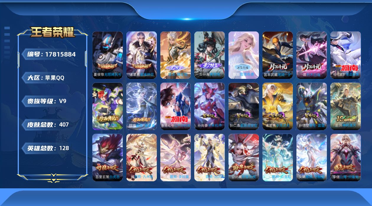 贵族等级:v9皮肤数:407生肖限定12 传说品质36 情人节限定4 荣耀典藏2 珍品传说6 无双3 英雄数:128
