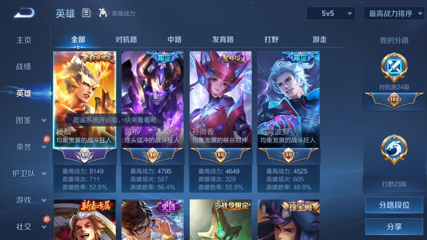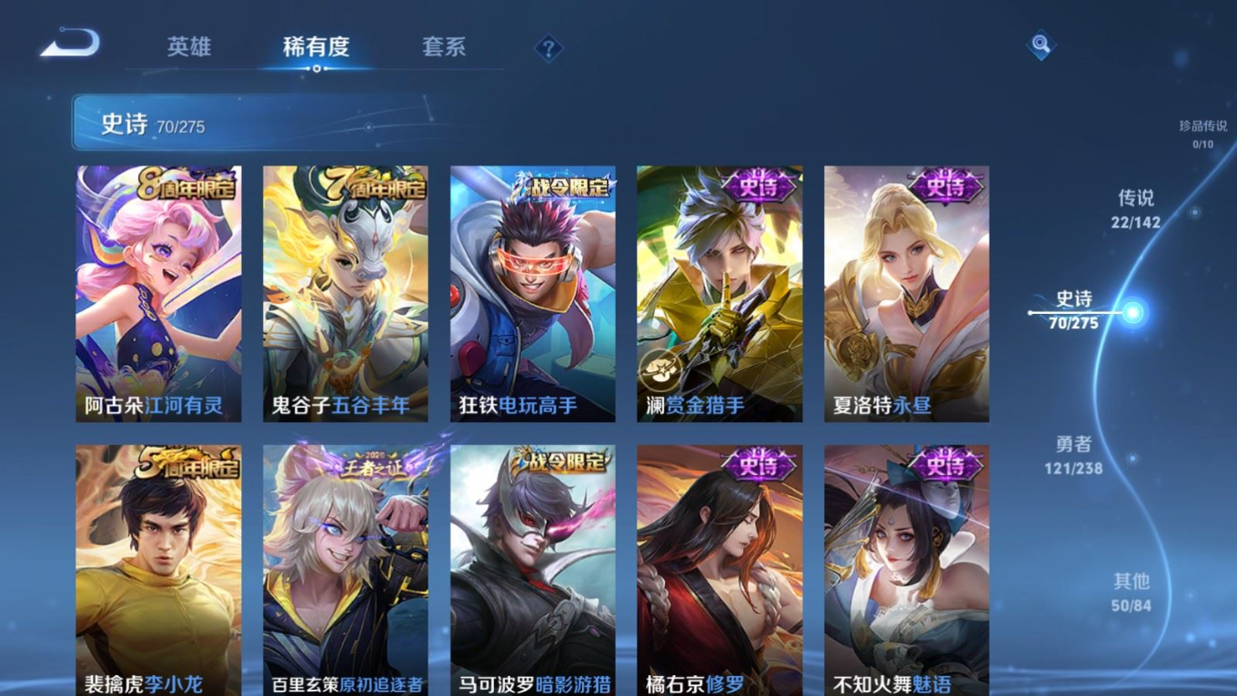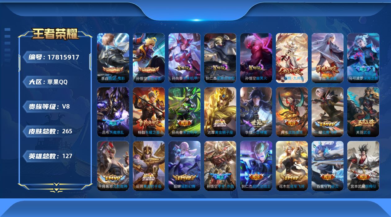 贵族等级:v8皮肤数:265生肖限定7 传说品质22 情人节限定2 荣耀典藏2 英雄数:127