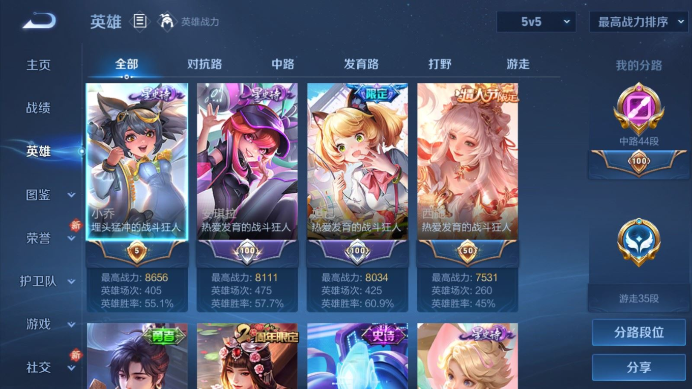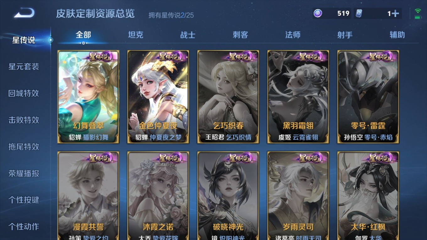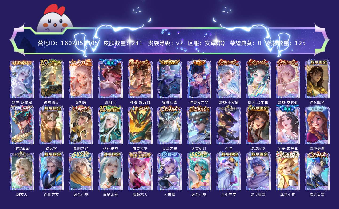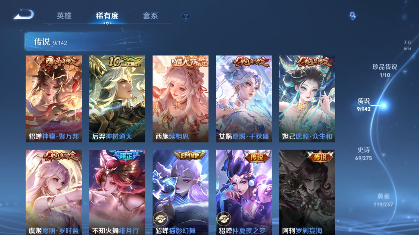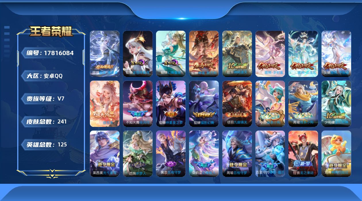 贵族等级:v7皮肤数:241传说品质9 情人节限定1 生肖限定5 珍品传说1 英雄数:125
