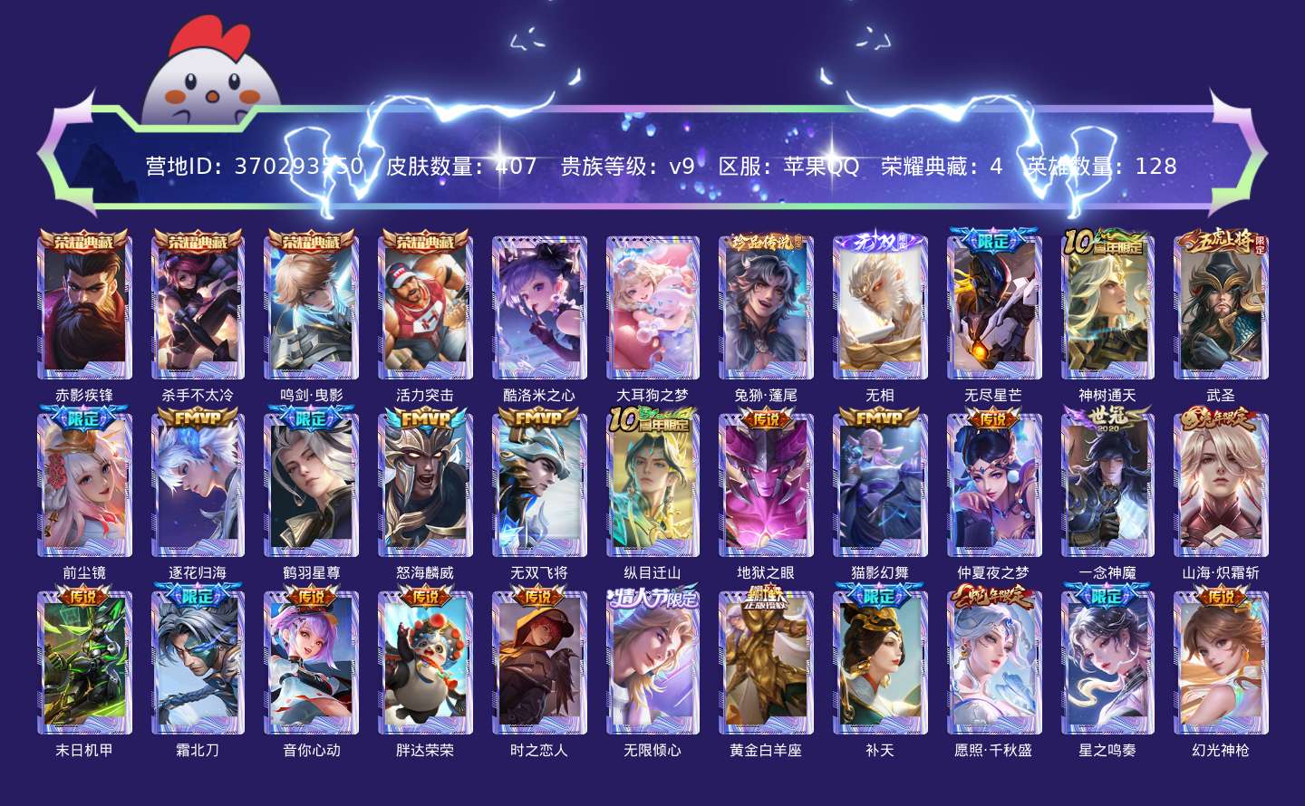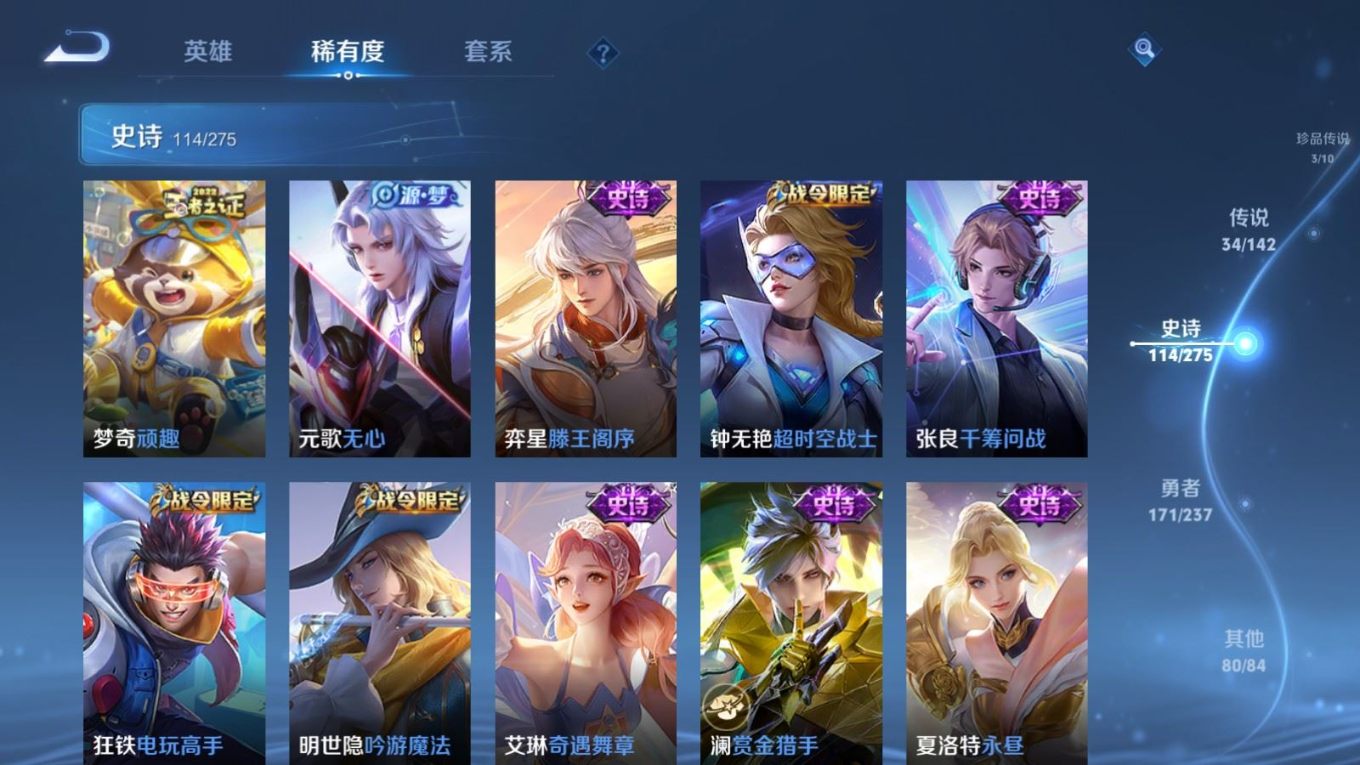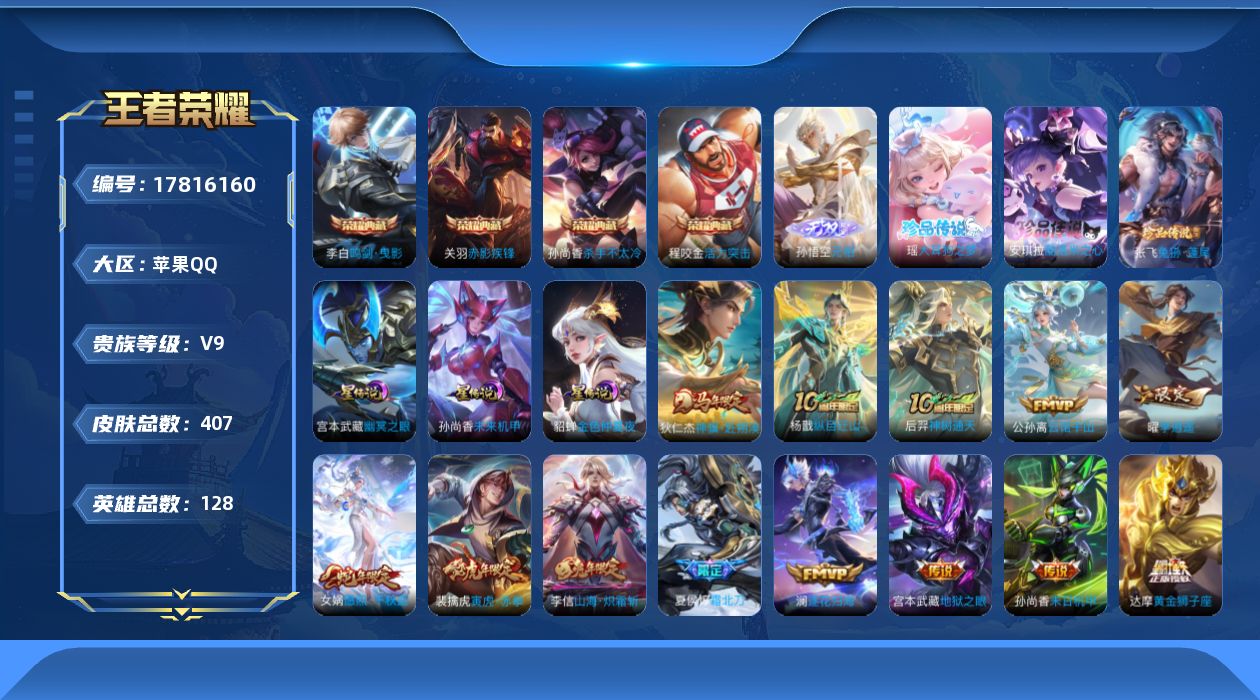 传说品质_后羿_无尽星芒传说品质_后羿_神树通天传说品质_关羽_武圣传说品质_娜可露露_前尘镜传说品质_澜_逐花归海传说品质_诸葛亮_鹤羽星尊传说品质_吕布_怒海麟威传说品质_马超_无双飞将传说品质_杨戬_纵目迁山传说品质_宫本武藏_地狱之眼传说品质_貂蝉_猫影幻舞传说品质_貂蝉_仲夏夜之梦传说品质_李信_一念神魔传说品质_李信_山海·炽霜斩传说品质_孙尚香_末日机甲传说品质_夏侯惇_霜北刀传说品质_小乔_音你心动传说品质_梦奇_胖达荣荣传说品质_刘备_时之恋人传说品质_项羽_无限倾心传说品质_张良_黄金白羊座传说品质_女娲_补天传说品质_女娲_愿照·千秋盛传说品质_杨玉环_星之鸣奏传说品质_云缨_幻光神枪传说品质_公孙离_云诺千山传说品质_曜_云鹰飞将传说品质_曜_李逍遥 传说品质_狄仁杰_神骥·赴朔漠传说品质_达摩_黄金狮子座传说品质_虞姬_无限倾心传说品质_虞姬_启明星使传说品质_李元芳_飞鸢探春传说品质_裴擒虎_寅虎·赤拳