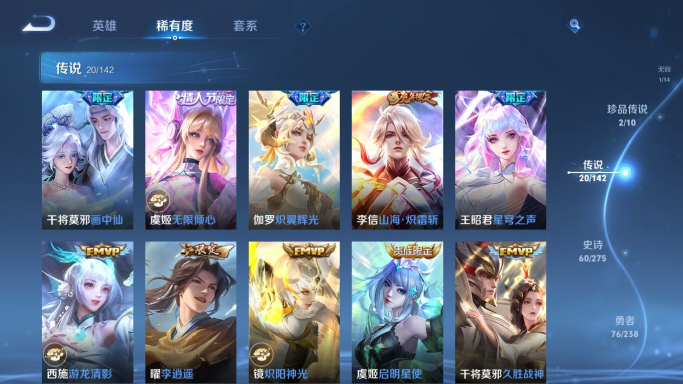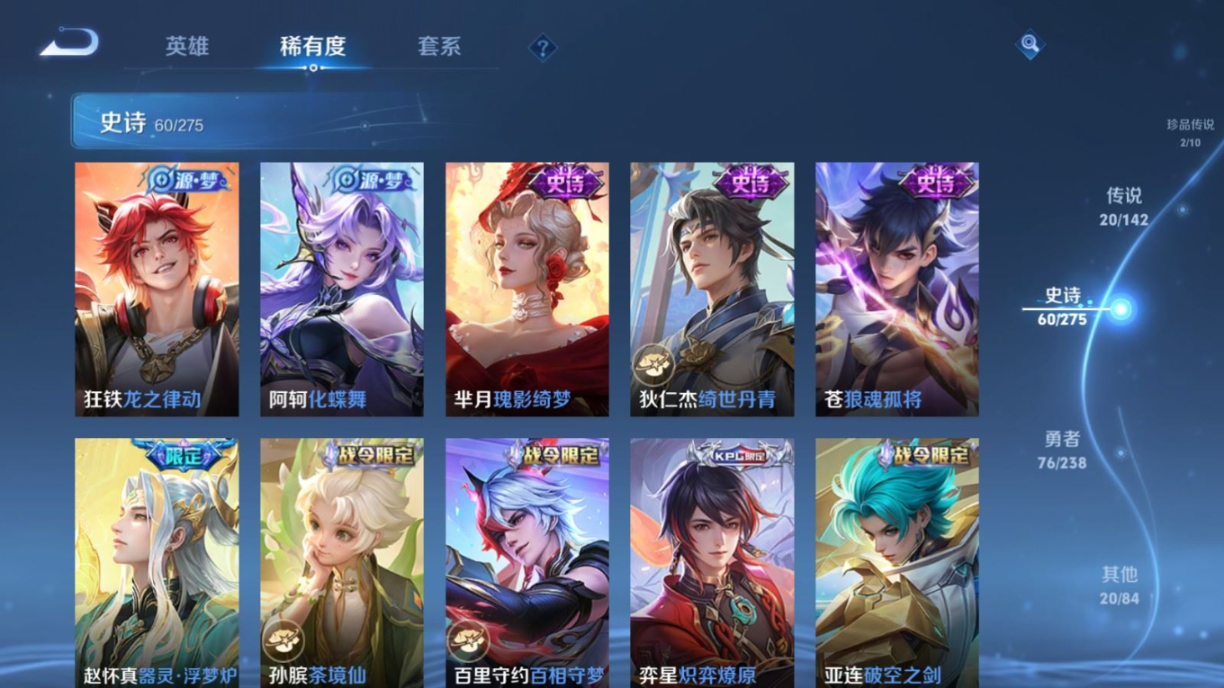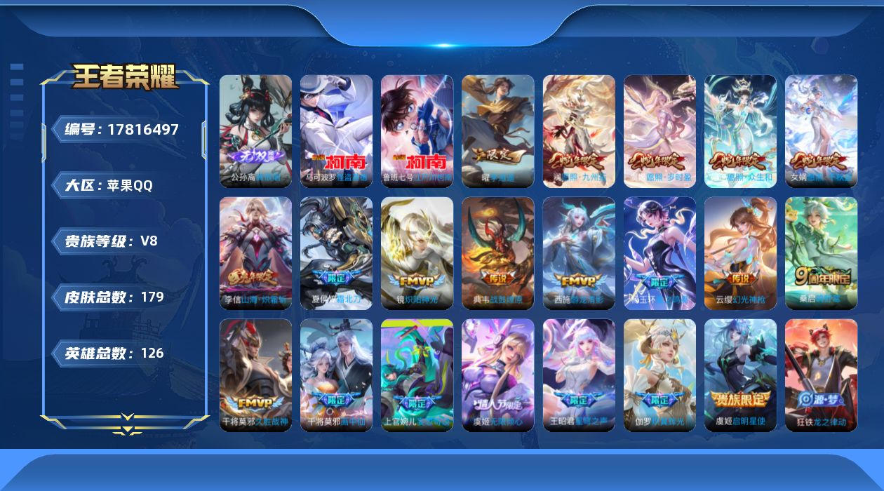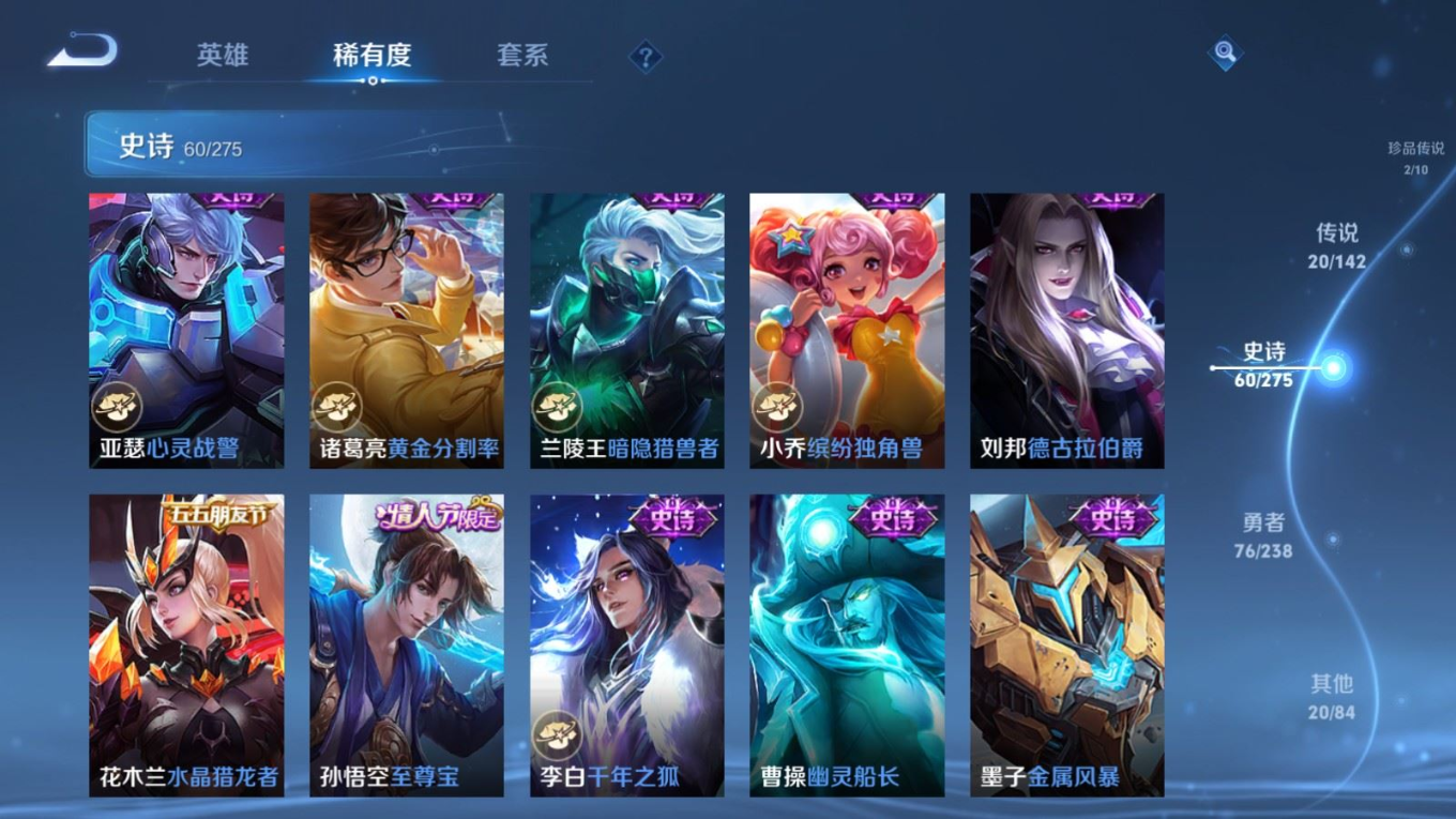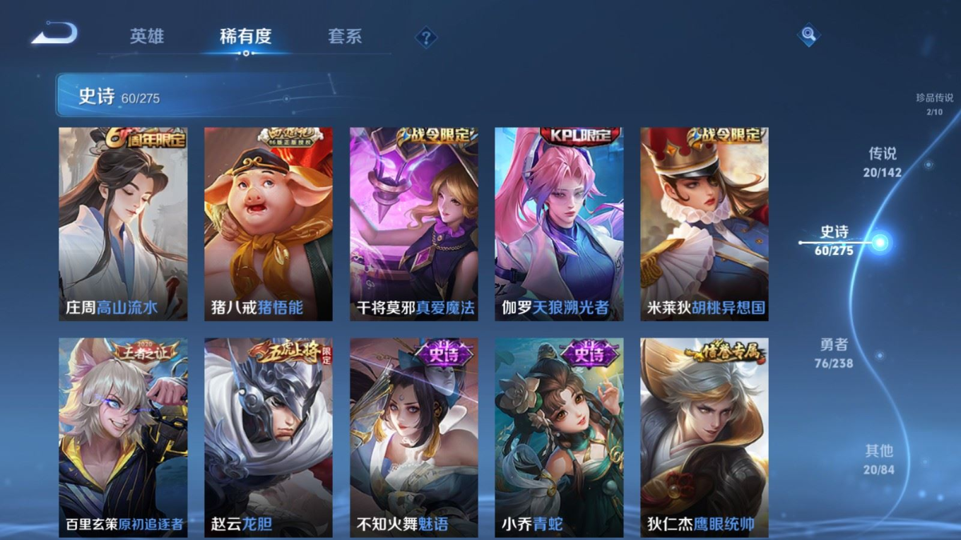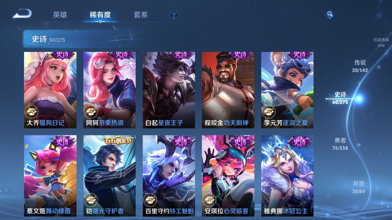 贵族等级:v8皮肤数:179传说品质20 生肖限定6 情人节限定2 珍品传说2 无双1 英雄数:126