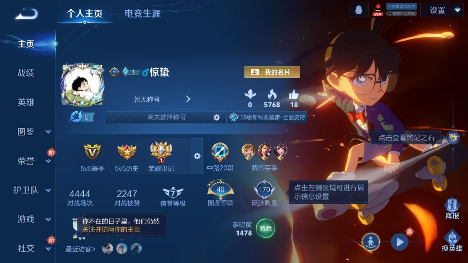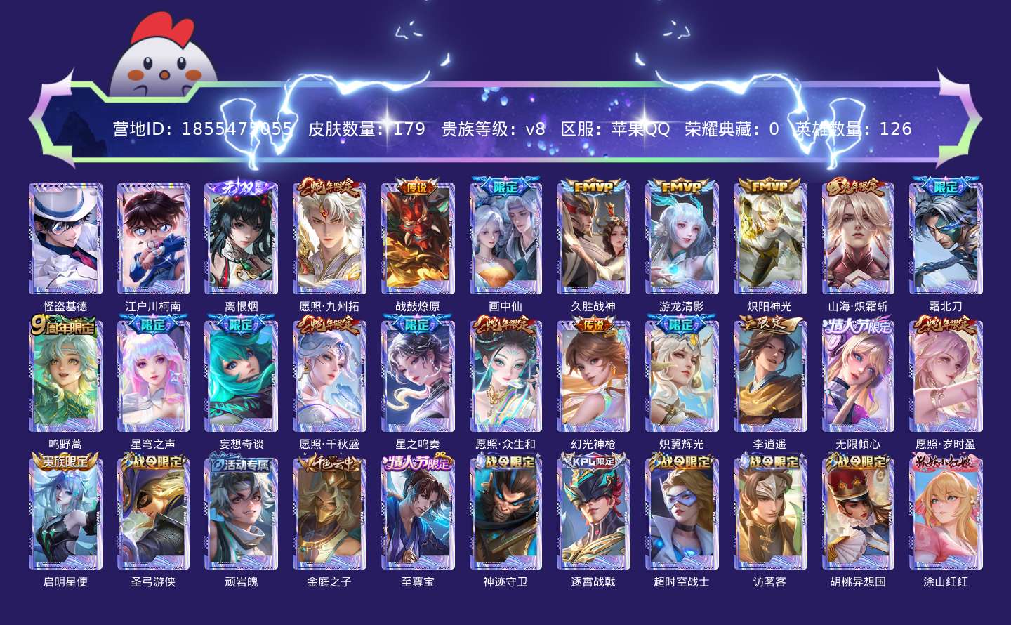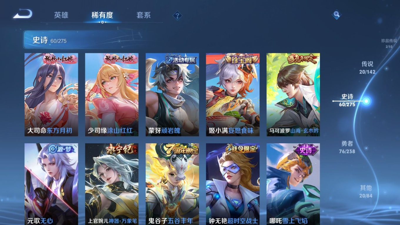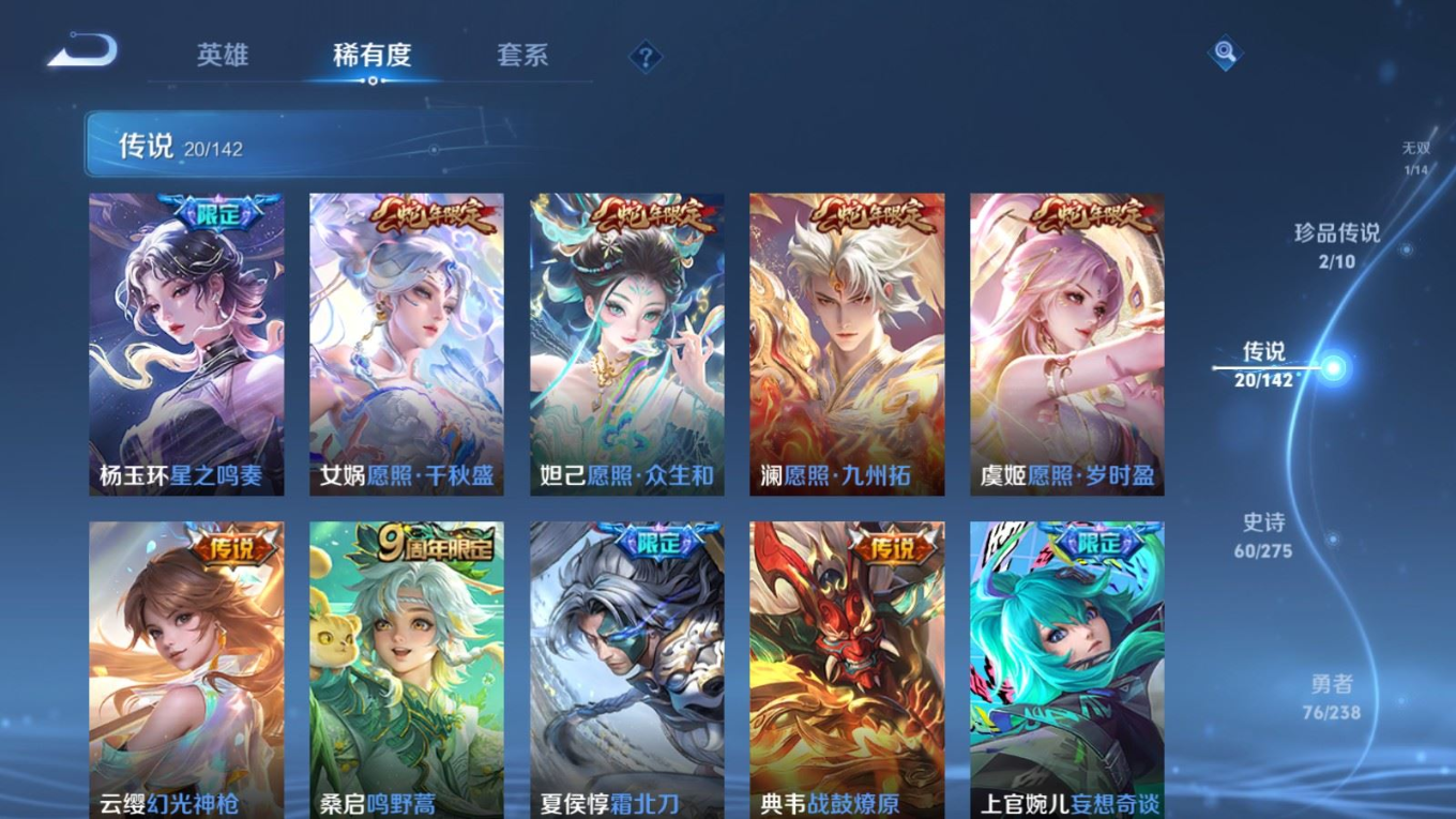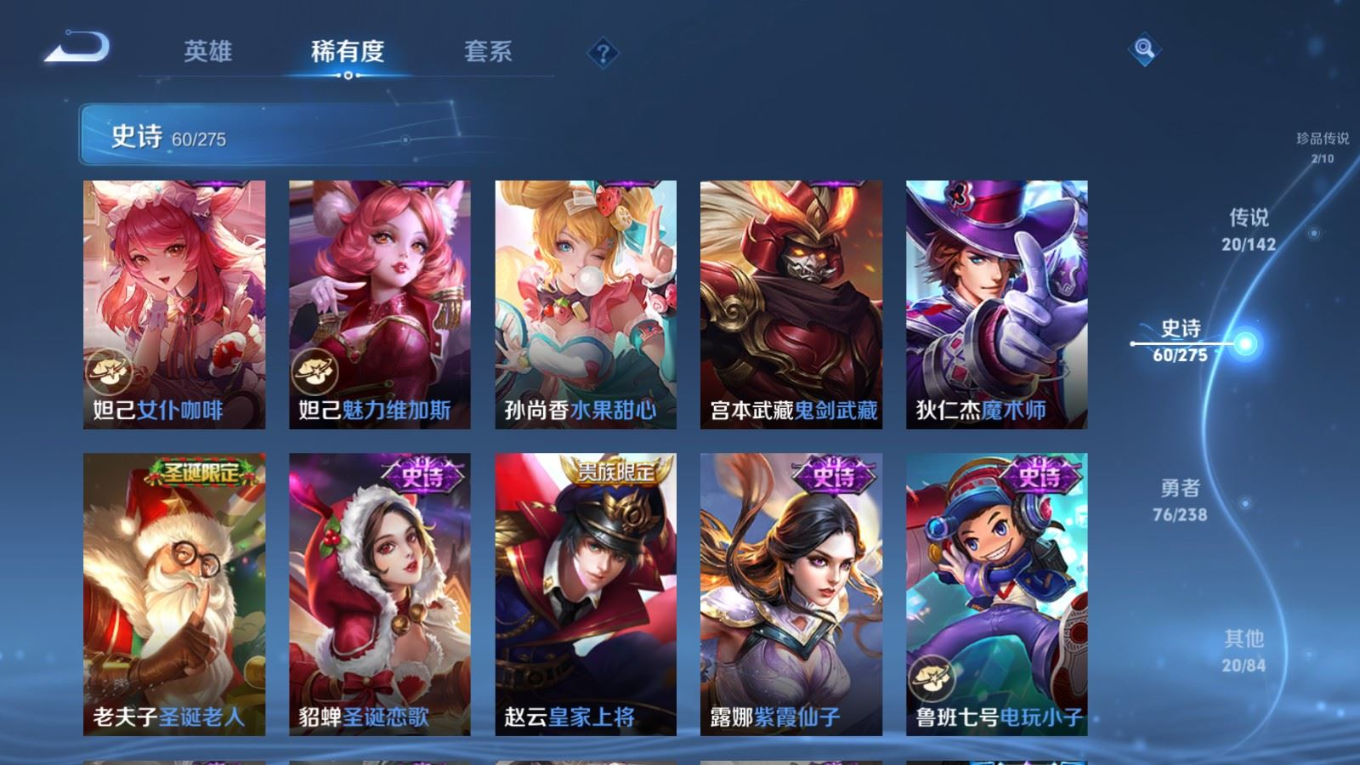 贵族等级:v8皮肤数:179传说品质20 生肖限定6 情人节限定2 珍品传说2 无双1 英雄数:126