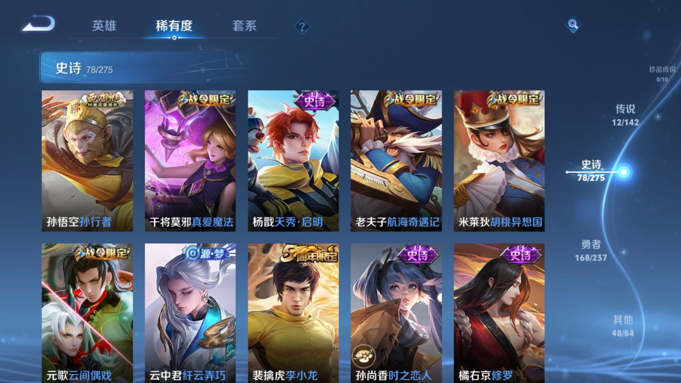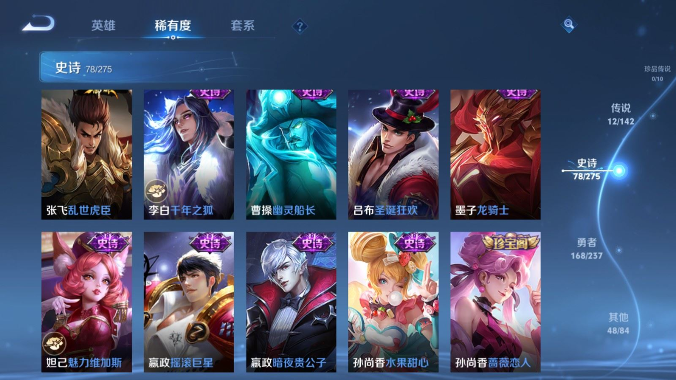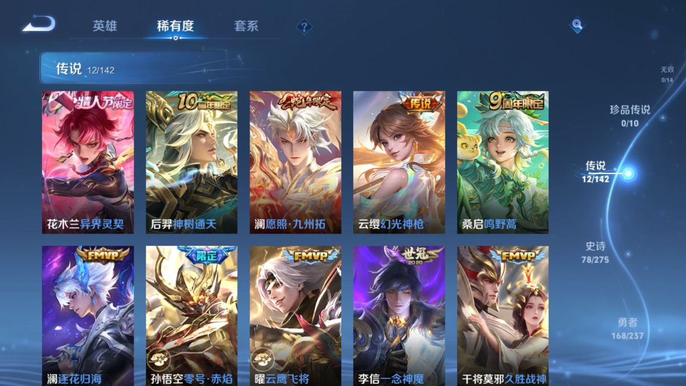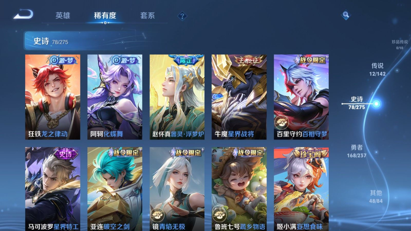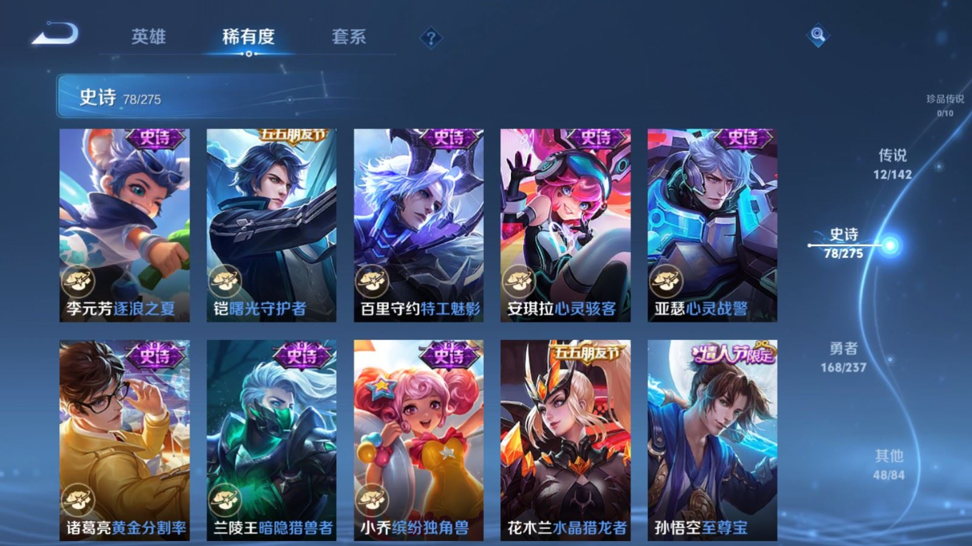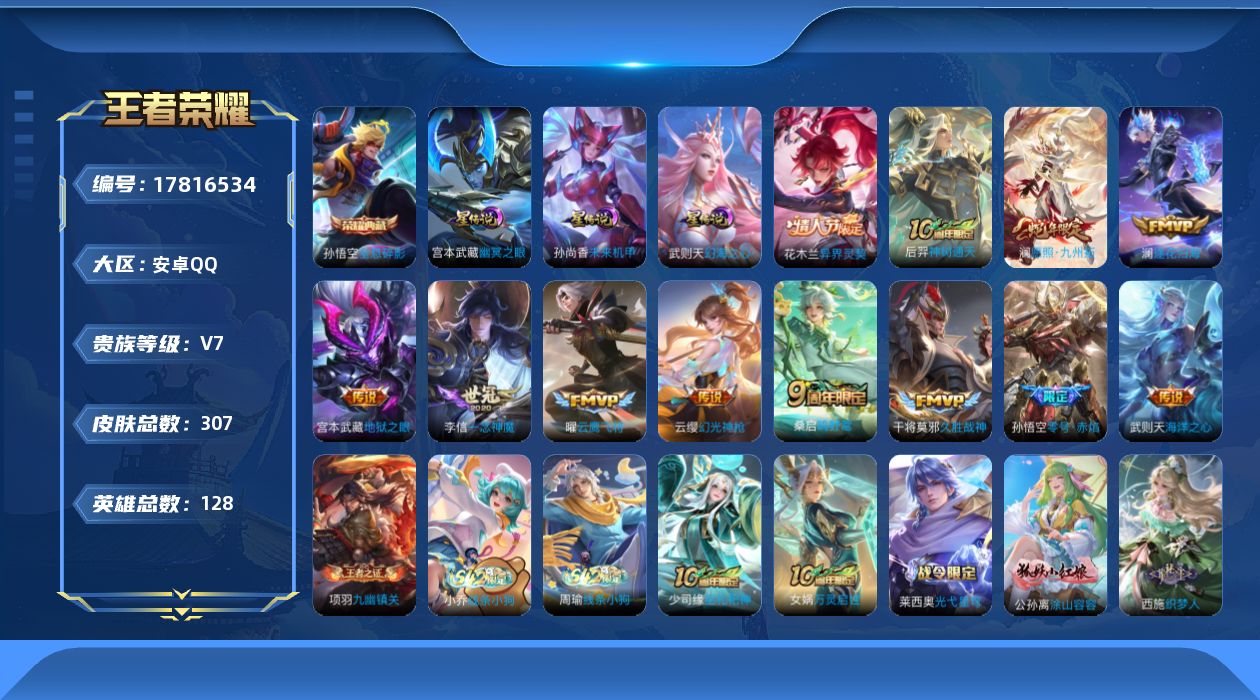 贵族等级:v7皮肤数:307传说品质12 生肖限定3 情人节限定2 荣耀典藏1 英雄数:128