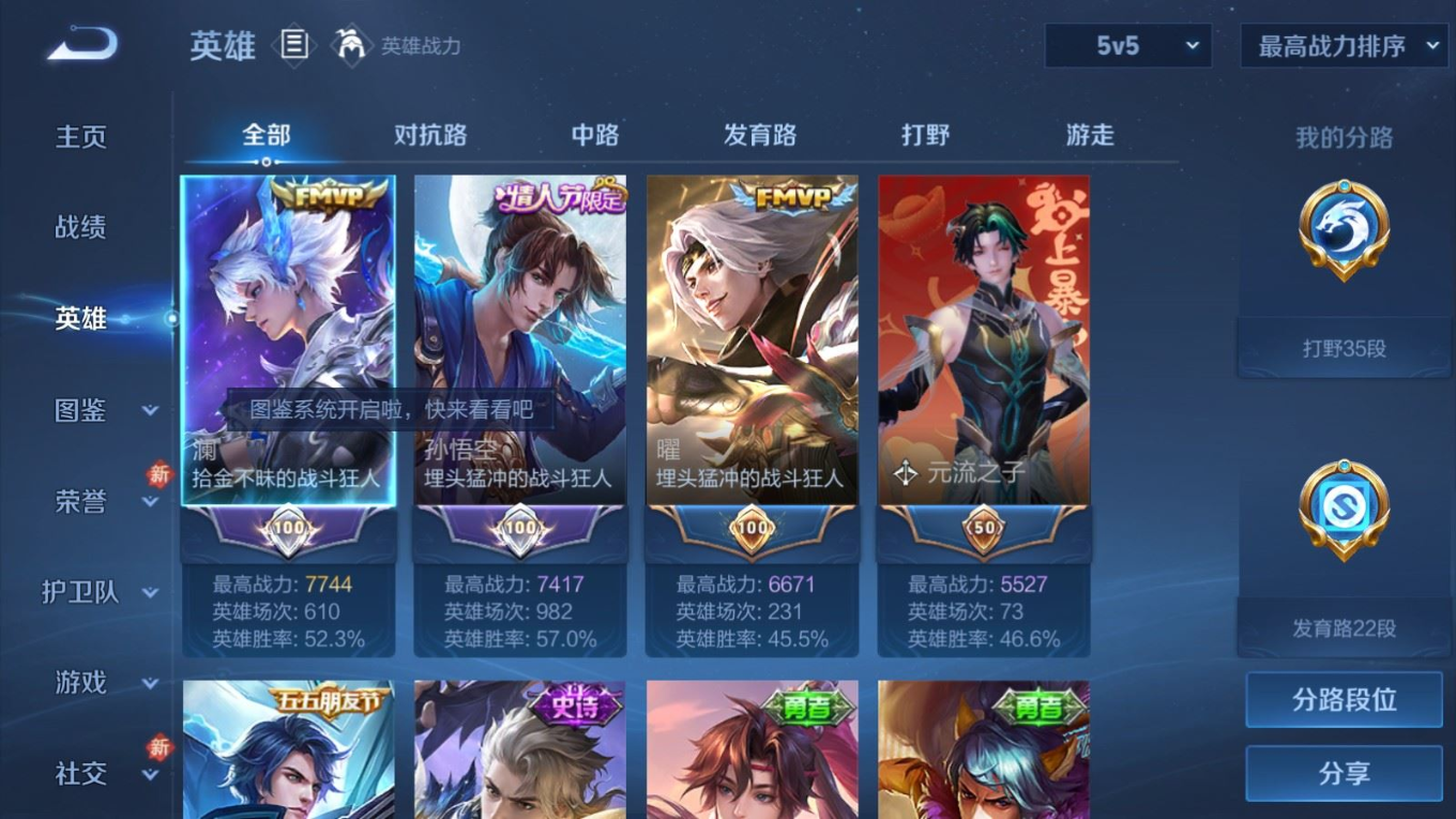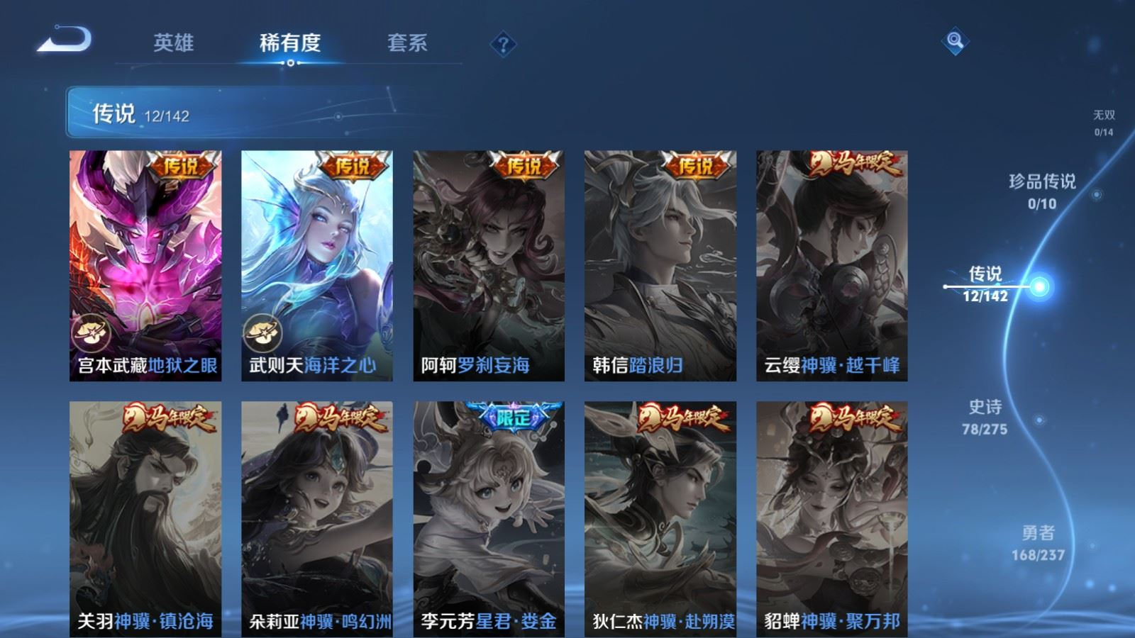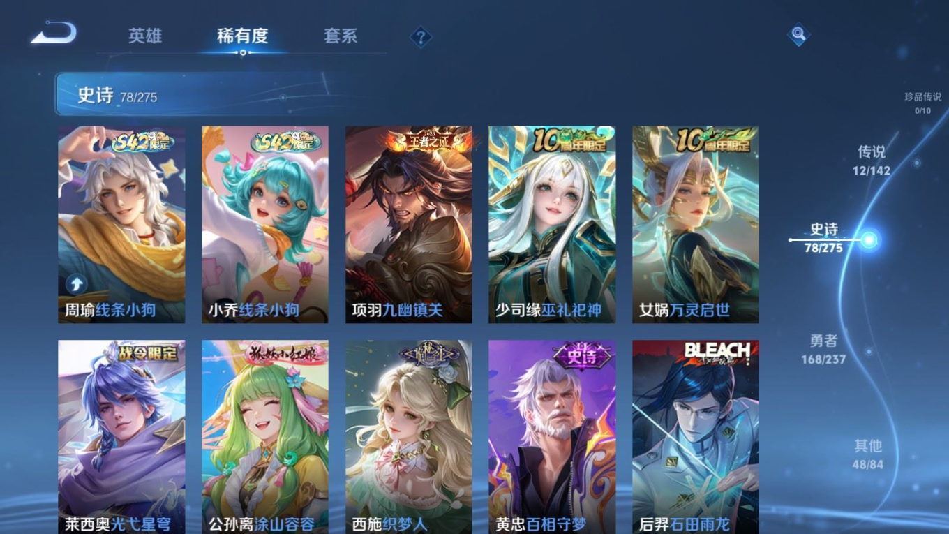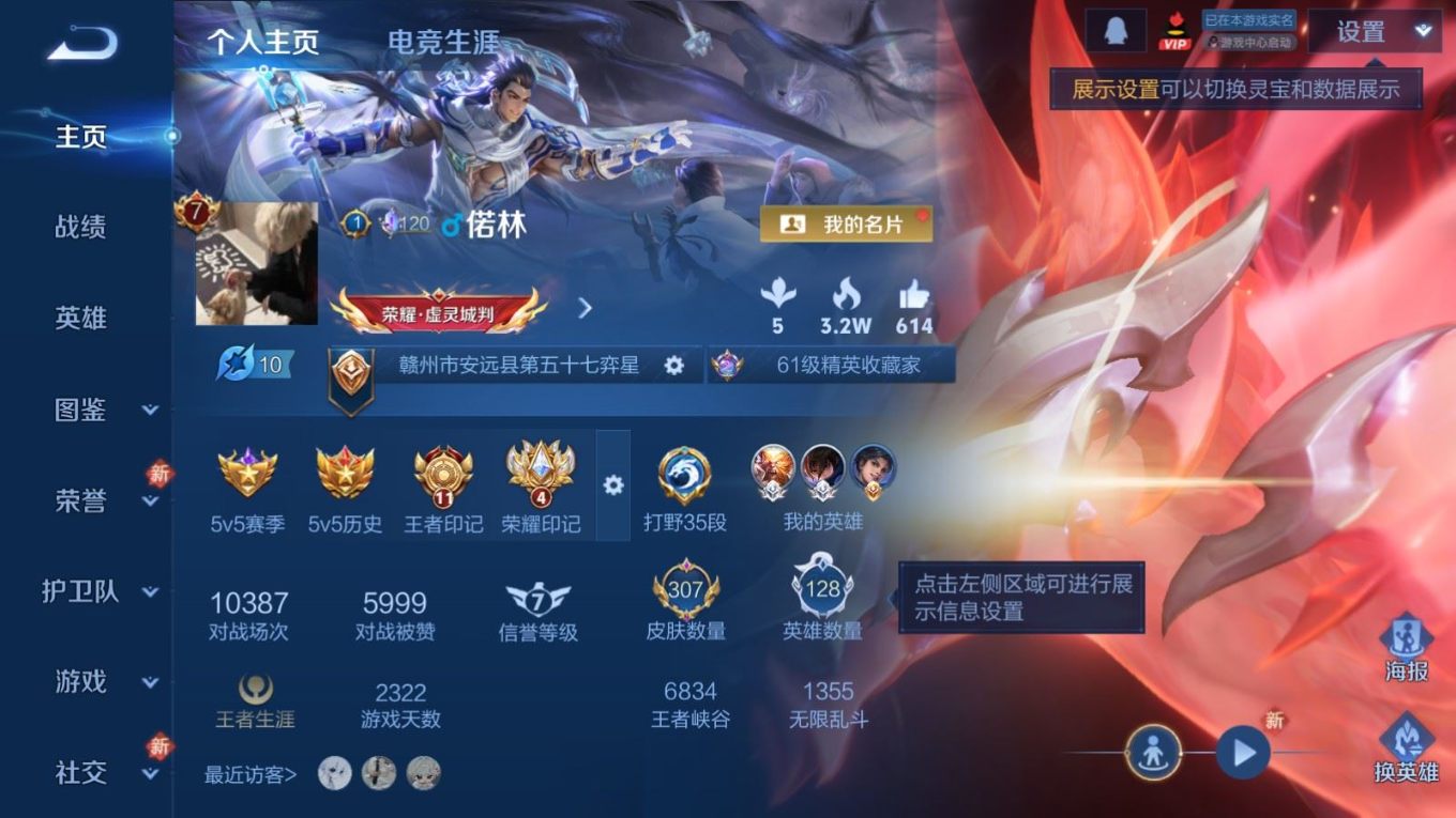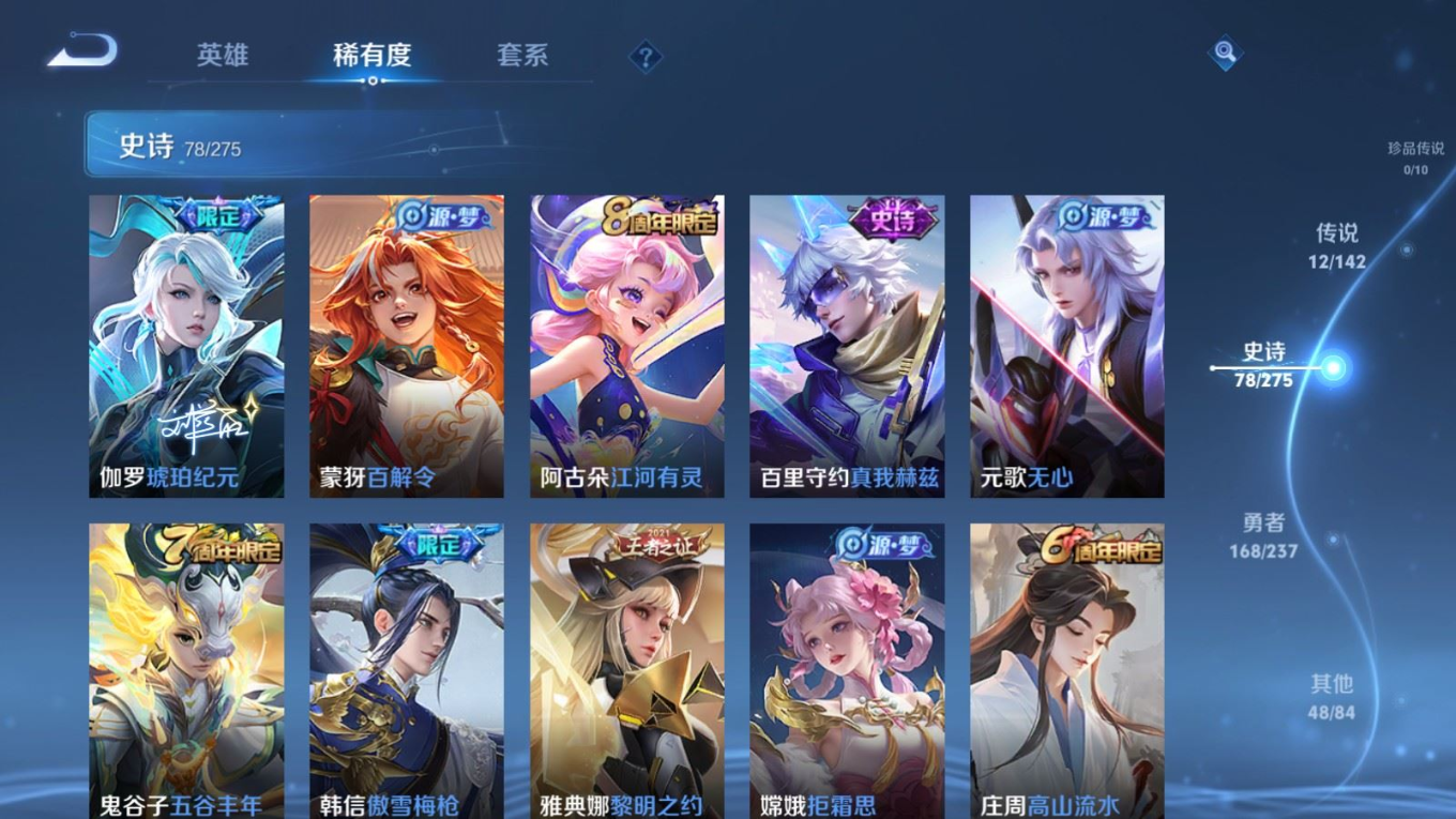 贵族等级:v7皮肤数:307传说品质12 生肖限定3 情人节限定2 荣耀典藏1 英雄数:128