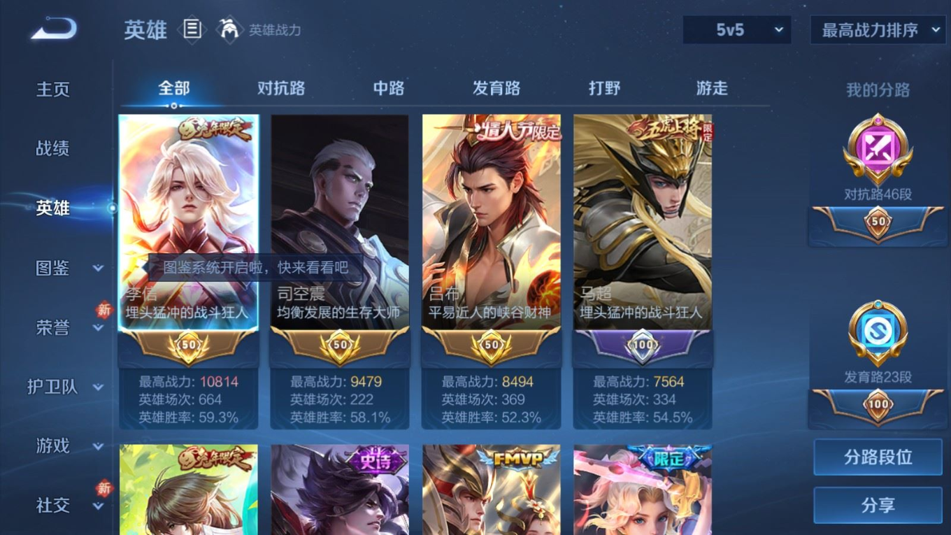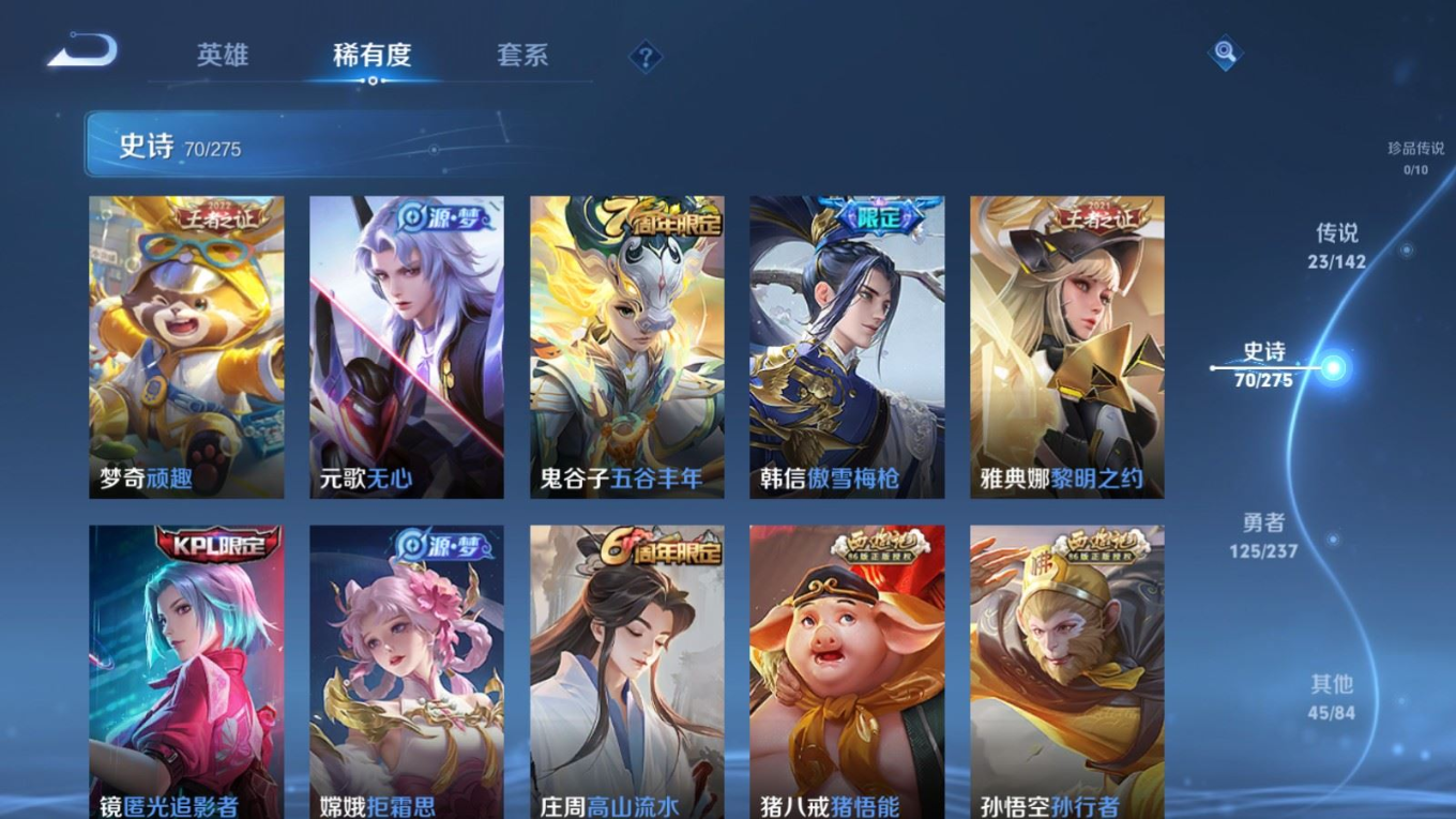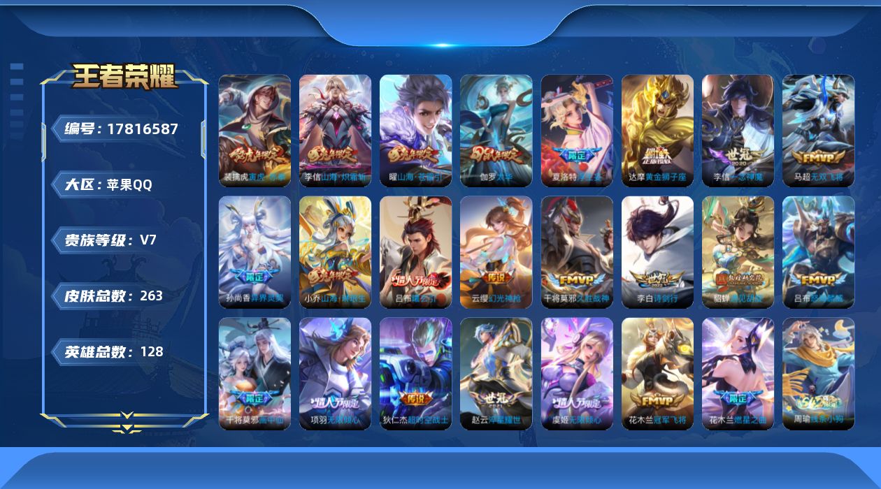 贵族等级:v7皮肤数:263生肖限定9 情人节限定5 传说品质23 英雄数:128