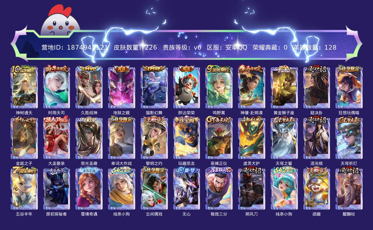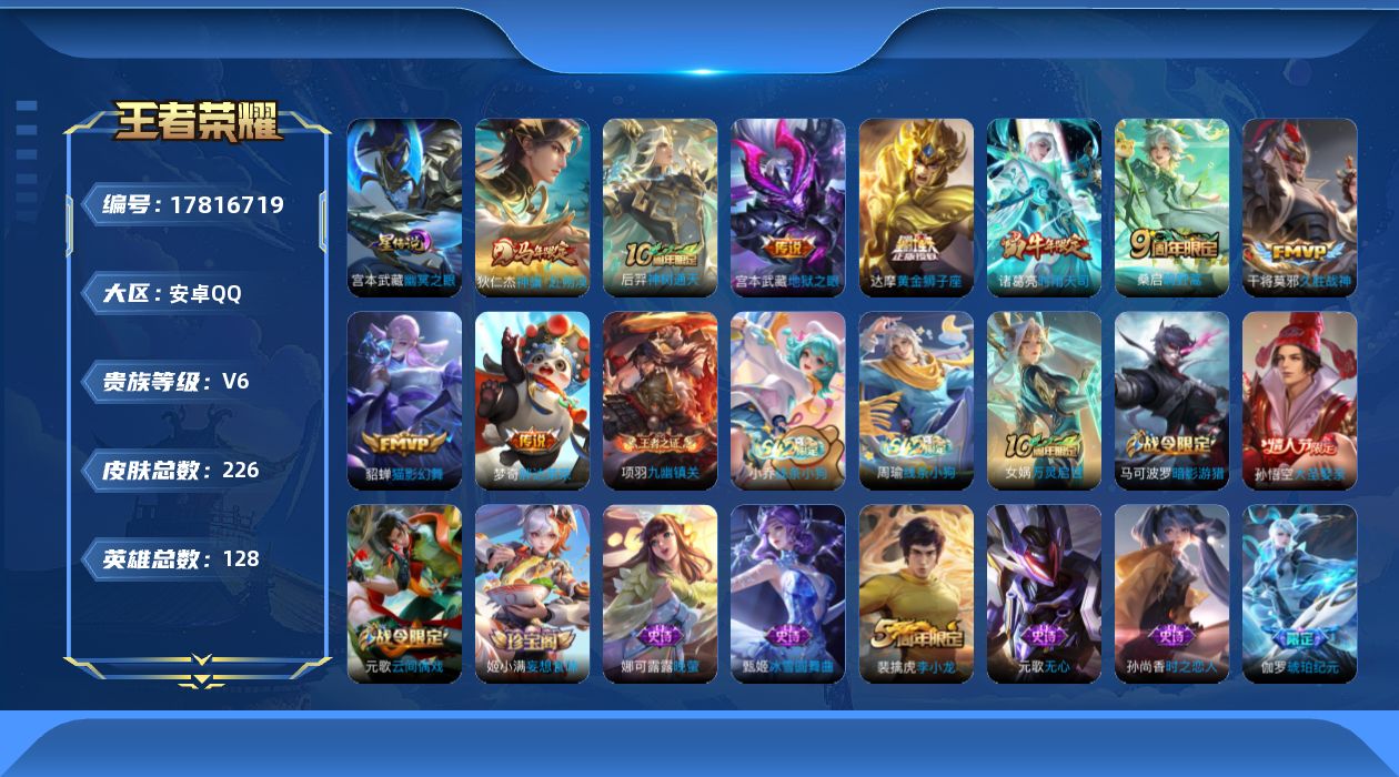 贵族等级:v6皮肤数:226传说品质9 生肖限定2 情人节限定1 英雄数:128