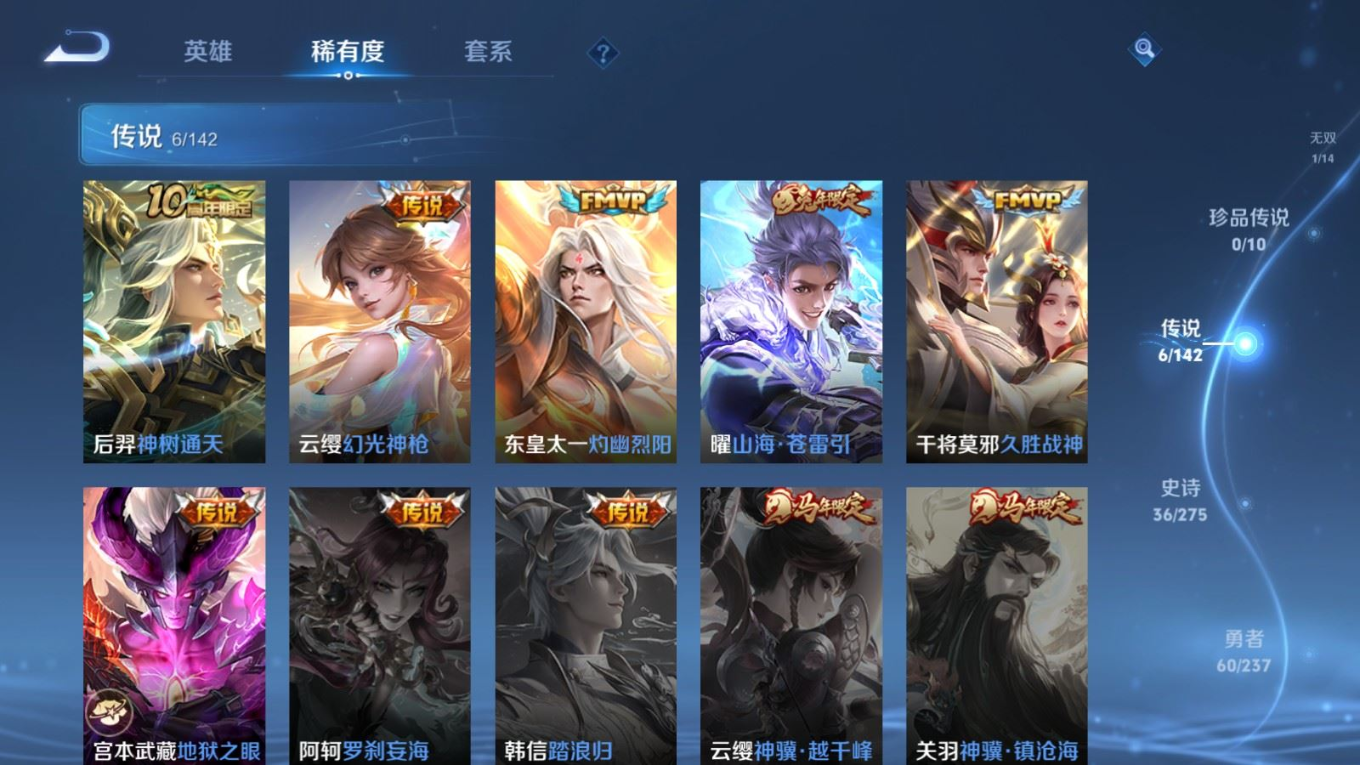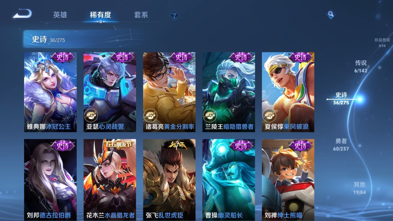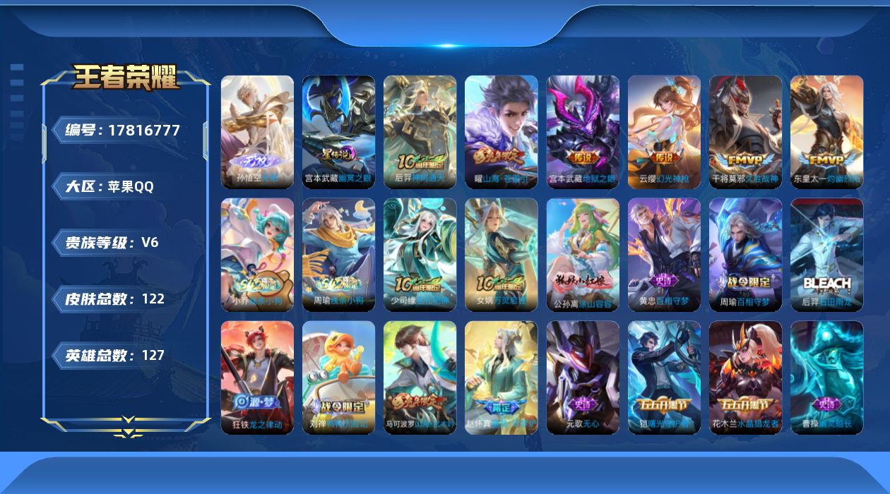 贵族等级:v6皮肤数:122传说品质6 无双1 生肖限定2 英雄数:127