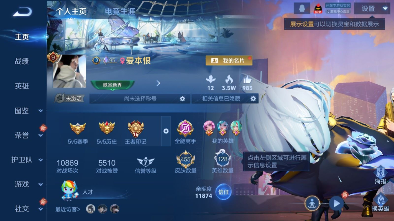 贵族等级:v9皮肤数:455传说品质38 生肖限定15 荣耀典藏3 情人节限定3 无双2 珍品传说2 英雄数:128