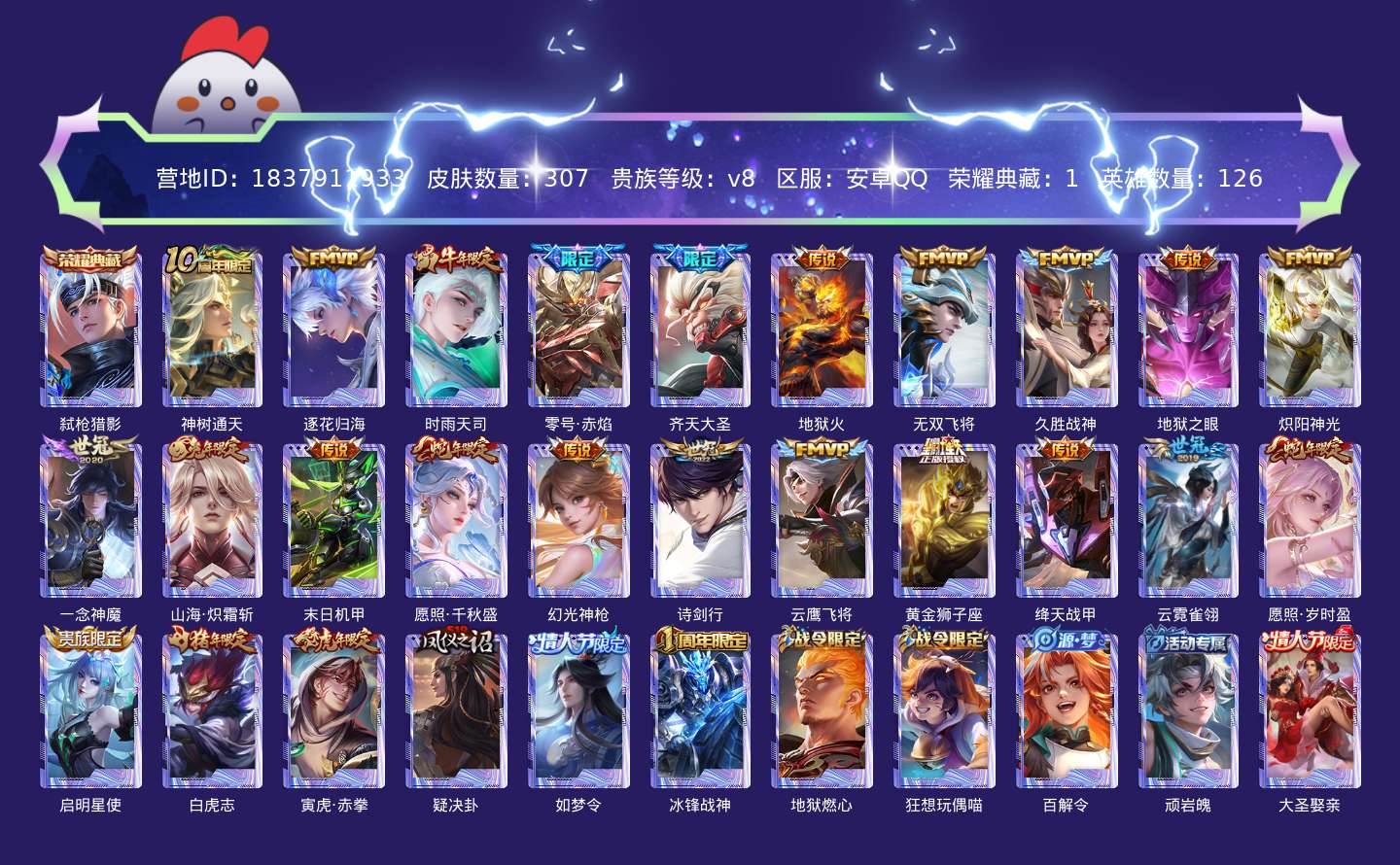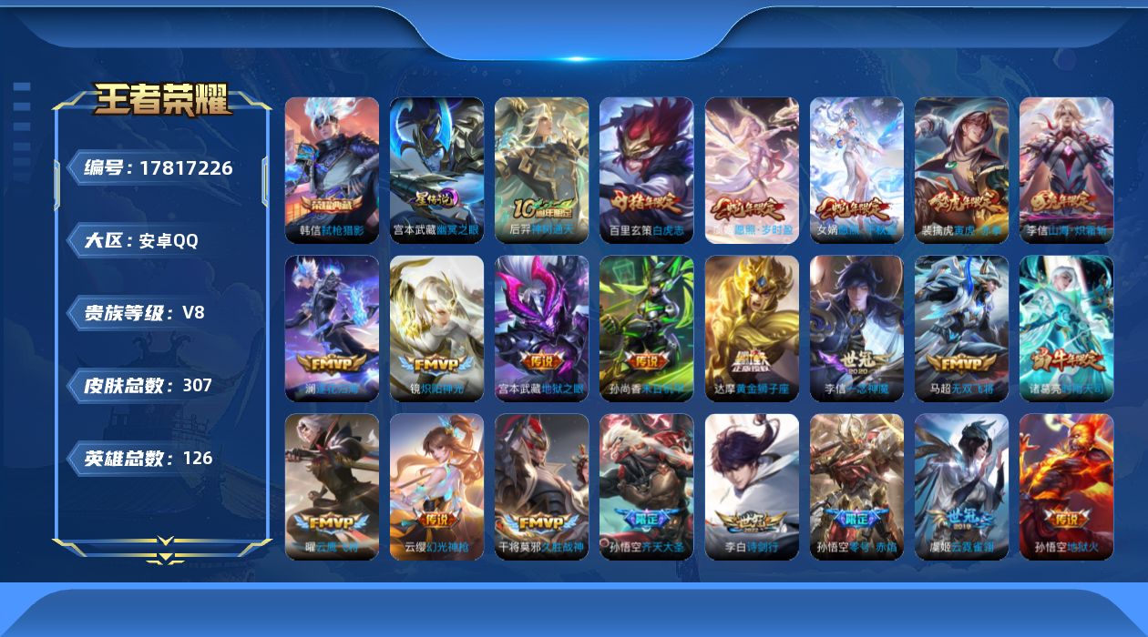 贵族等级:v8皮肤数:307情人节限定3 传说品质24 生肖限定10 荣耀典藏1 英雄数:126