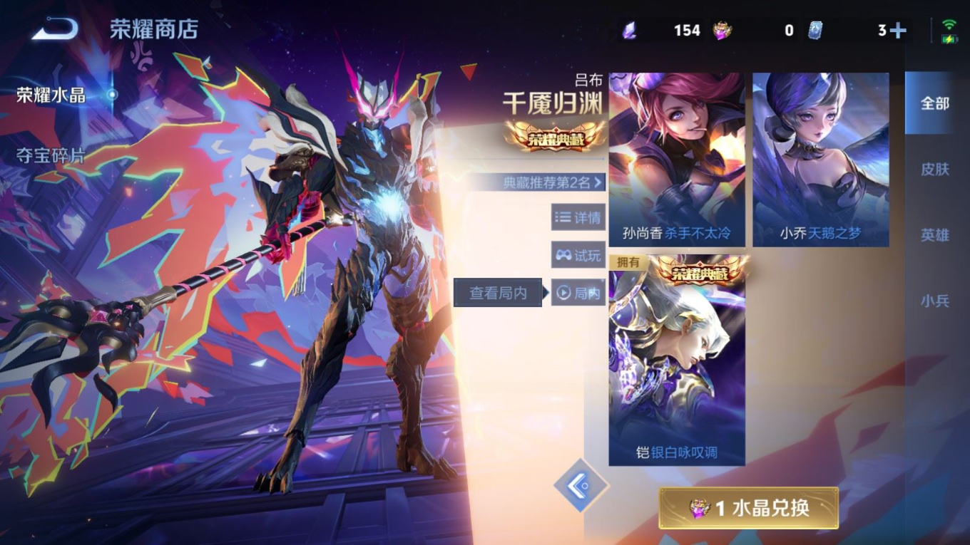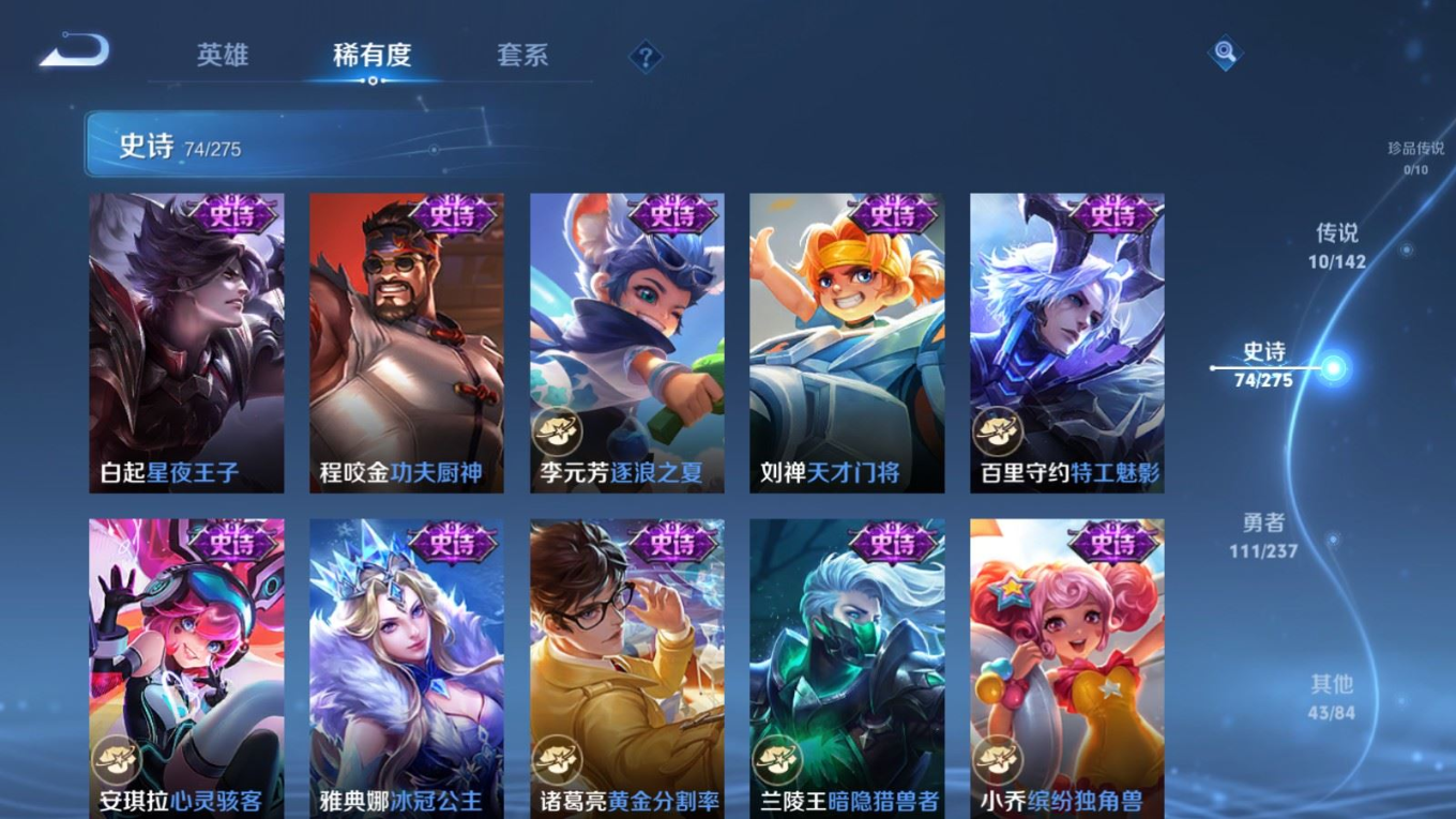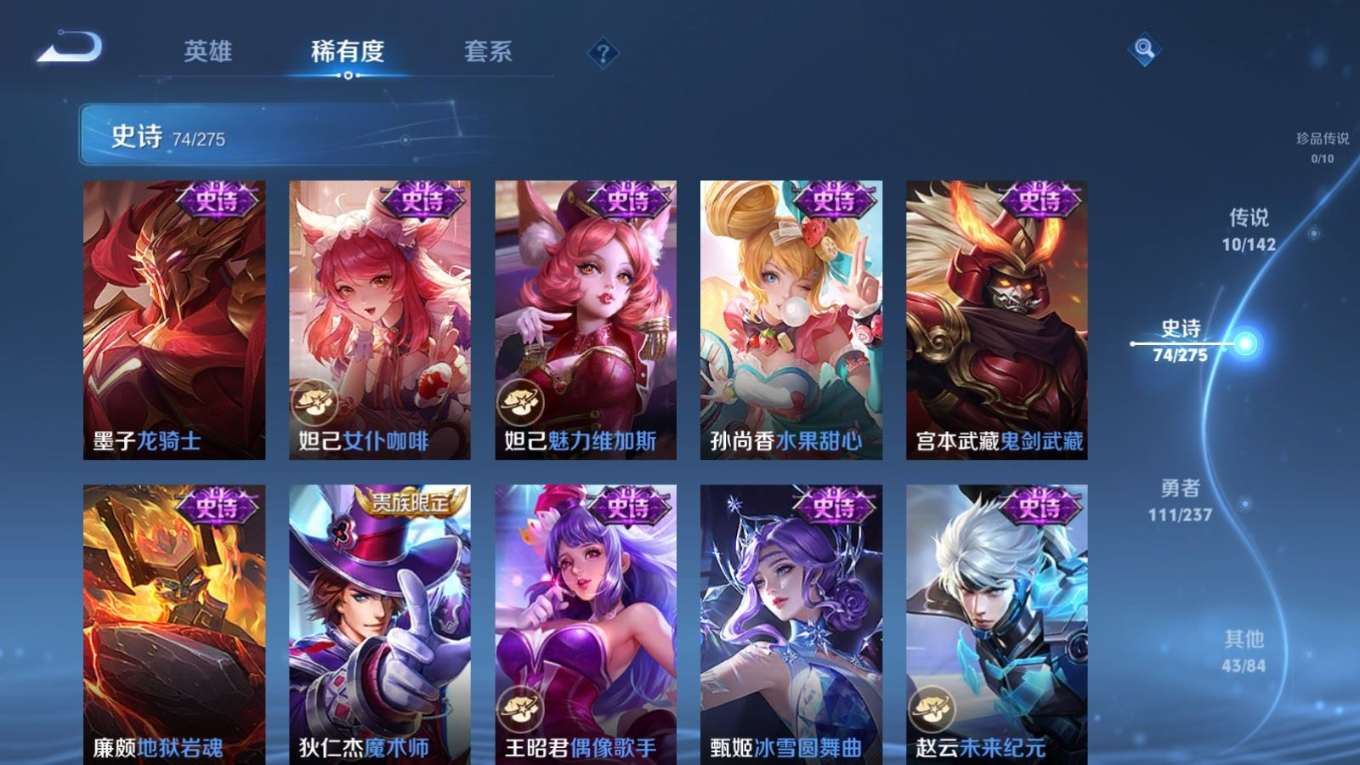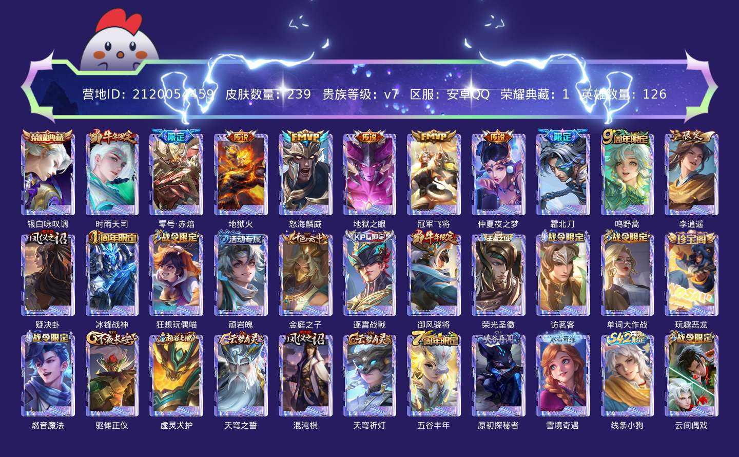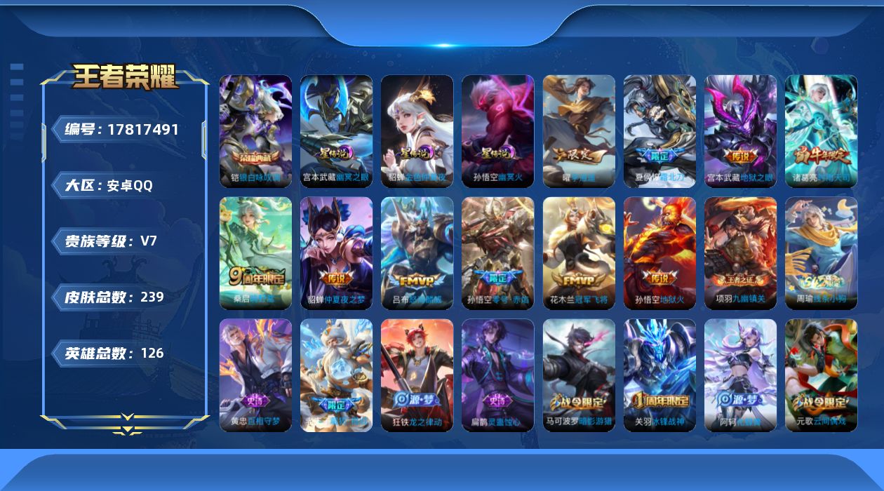 贵族等级:v7皮肤数:239传说品质10 生肖限定2 荣耀典藏1 英雄数:126