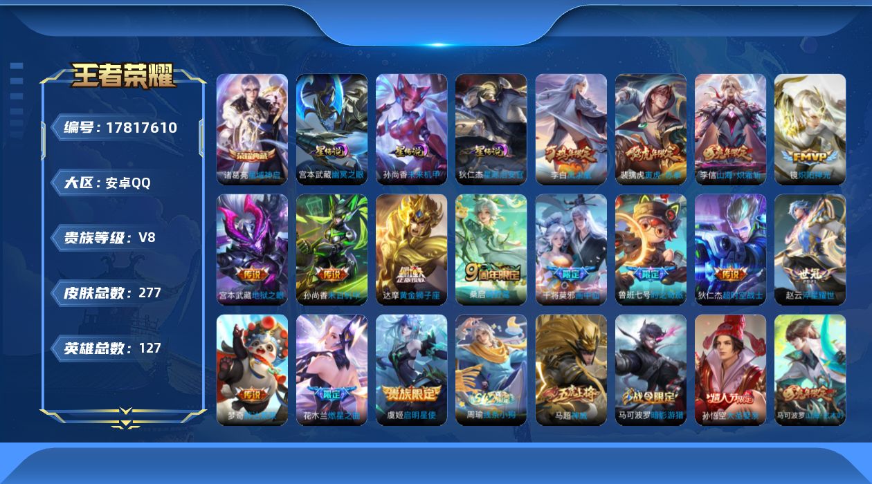 贵族等级:v8皮肤数:277情人节限定2 荣耀典藏1 传说品质15 生肖限定4 英雄数:127