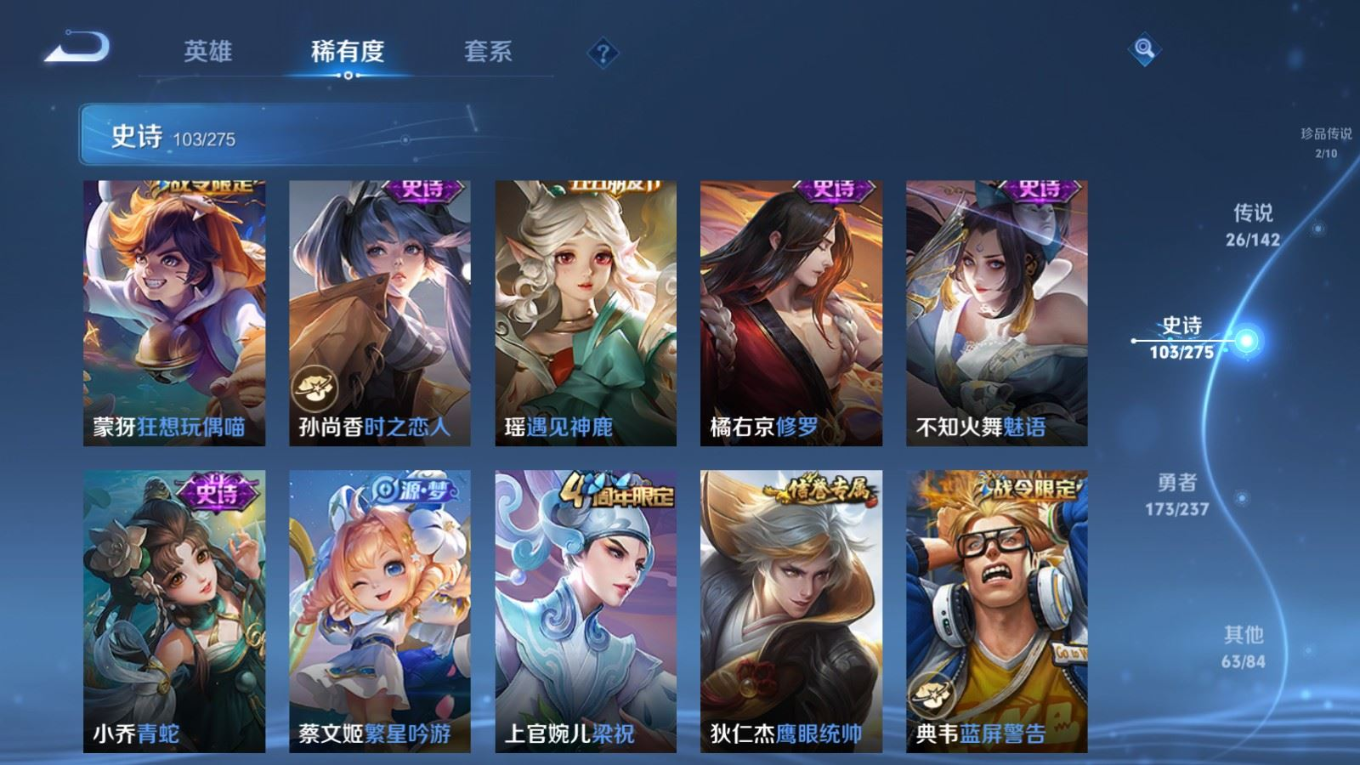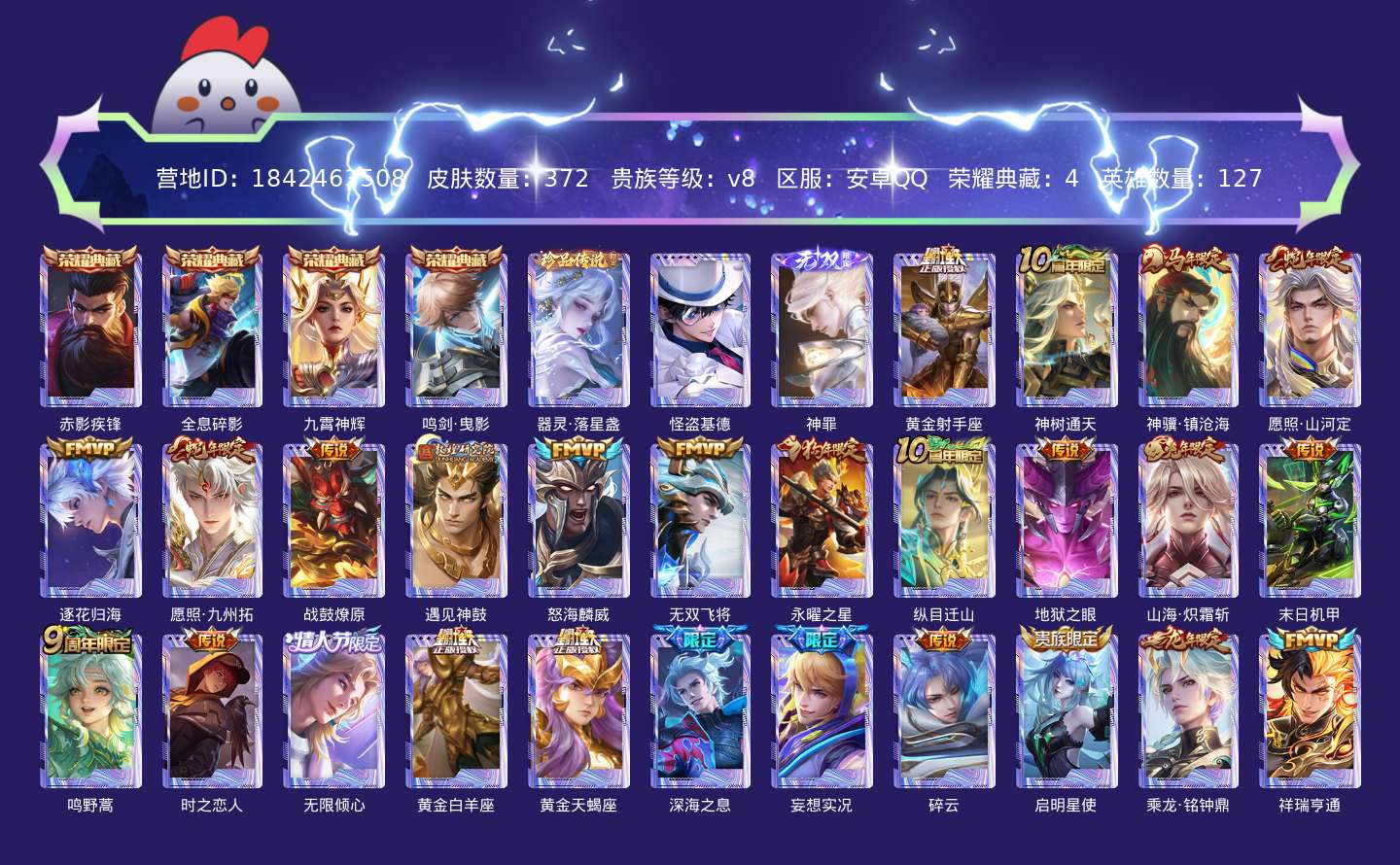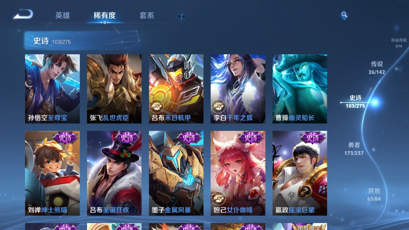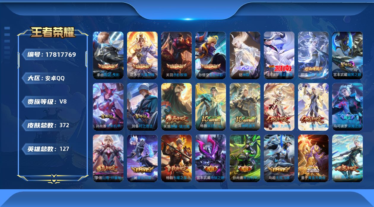 贵族等级:v8皮肤数:372传说品质26 生肖限定6 荣耀典藏4 情人节限定3 珍品传说2 无双1 英雄数:127