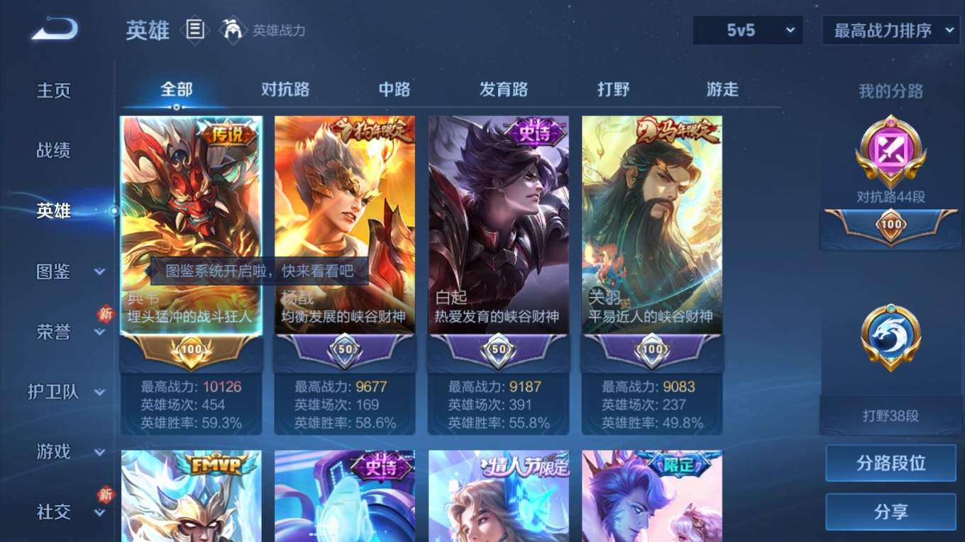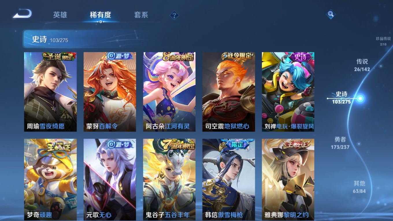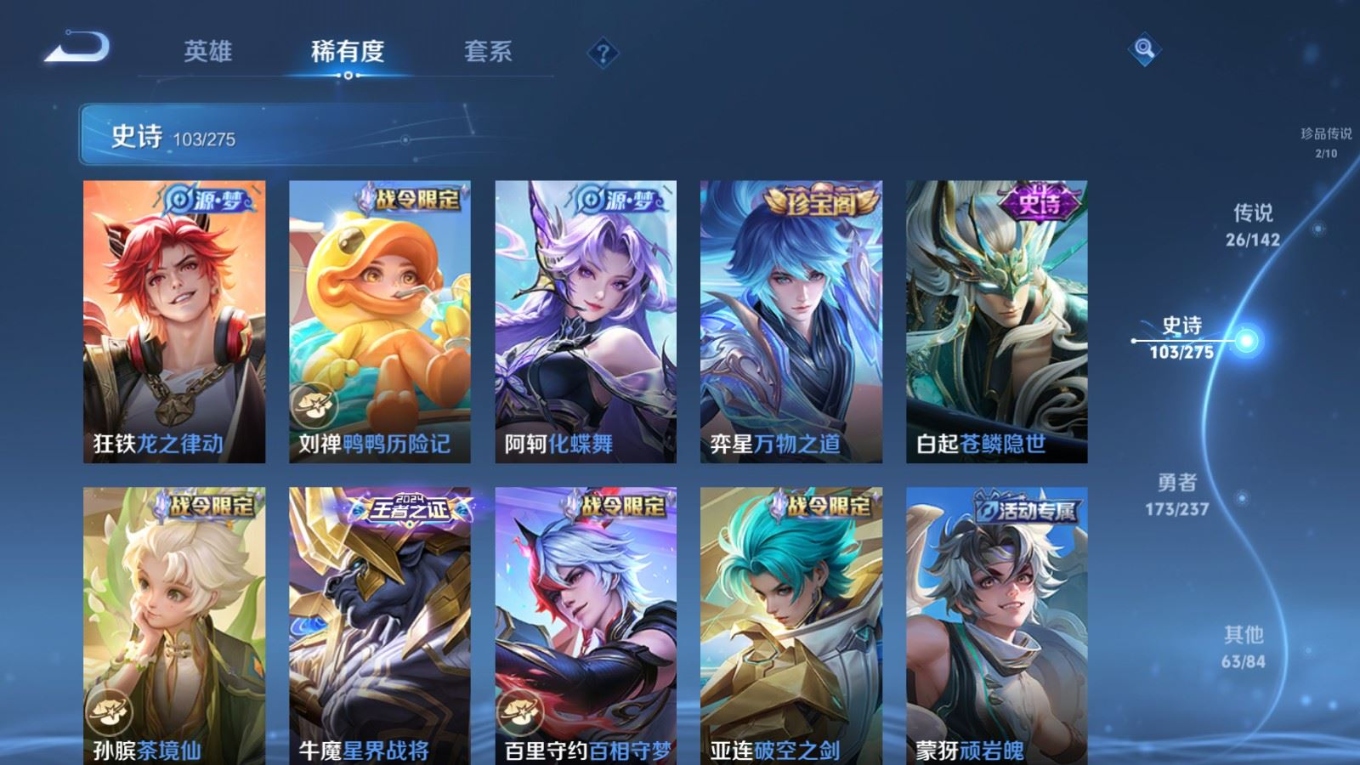贵族等级:v8皮肤数:372传说品质26 生肖限定6 荣耀典藏4 情人节限定3 珍品传说2 无双1 英雄数:127
