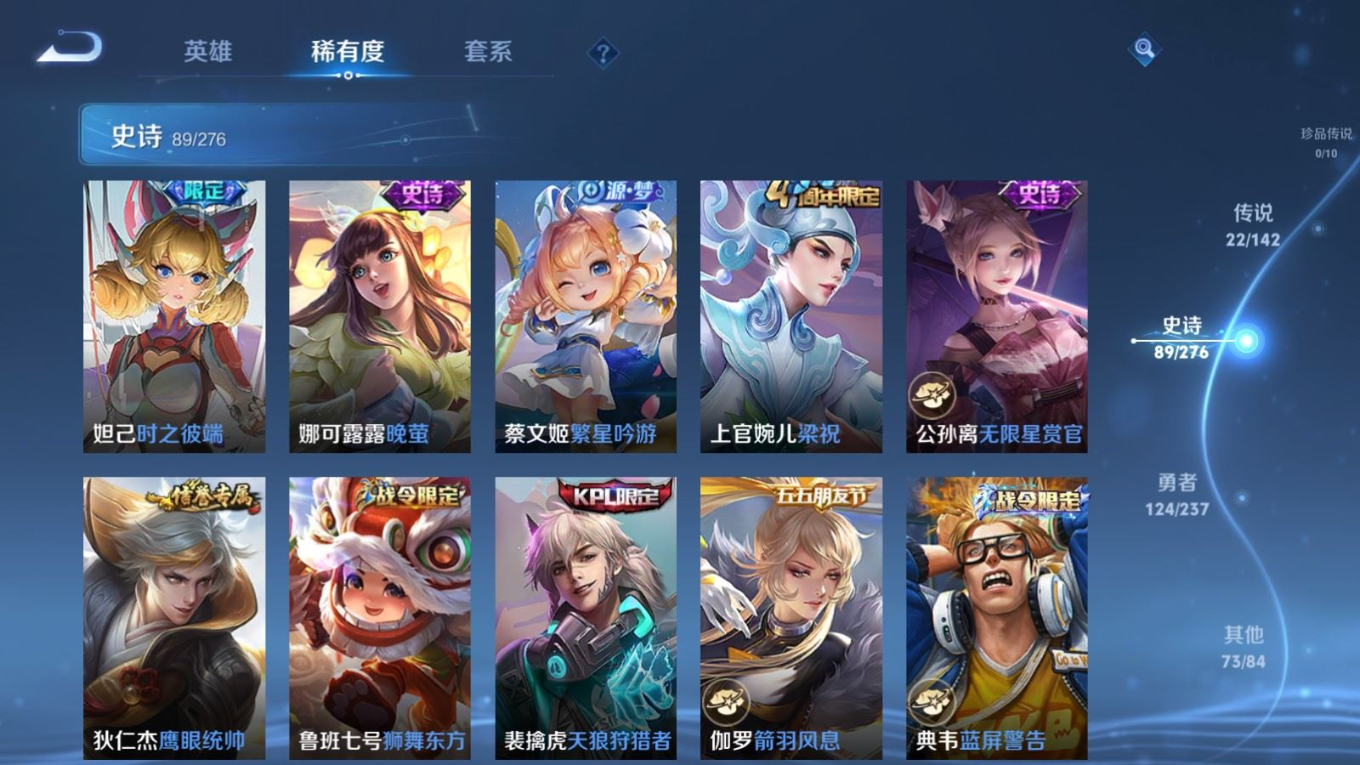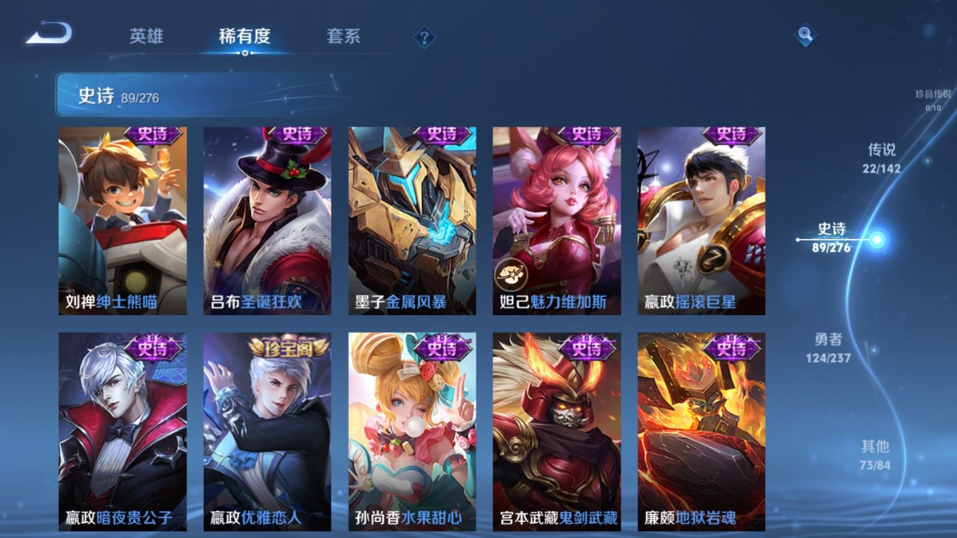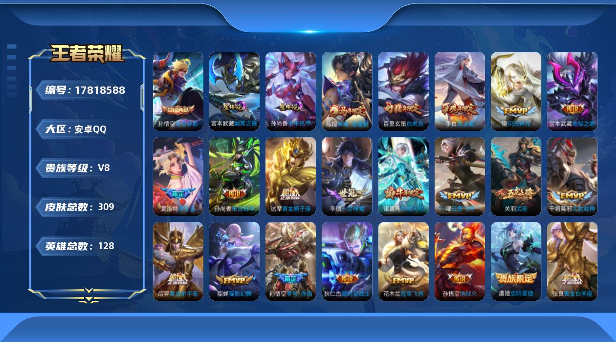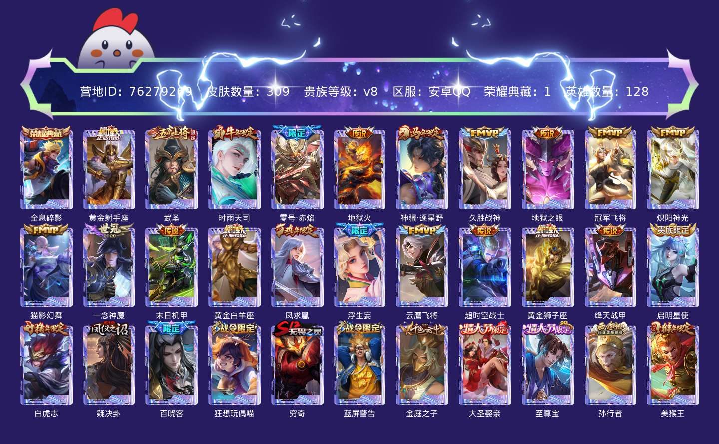 贵族等级:v8皮肤数:309传说品质22 生肖限定6 情人节限定3 荣耀典藏1 英雄数:128