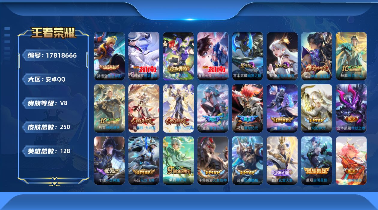 贵族等级:v8皮肤数:250传说品质20 生肖限定4 荣耀典藏1 珍品传说3 英雄数:128