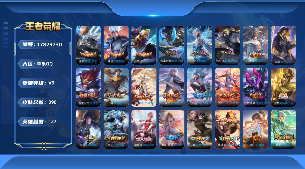 传说品质_后羿_黄金射手座传说品质_娜可露露_前尘镜传说品质_澜_电玩·雷克斯传说品质_澜_愿照·九州拓传说品质_诸葛亮_武陵仙君传说品质_孙悟空_零号·赤焰传说品质_马超_无双飞将传说品质_干将莫邪_画中仙传说品质_宫本武藏_地狱之眼传说品质_周瑜_音你心动传说品质_元歌_诡秘之主传说品质_花木兰_燃星之曲传说品质_貂蝉_猫影幻舞传说品质_李信_一念神魔传说品质_梦奇_胖达荣荣传说品质_桑启_鸣野蒿传说品质_刘备_时之恋人传说品质_橘右京_枫霜尽传说品质_云缨_幻光神枪传说品质_亚瑟_追逃游戏传说品质_李白_凤求凰传说品质_李白_诗剑行传说品质_亚连_落雪白狼传说品质_曜_云鹰飞将传说品质_曜_李逍遥 传说品质_孙策_乘龙·淬吴钩传说品质_狄仁杰_超时空战士传说品质_狄仁杰_神器·狴犴令传说品质_达摩_黄金狮子座传说品质_铠_绛天战甲传说品质_虞姬_启明星使传说品质_百里玄策_白虎志传说品质_韩信_踏浪归传说品质_赵云_淬星耀世传说品质_裴擒虎_祥瑞亨通
