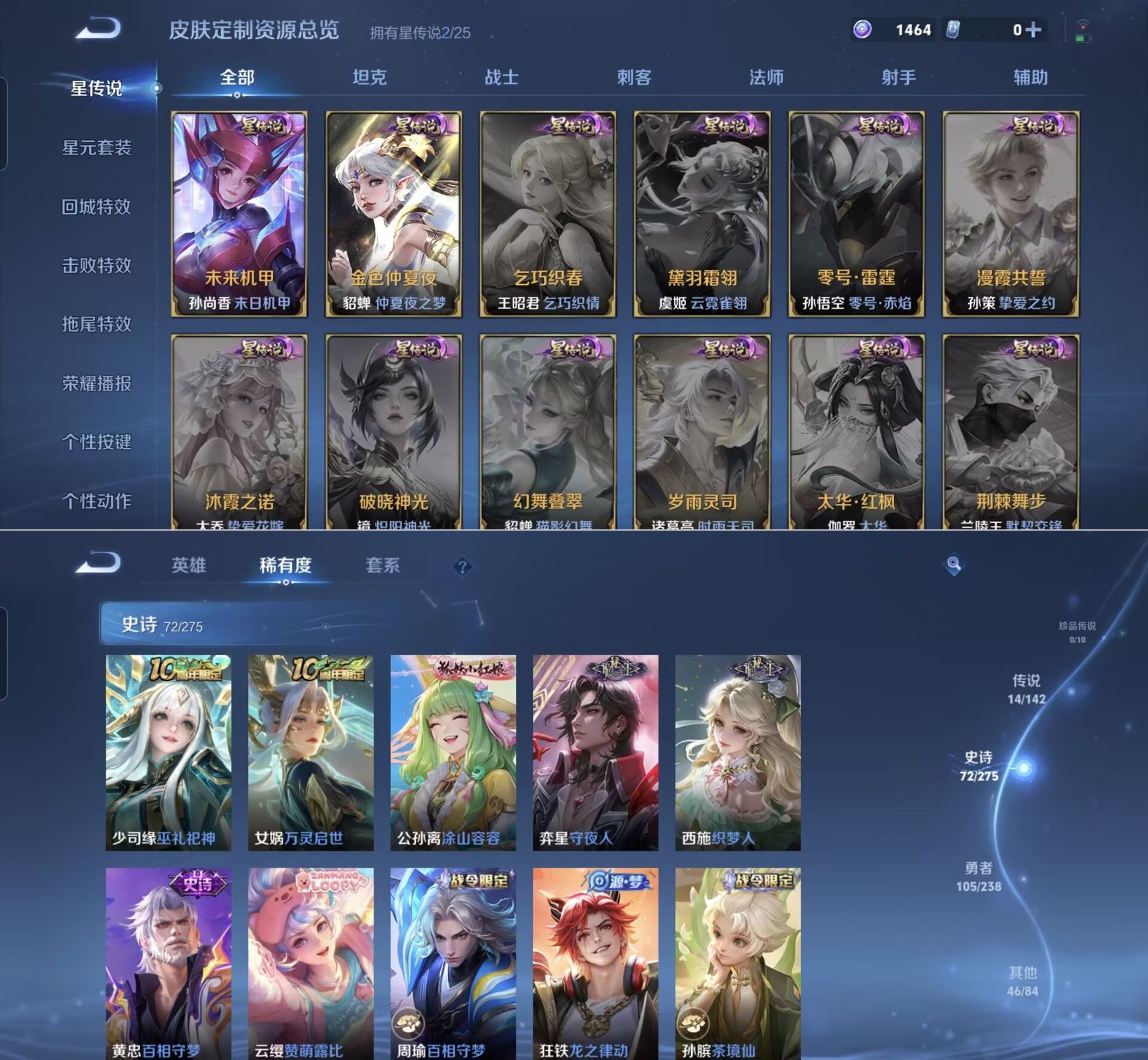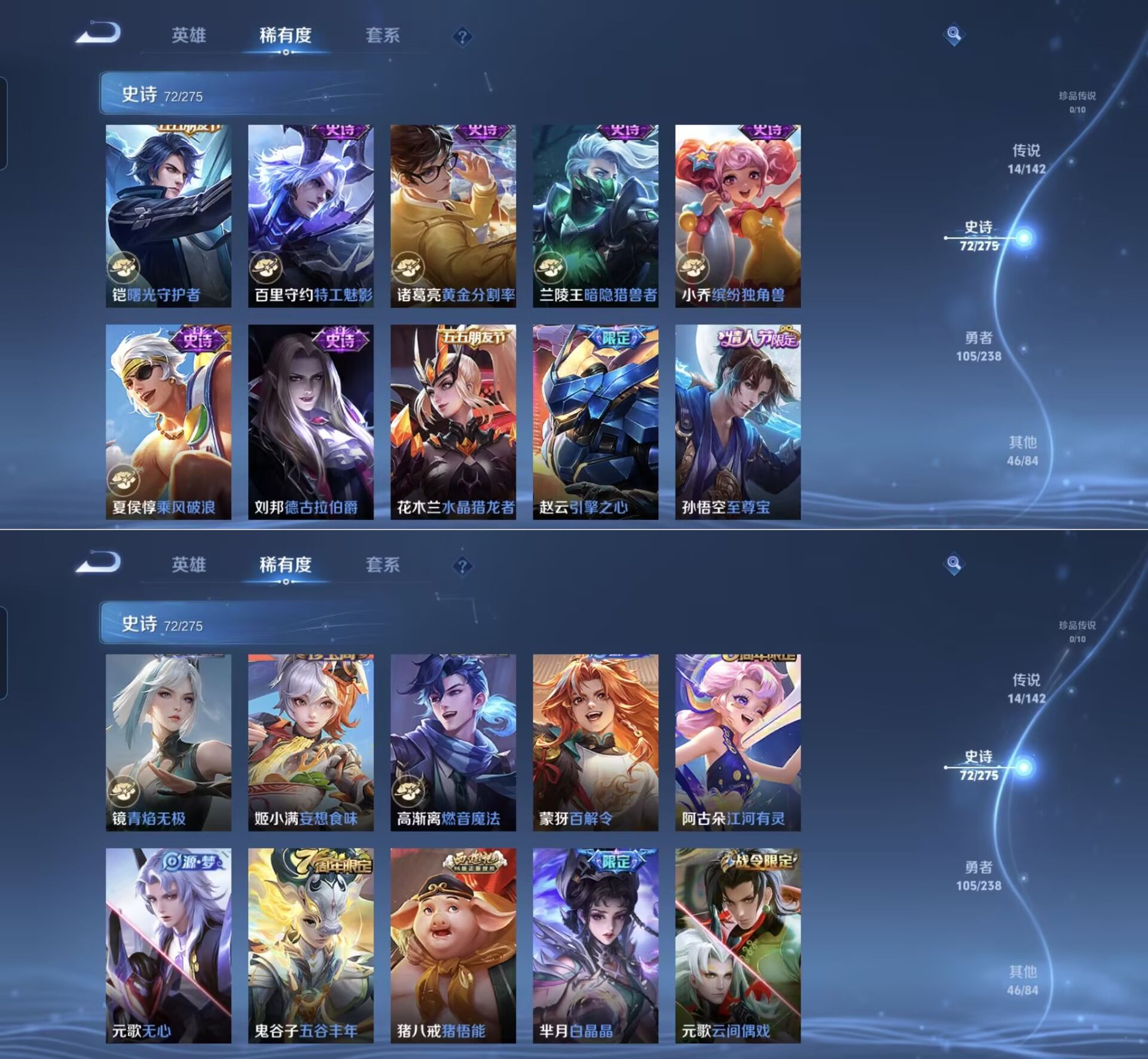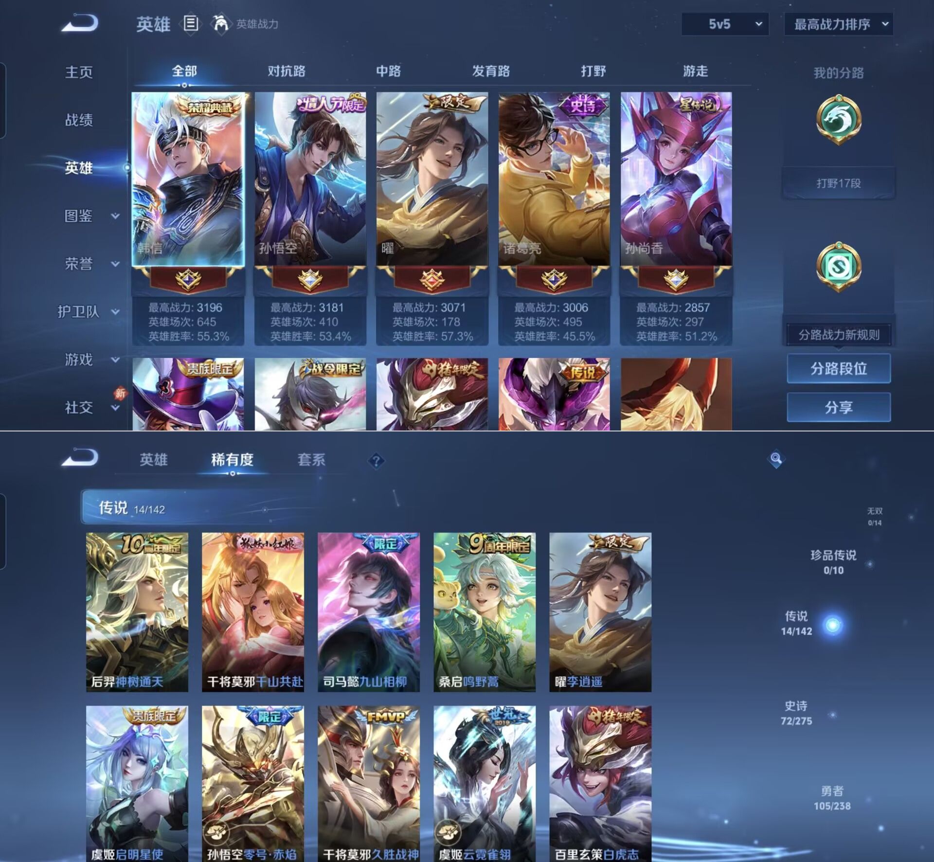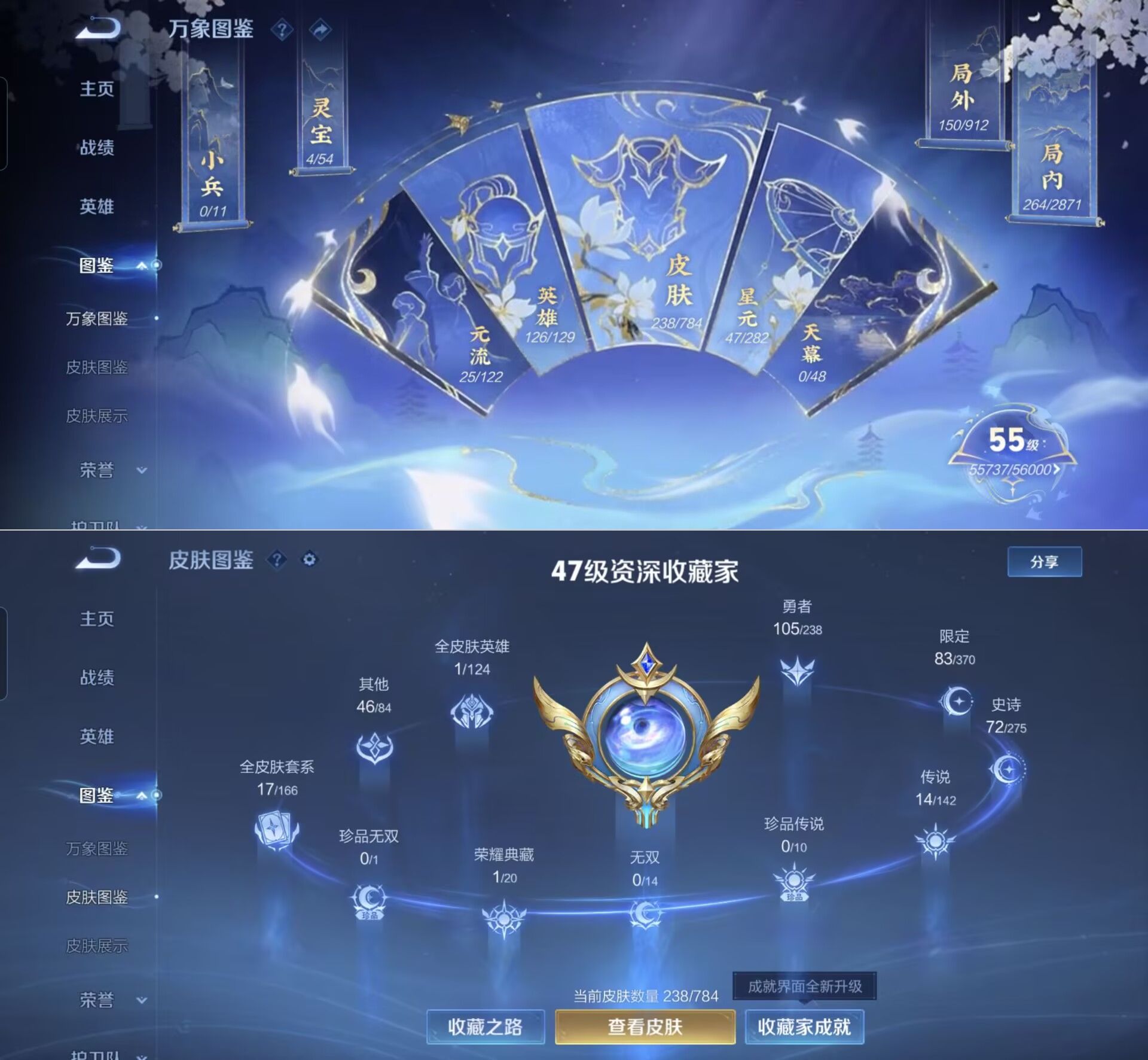贵族等级:v8皮肤数:238传说品质14 情人节限定2 生肖限定1 荣耀典藏1 英雄数:126