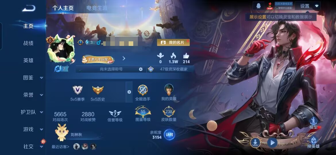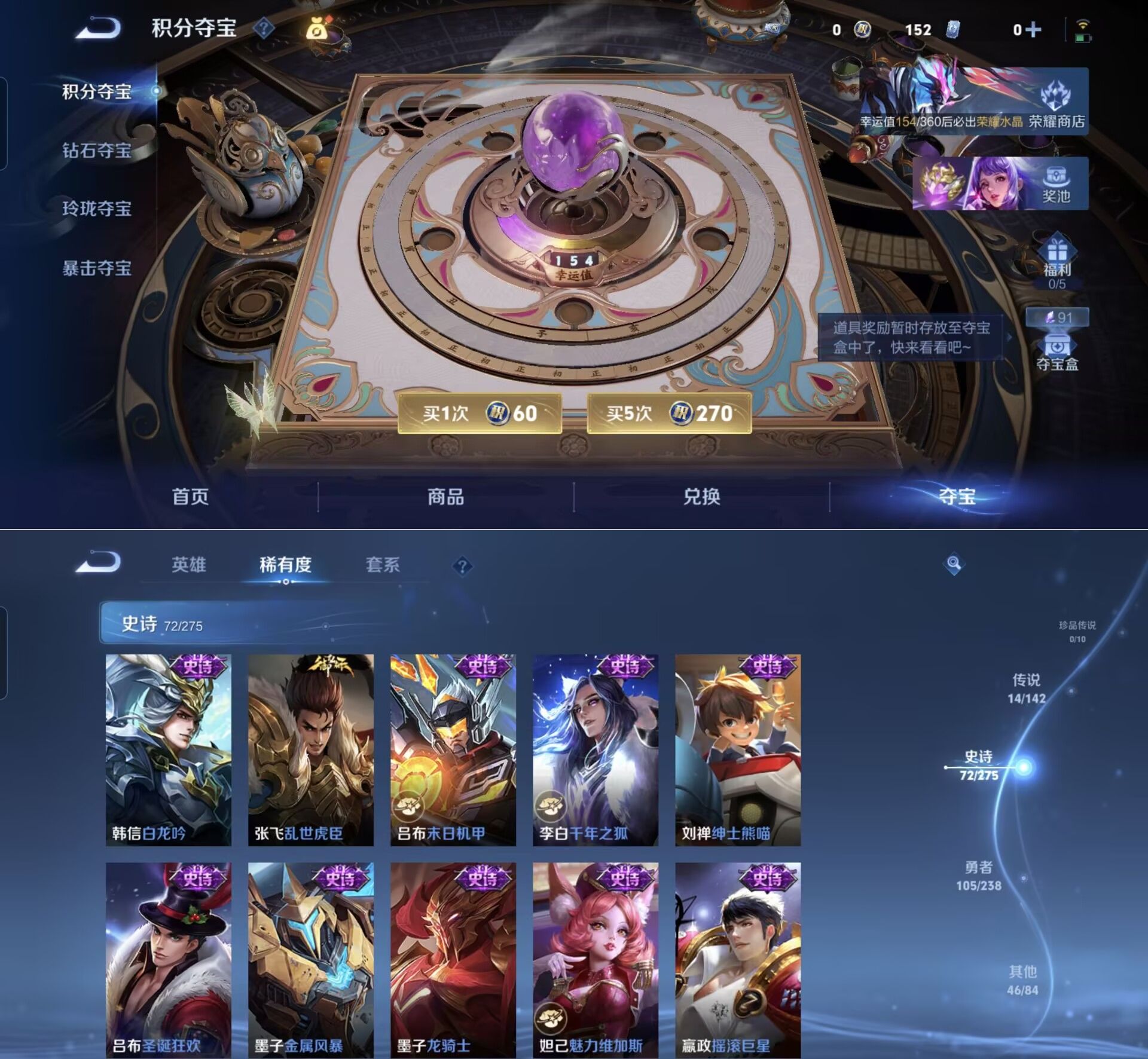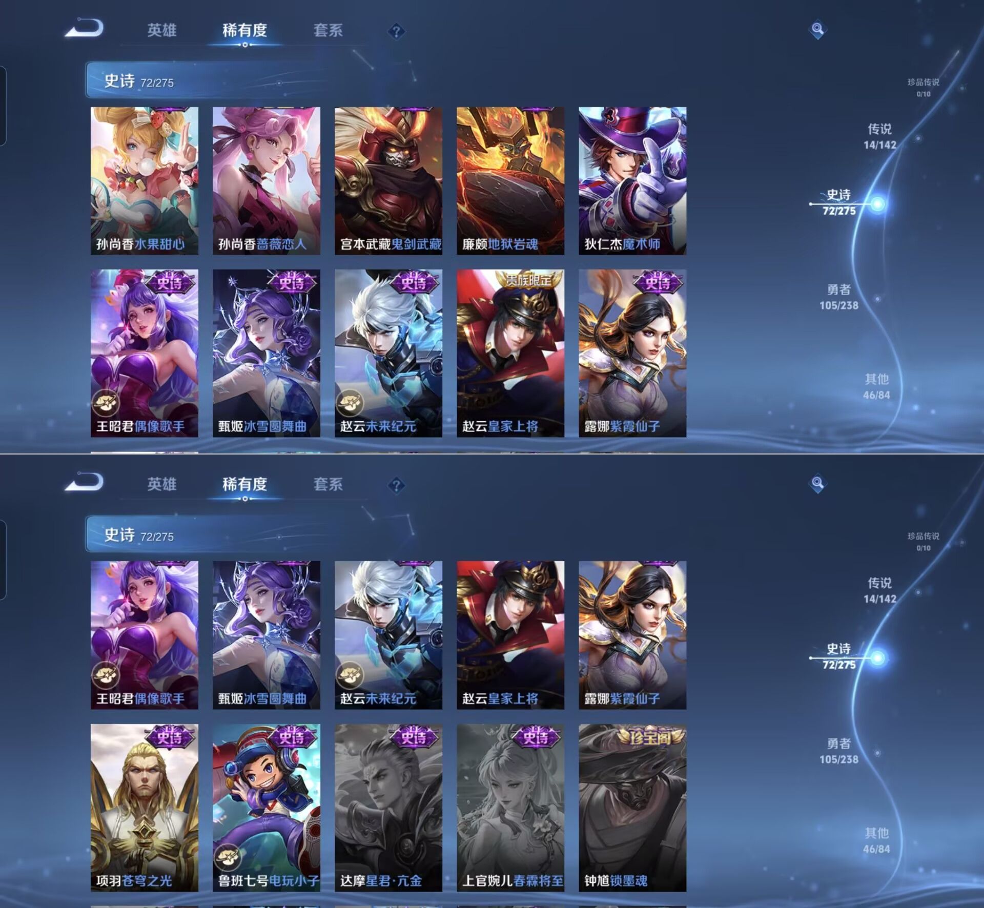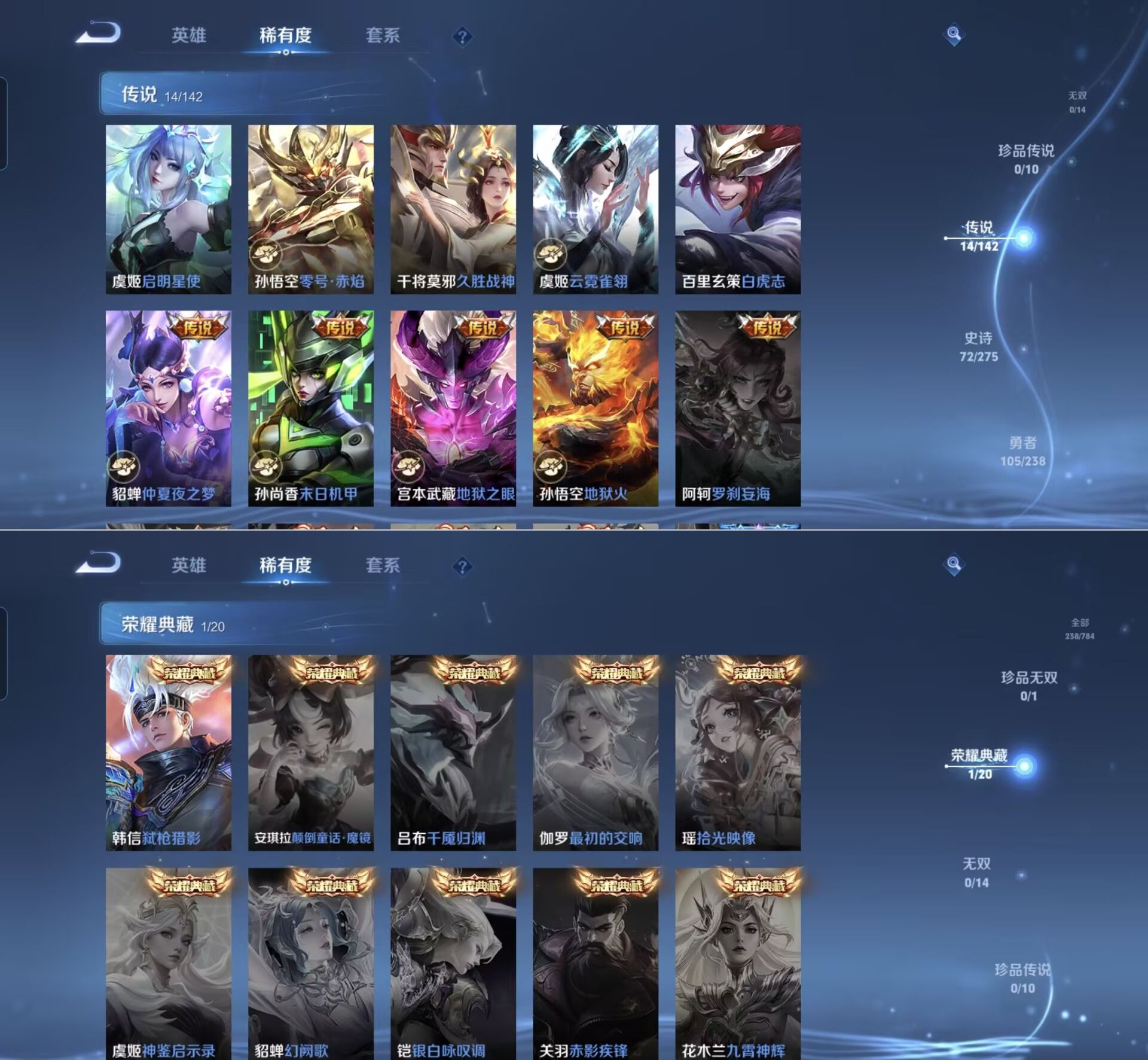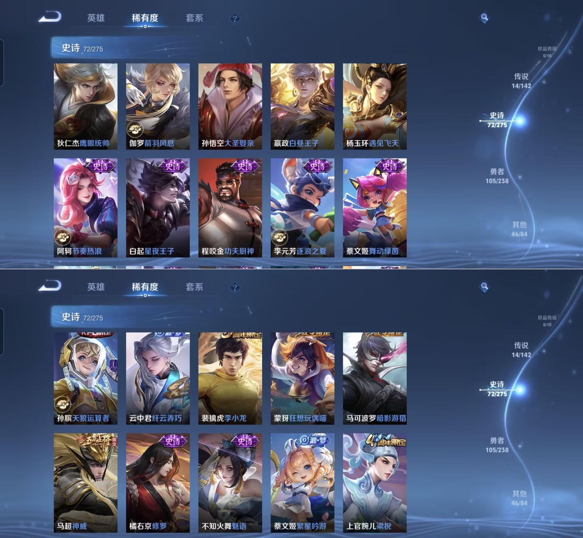 贵族等级:v8皮肤数:238传说品质14 情人节限定2 生肖限定1 荣耀典藏1 英雄数:126