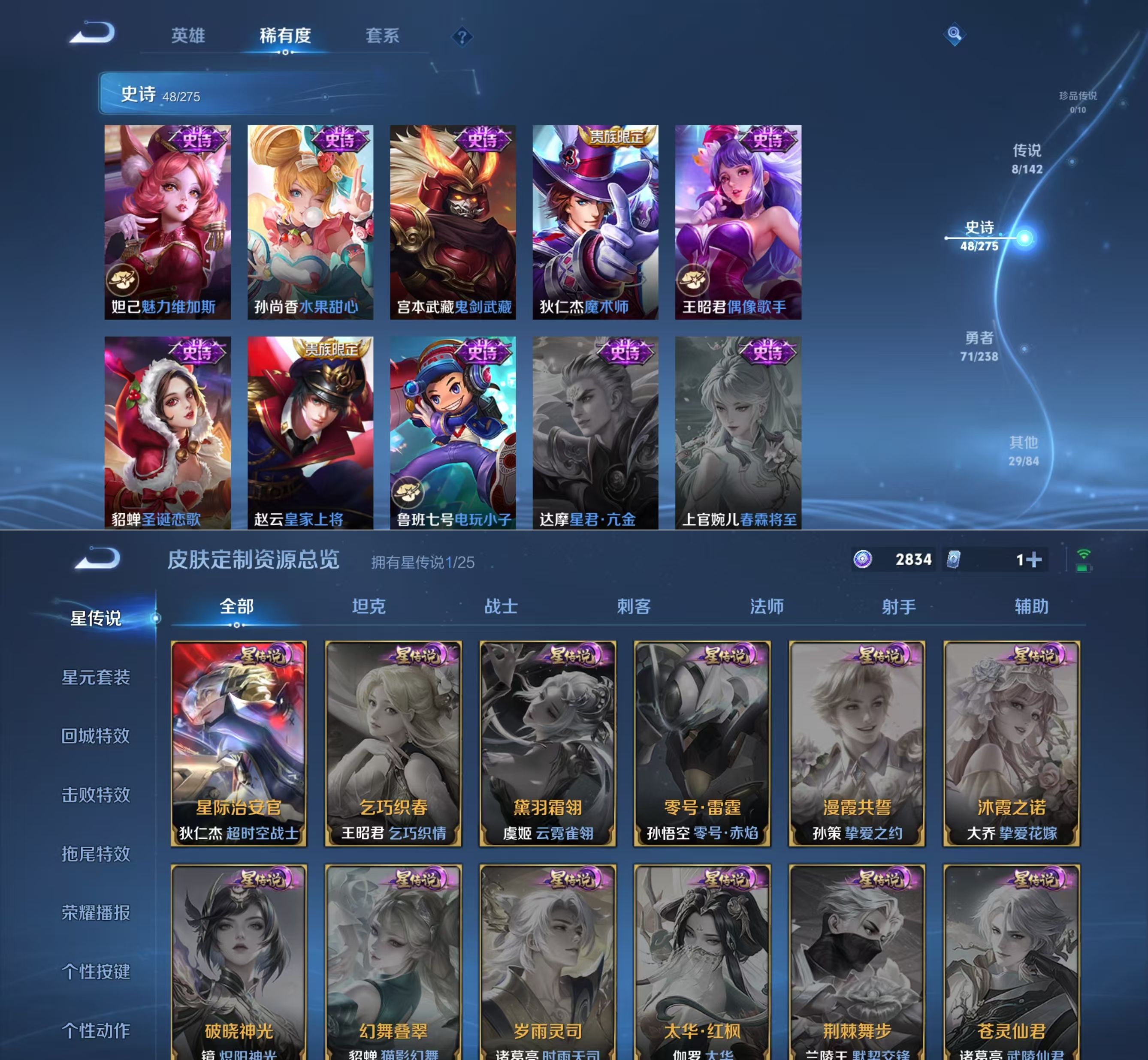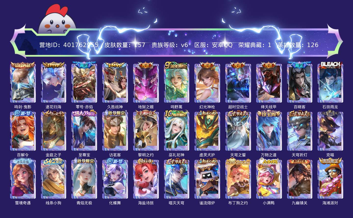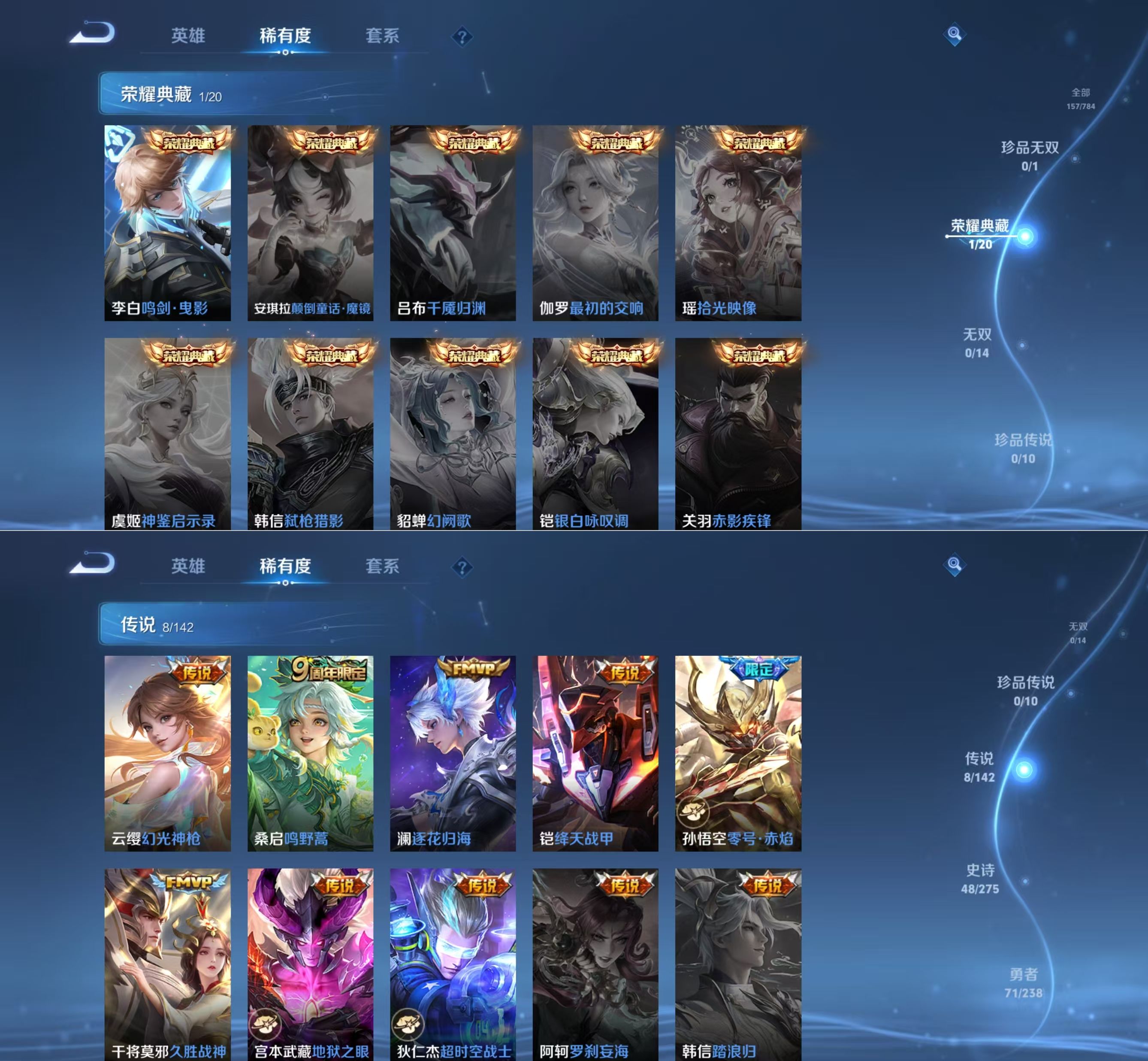 贵族等级:v6皮肤数:157传说品质8 情人节限定1 荣耀典藏1 英雄数:126