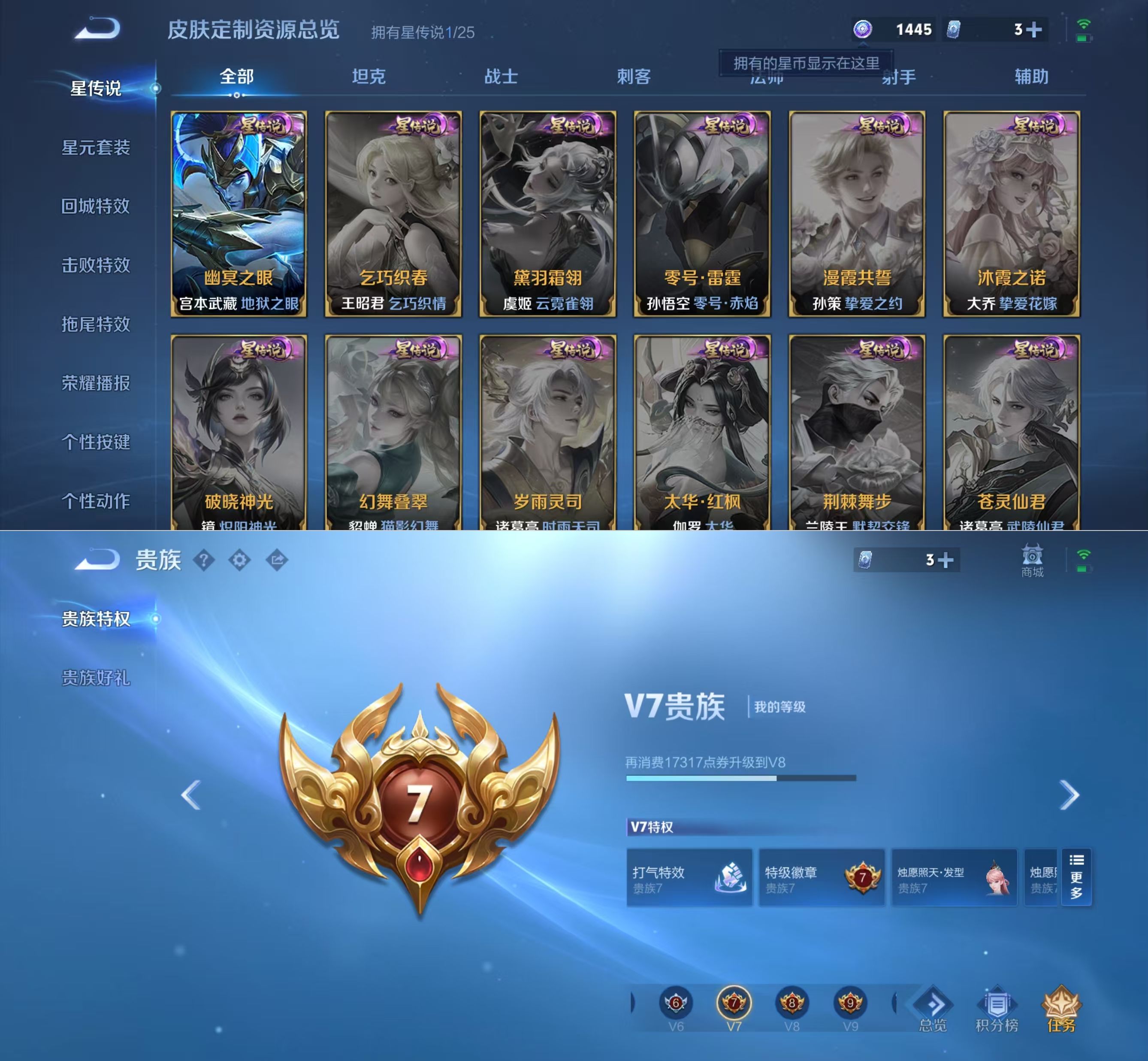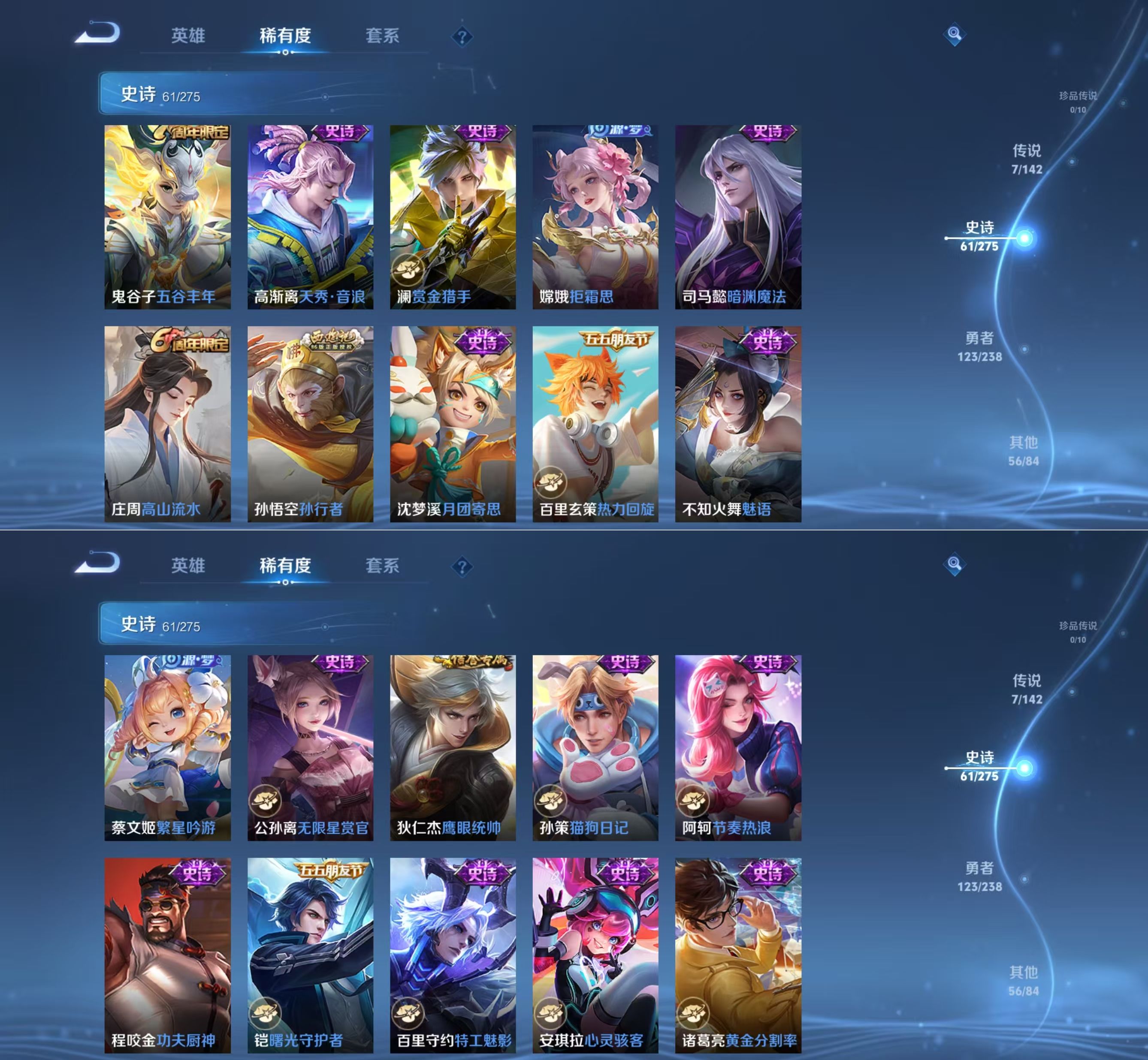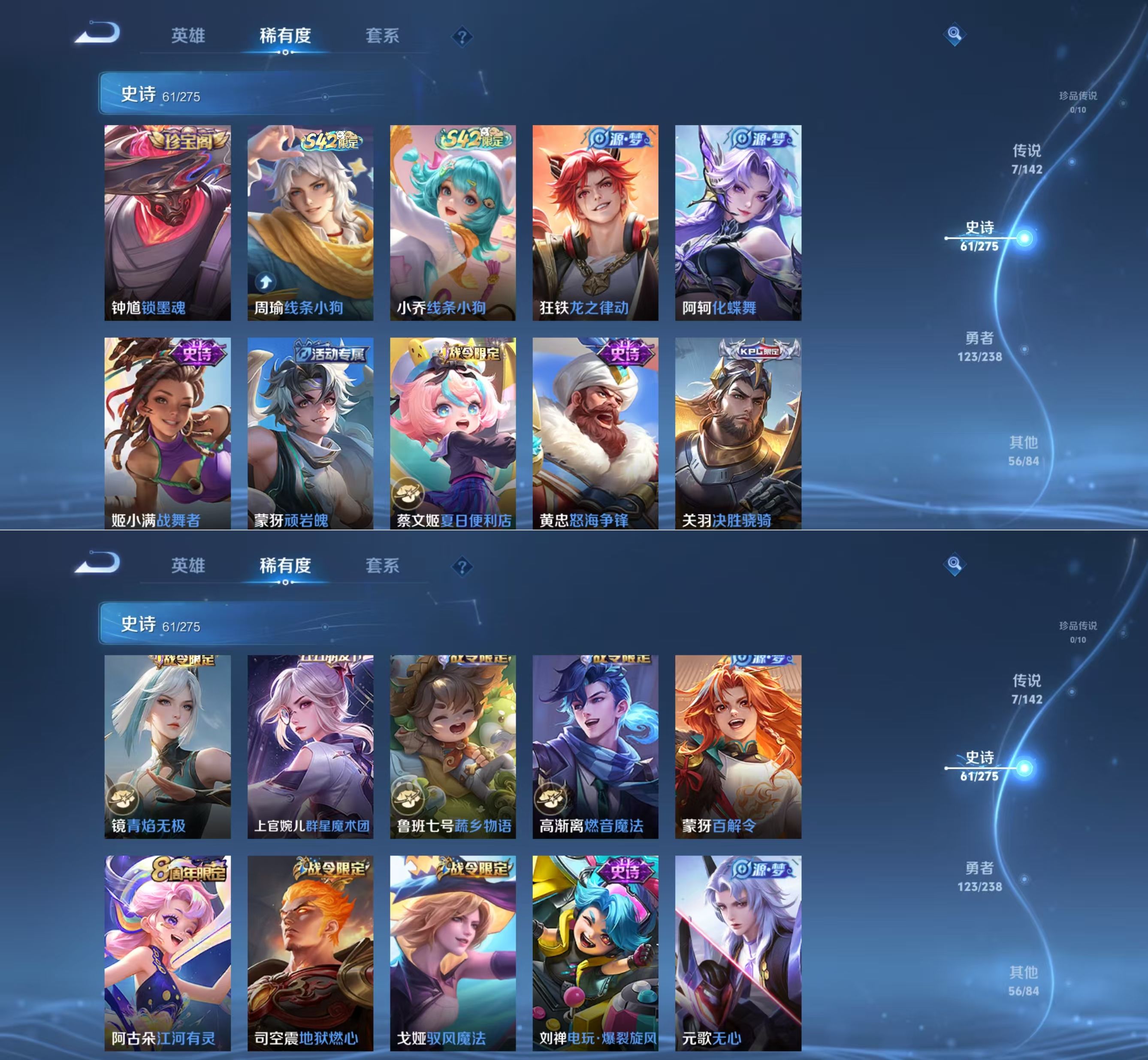 贵族等级:v7皮肤数:248传说品质7 荣耀典藏1 英雄数:128
