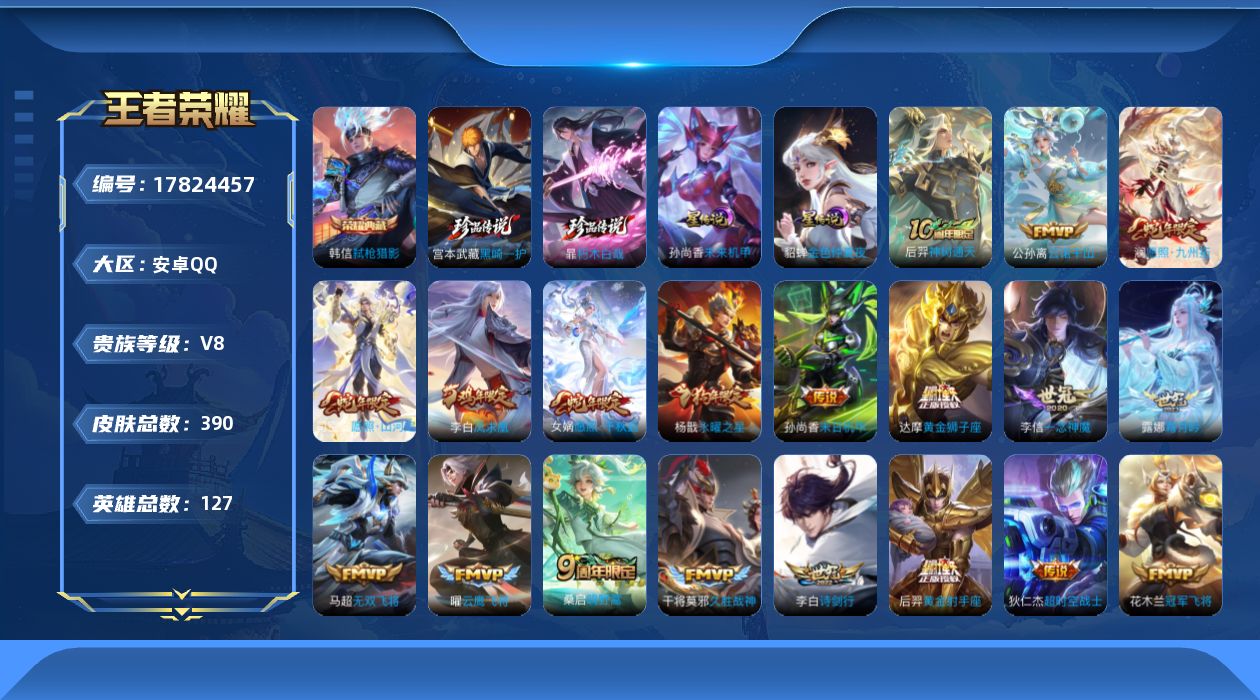 贵族等级:v8皮肤数:390传说品质22 生肖限定5 情人节限定2 珍品传说2 荣耀典藏1 英雄数:127